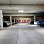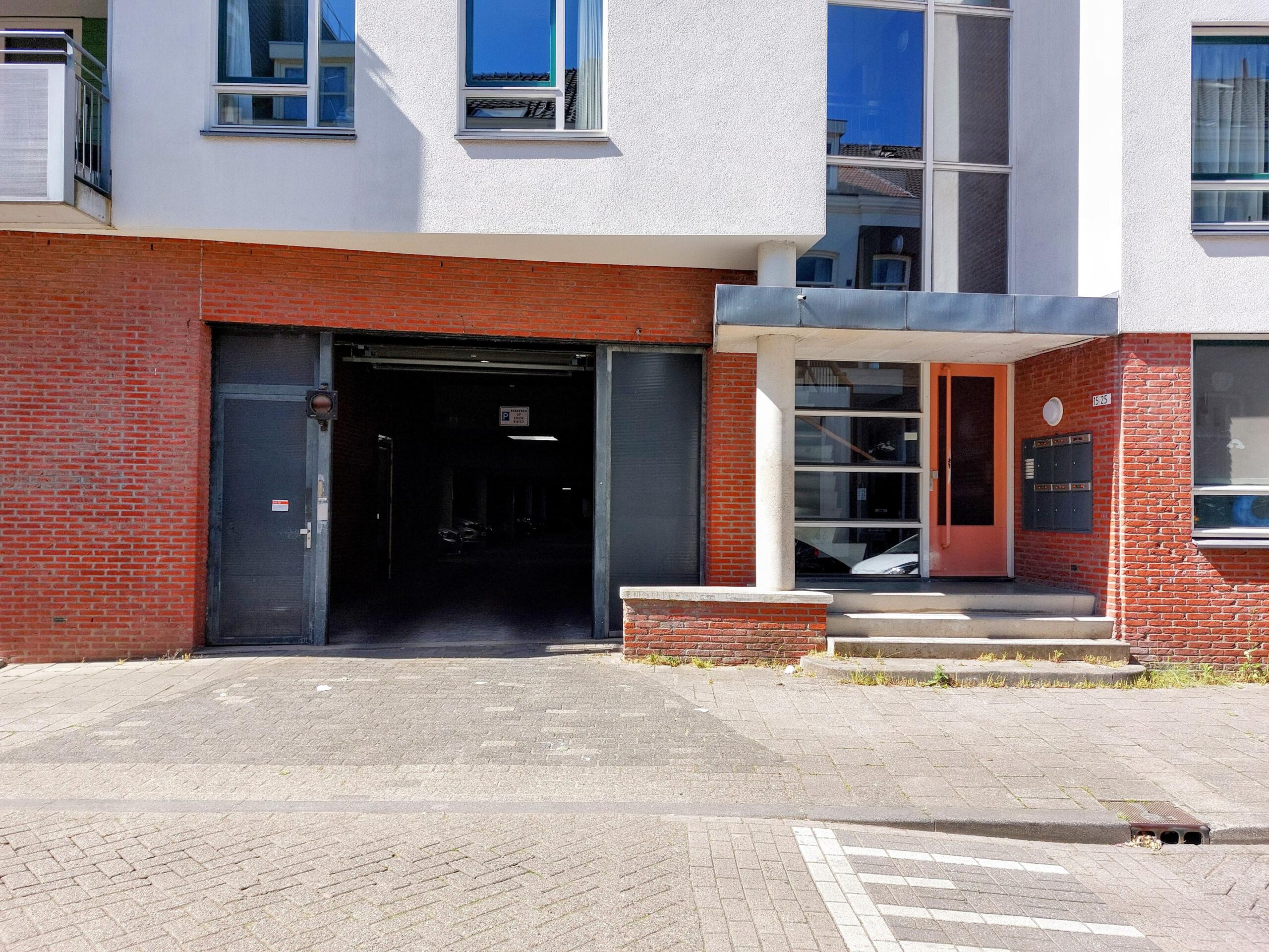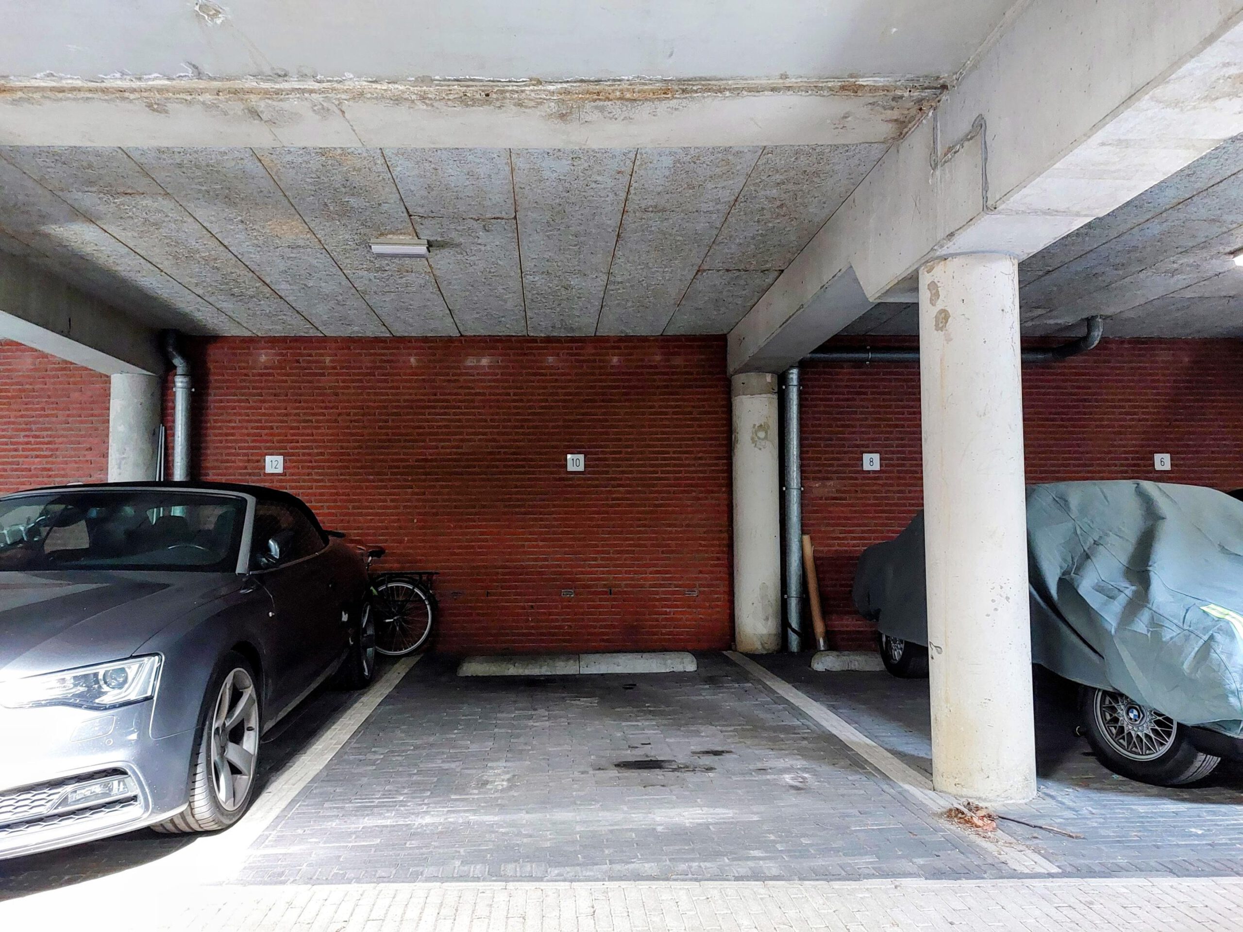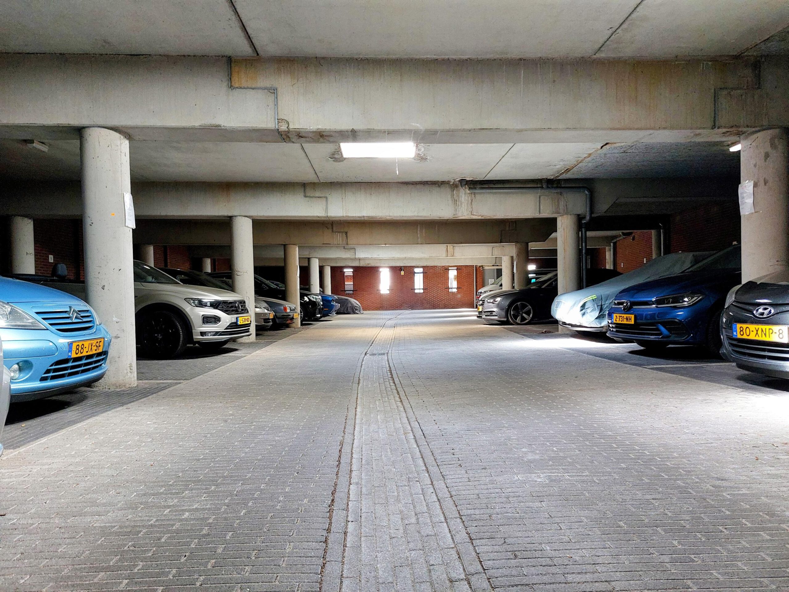 Parkeerplaats in de parkeergarage gelegen aan de Driekoningendwarsstraat. Deze parkeergarage is voorzien van een elektrische deur en ziet er netjes uit.