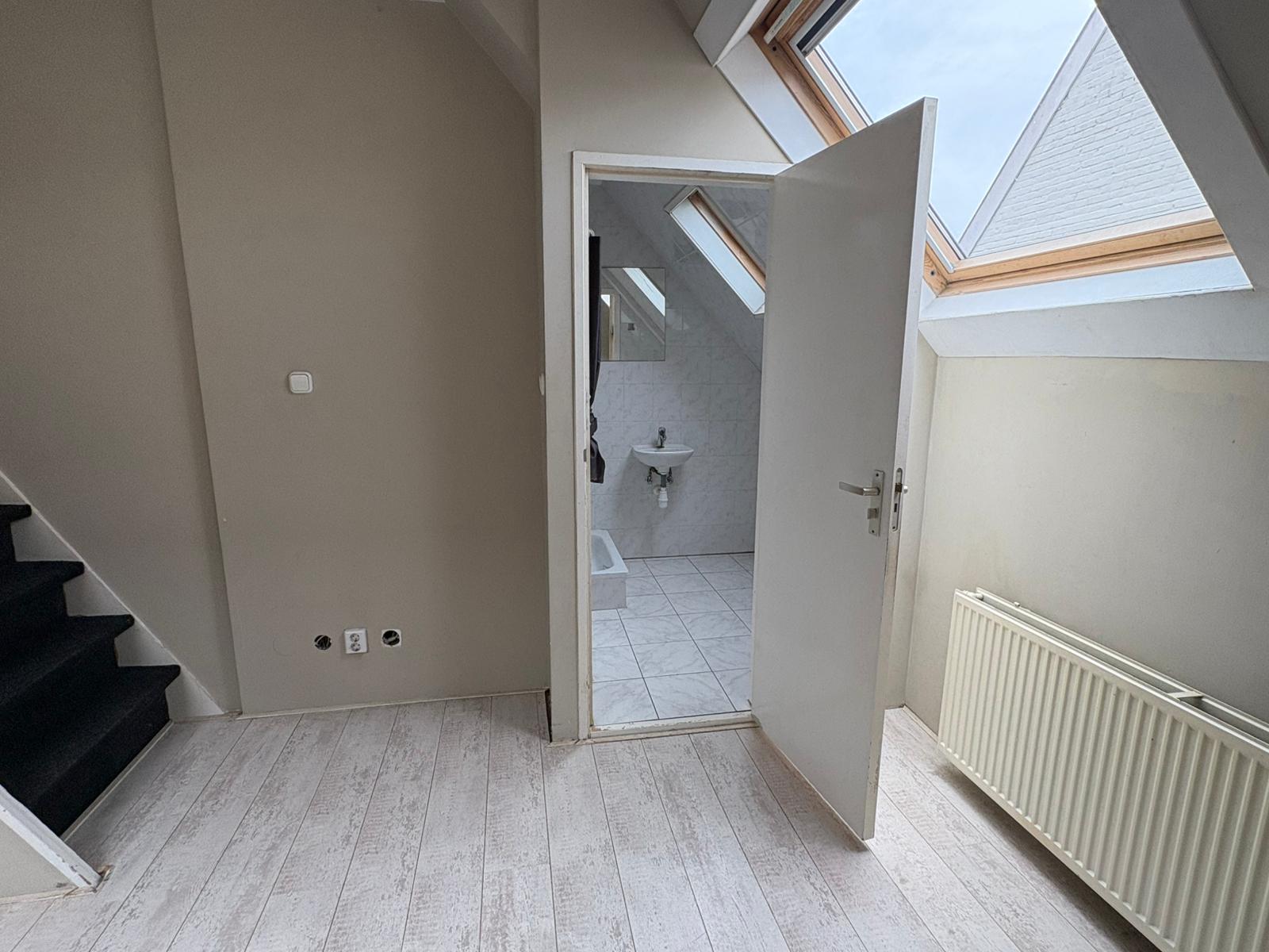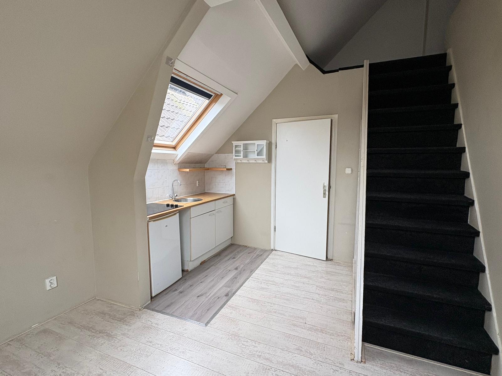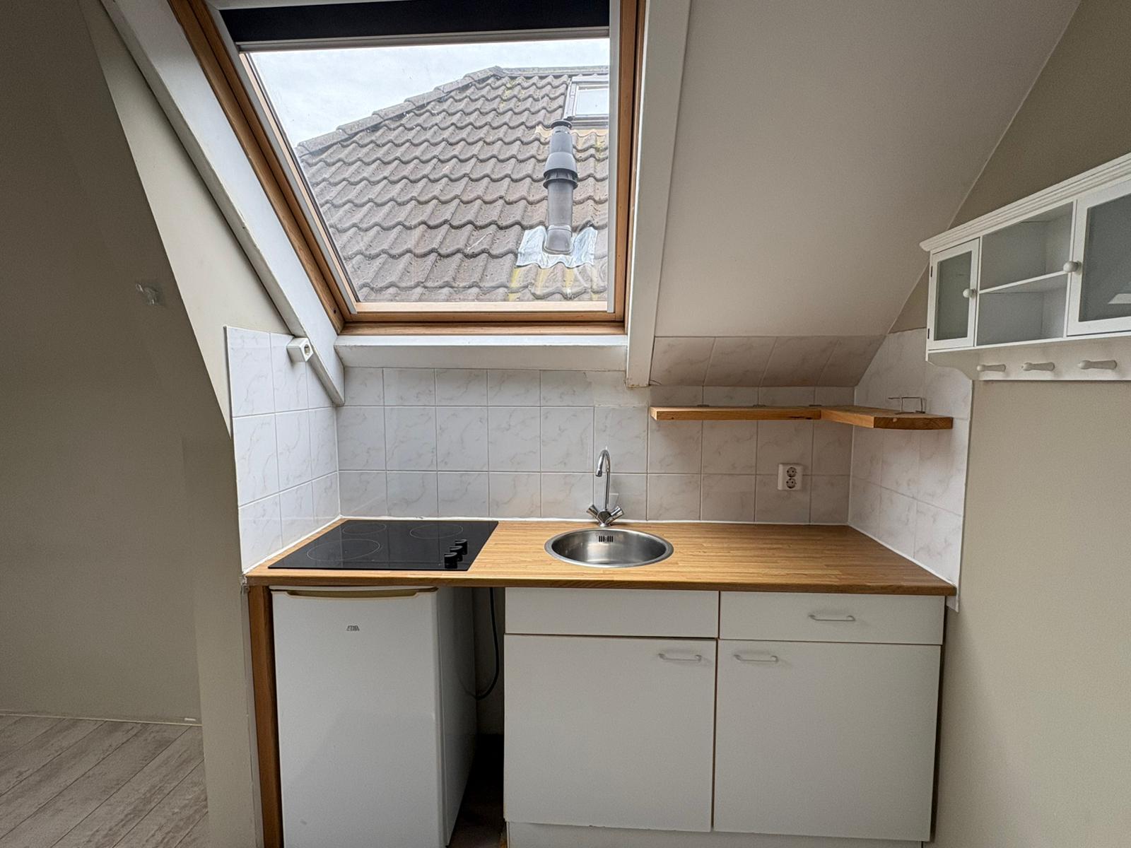 Deze is de woning slim en efficiënt ingedeeld. De woonkamer met keuken vormt het hart van de ruimte. De open keuken is compact maar functioneel en ideaal voor dagelijks gebruik. Via de trap bereik je de slaapvide. Deze is volledig uitgerust met douche, wastafel en toilet.