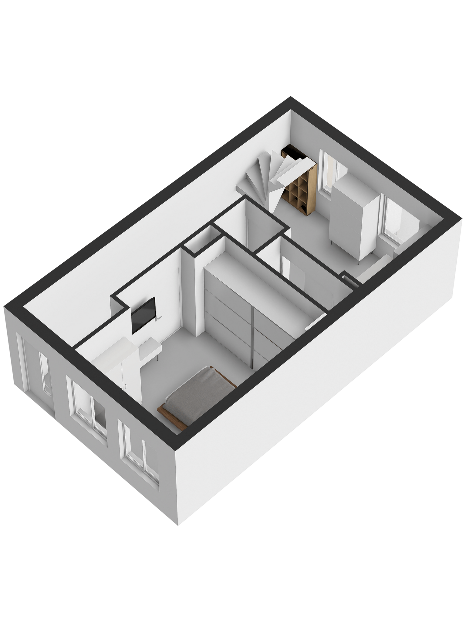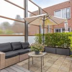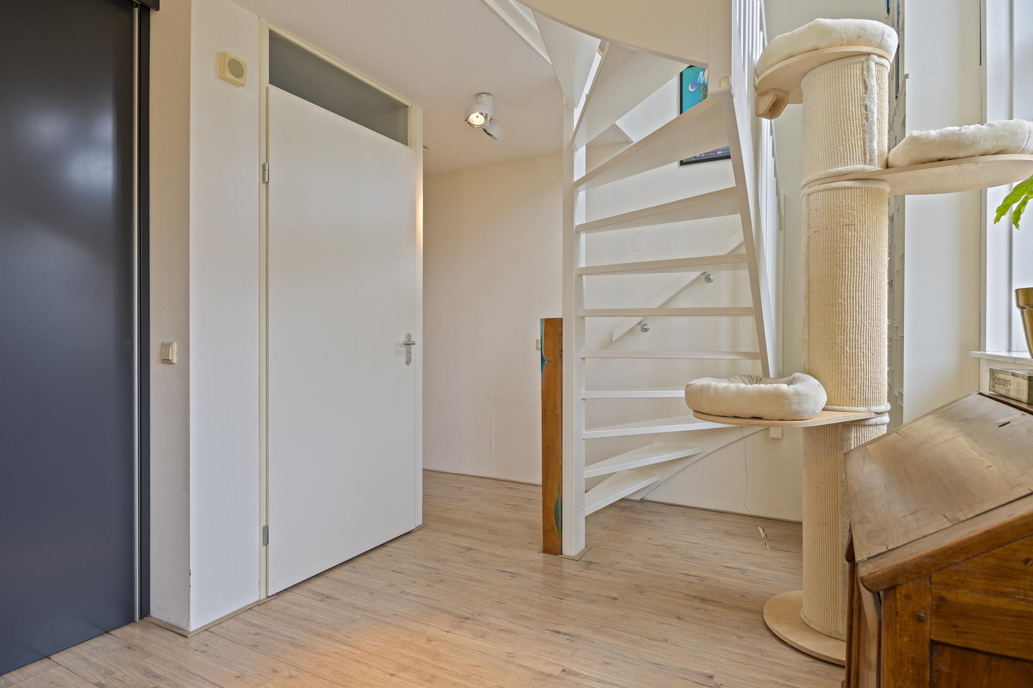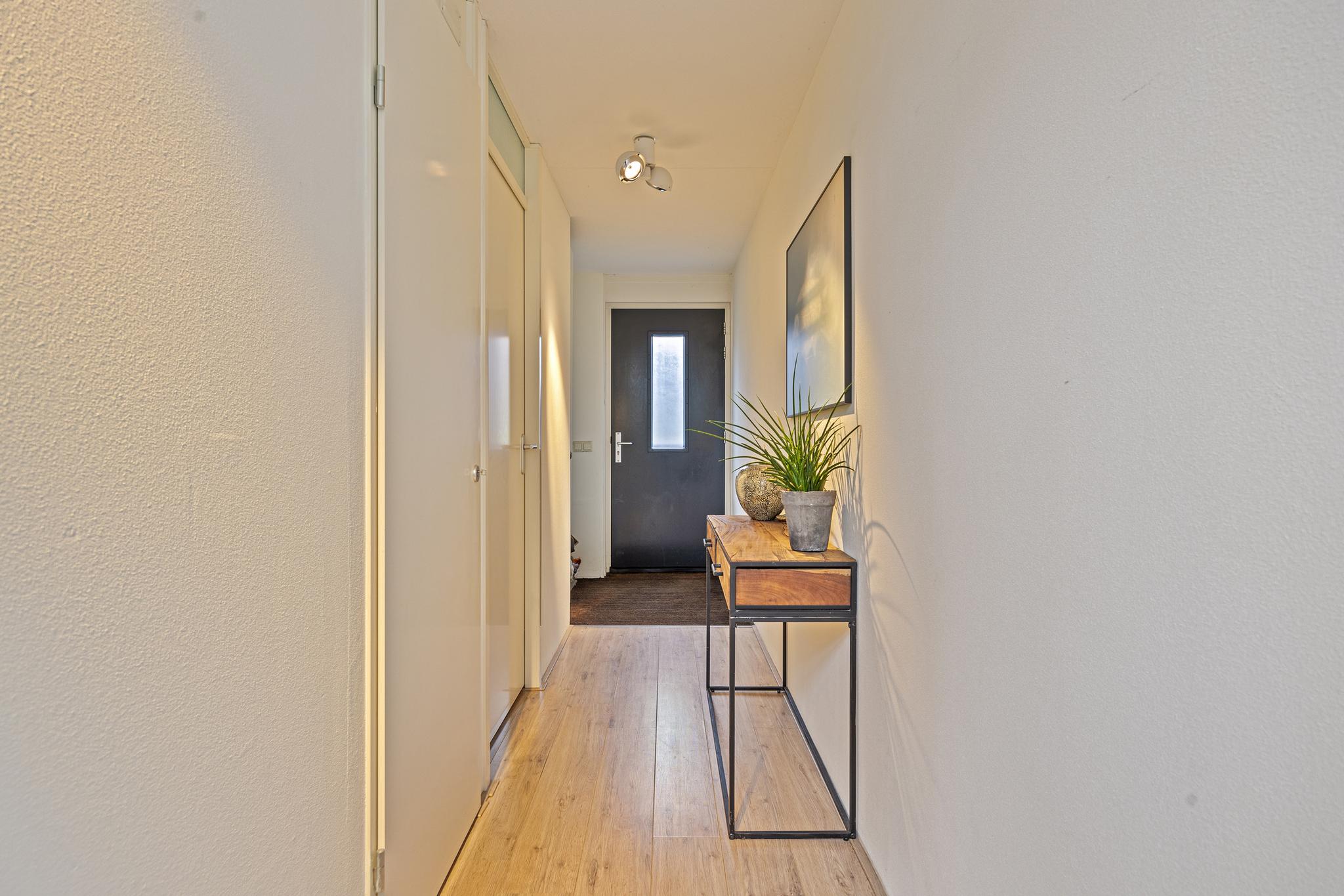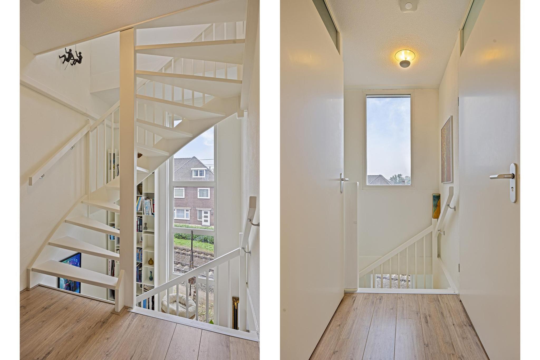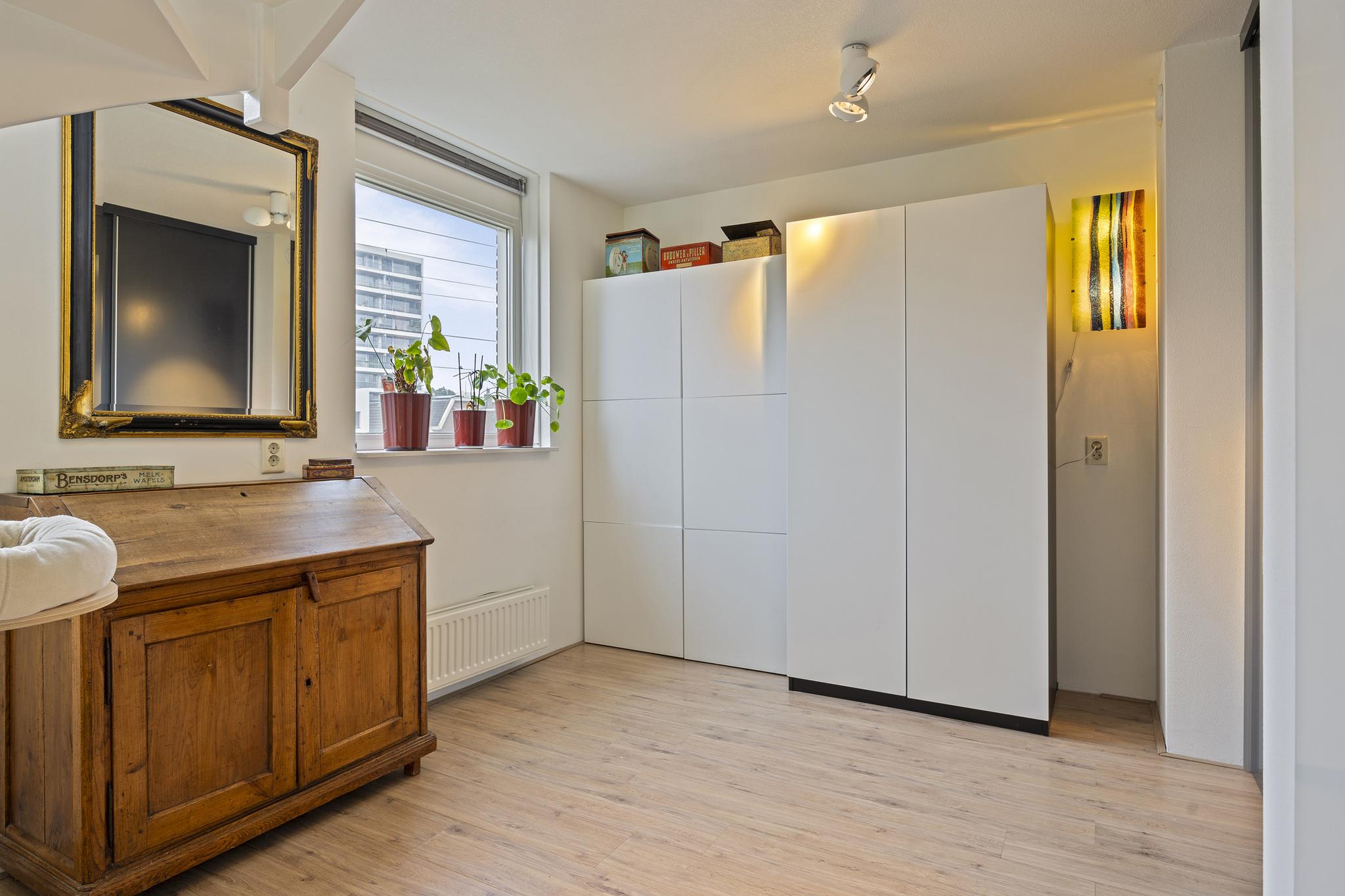 Eerste verdieping: via het terras waar het heerlijk toeven is kom je bij de entree van de woning, ruime hal die toegang geeft tot de eerste slaapkamer met grote kast, hiernaast het toilet, trapopgang en een praktische werkhoek. Achter de schuifdeur tref je de wasmachine en is er nog bergruimte voor wat spullen.