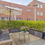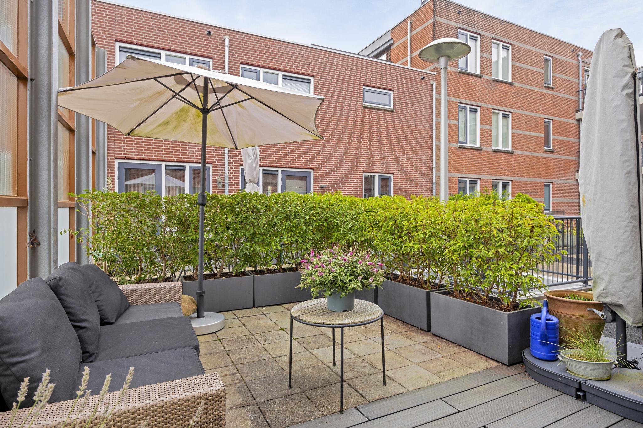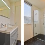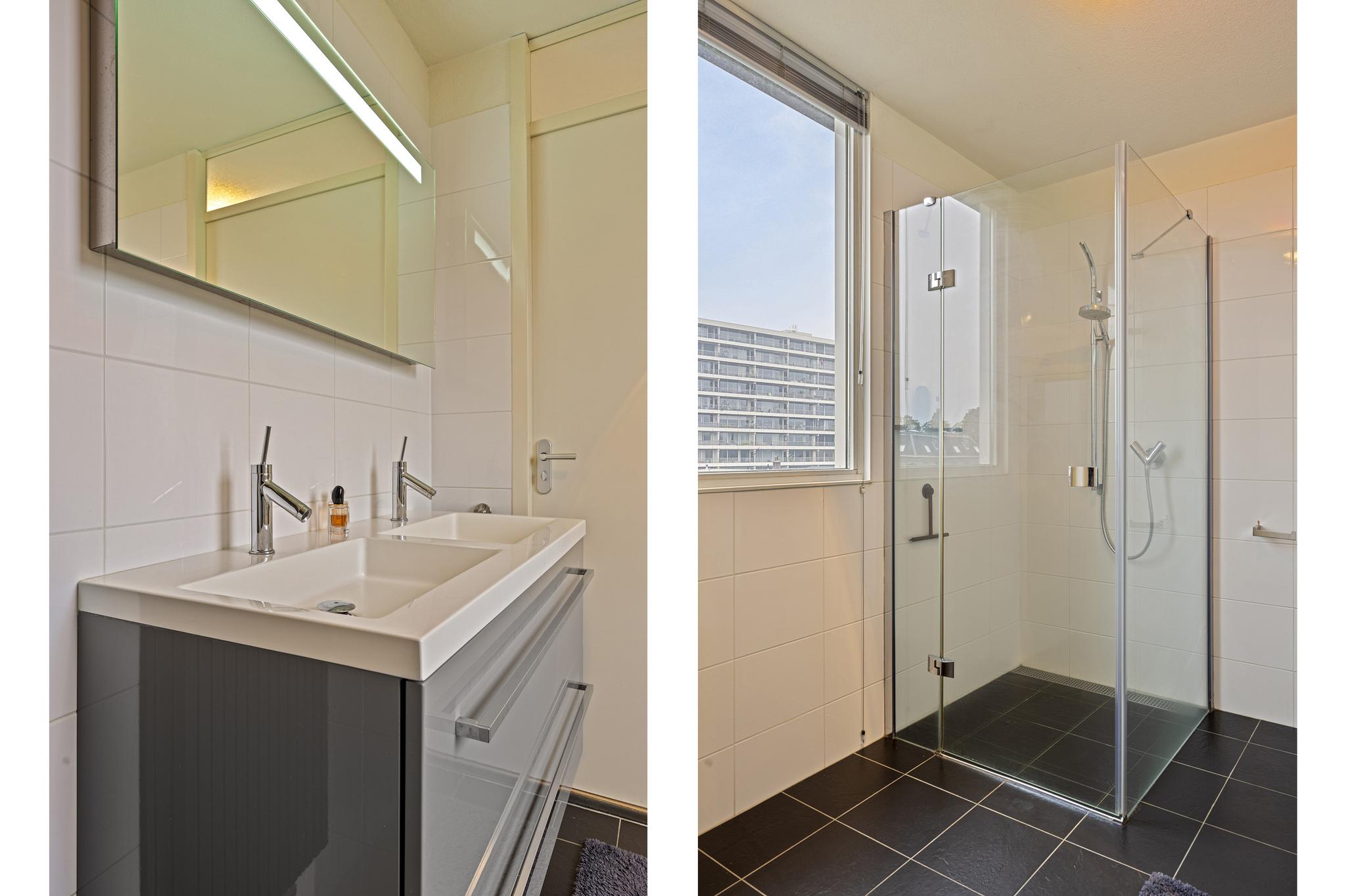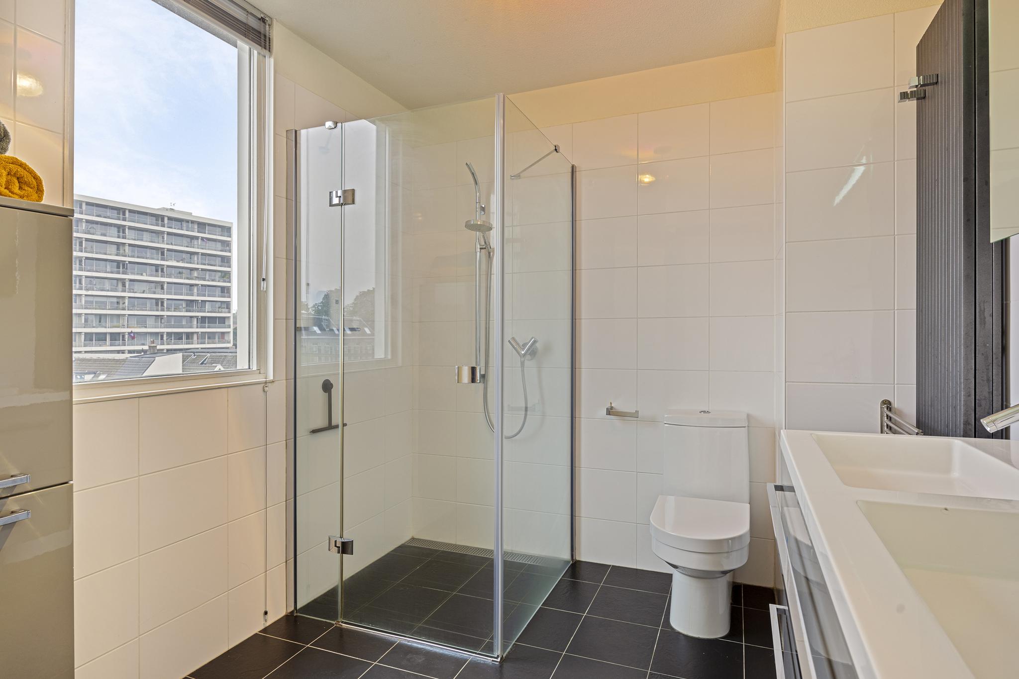 Derde verdieping: Overloop, bergkast met cv-opstelling, luxe badkamer met douche, dubbel wastafelmeubel, toilet, designradiator, ruime slaapkamer met terras op het zuiden.