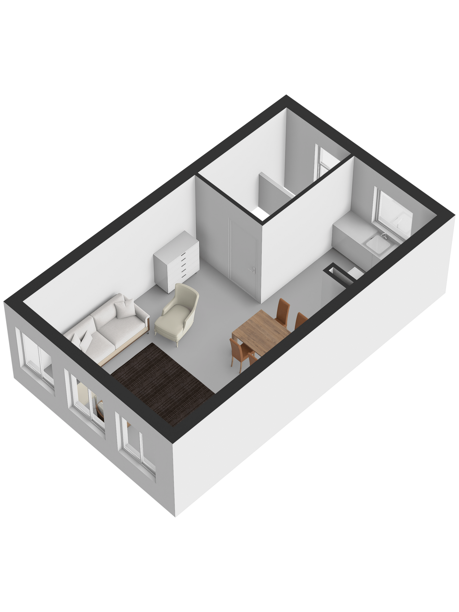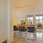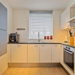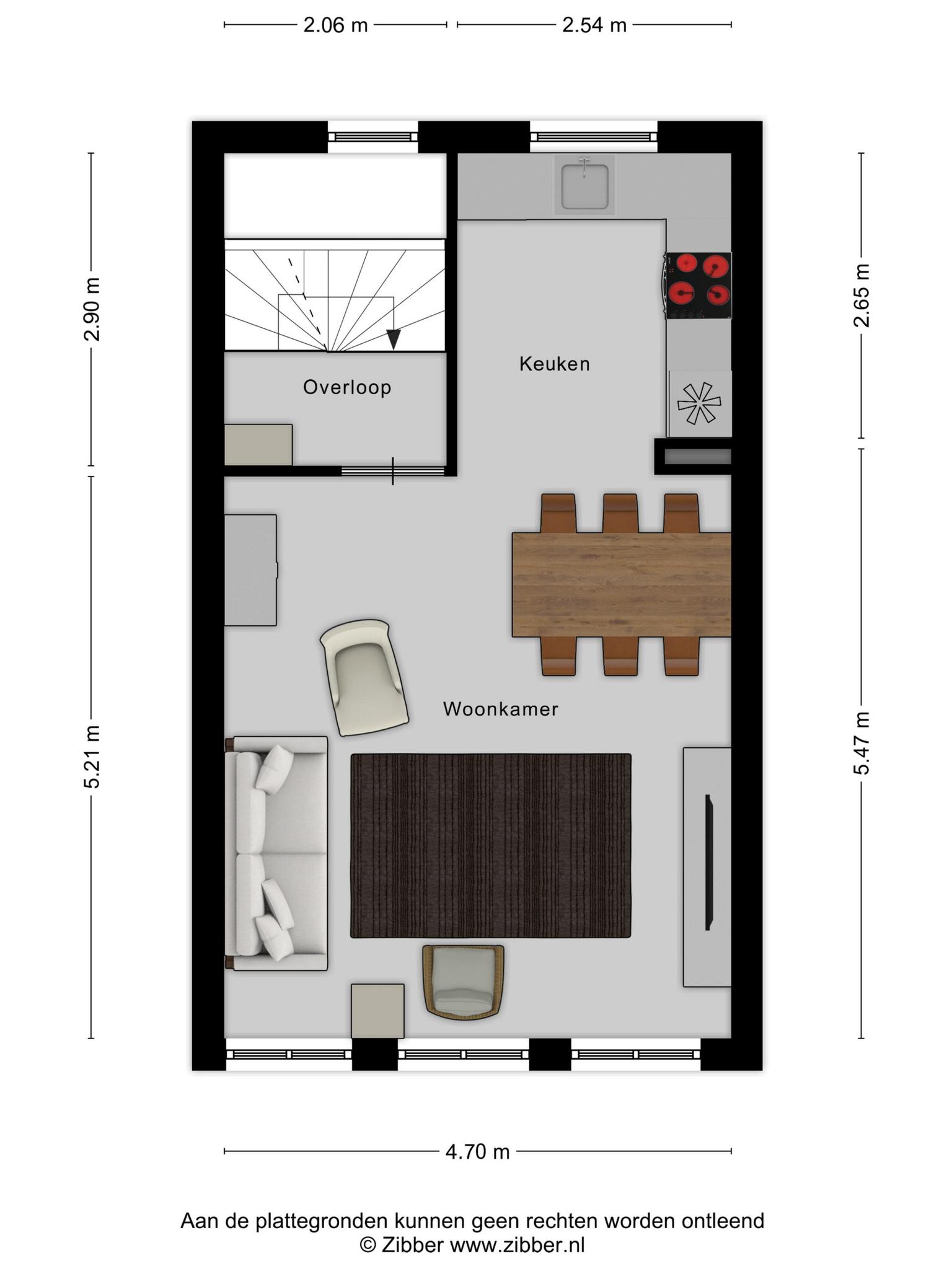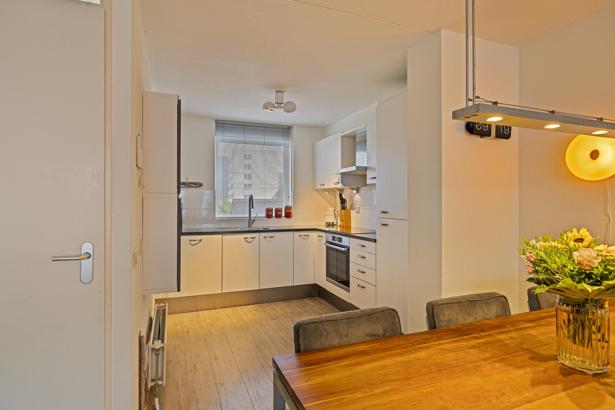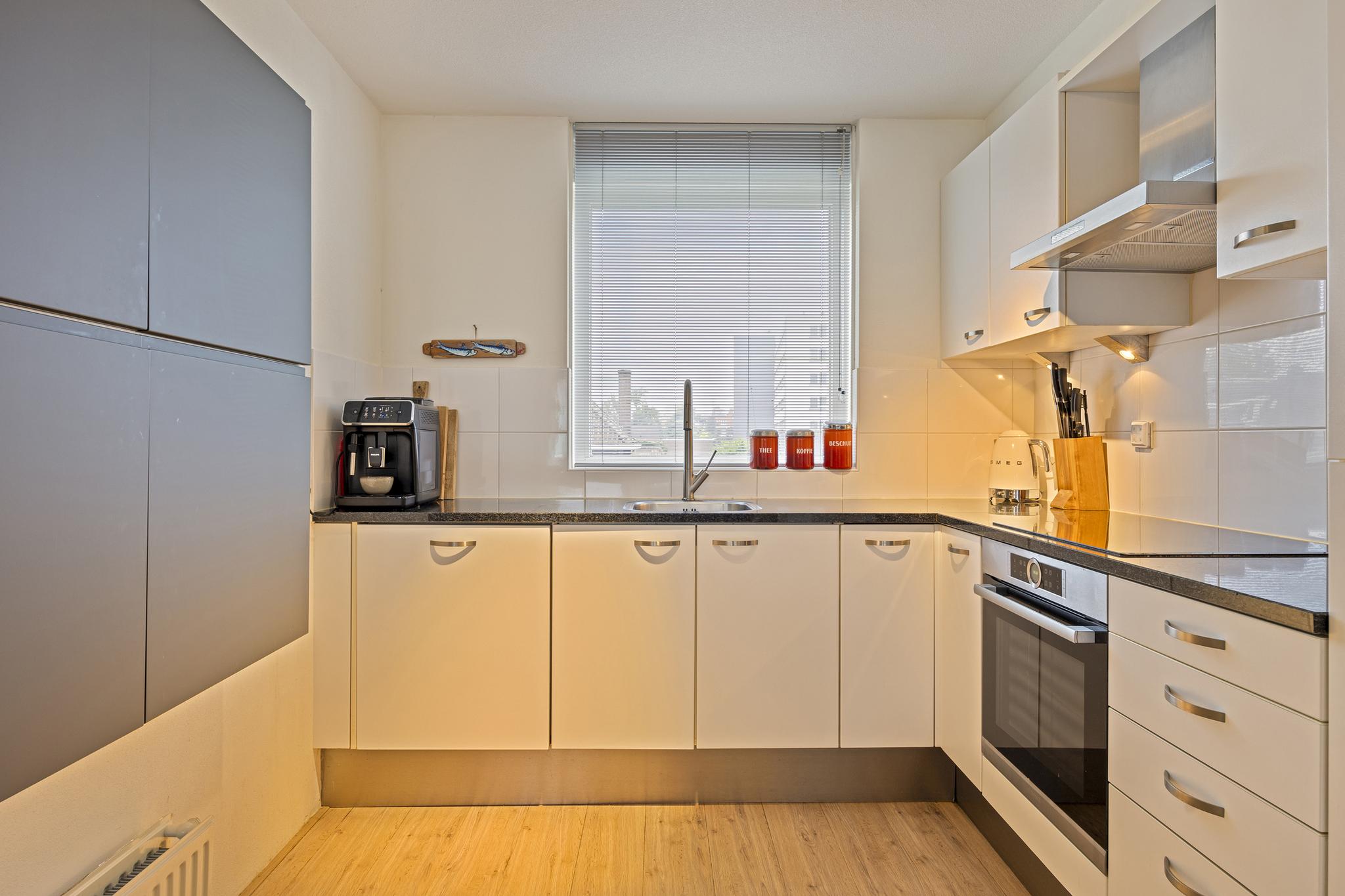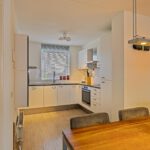 Tweede verdieping: Overloop met toegang naar de ruime woonkamer met open keuken die voorzien is van alle benodigde apparatuur.