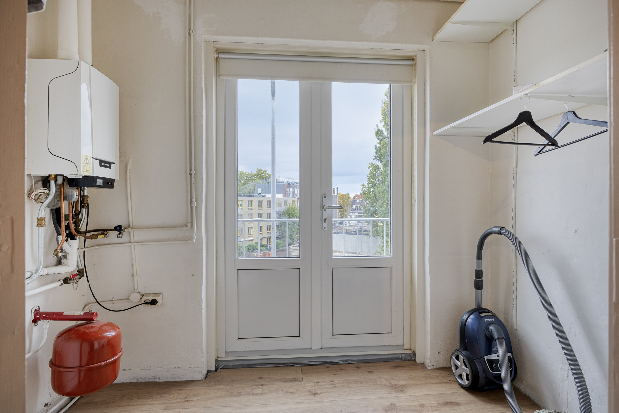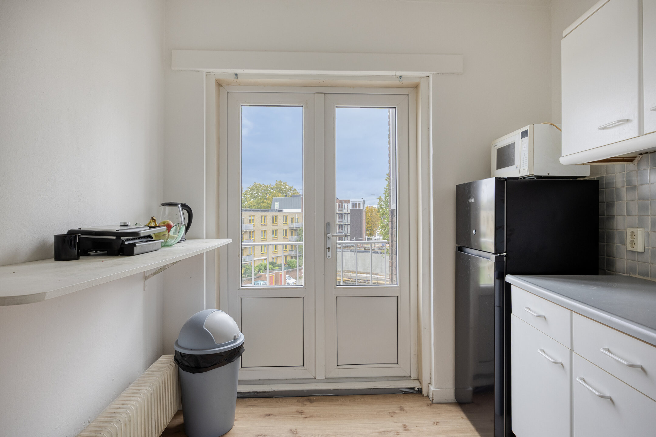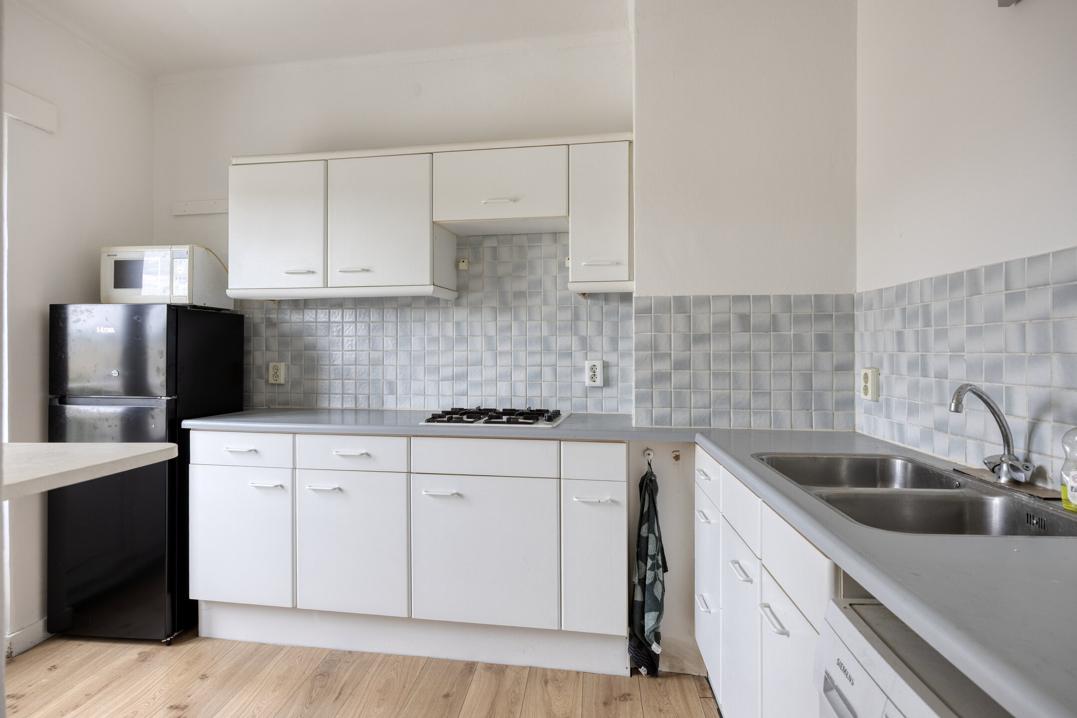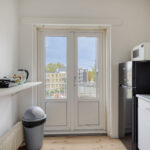 De royale woonkamer vormt het hart van de woning en biedt volop ruimte voor zowel een comfortabele zit- als eethoek. Dankzij de grote raampartijen geniet je hier van een prettige lichtinval, wat zorgt voor een open en aangename sfeer. De houten vloer geeft de ruimte een warme uitstraling en de vaste kasten zorgen voor extra opberggemak. De keuken is uitgevoerd in een neutrale kleurstelling en voorzien van een gasfornuis, afzuigkap en een aansluiting voor de wasmachine. Vanuit de keuken is er direct toegang tot één van de balkons.