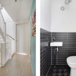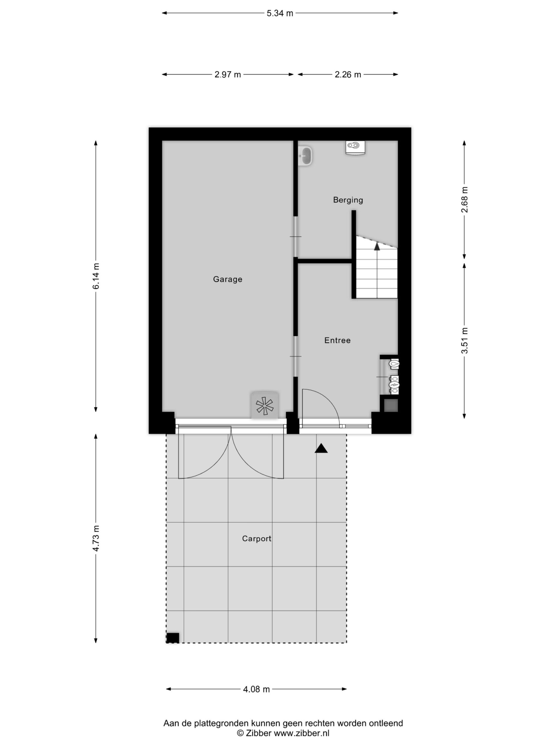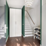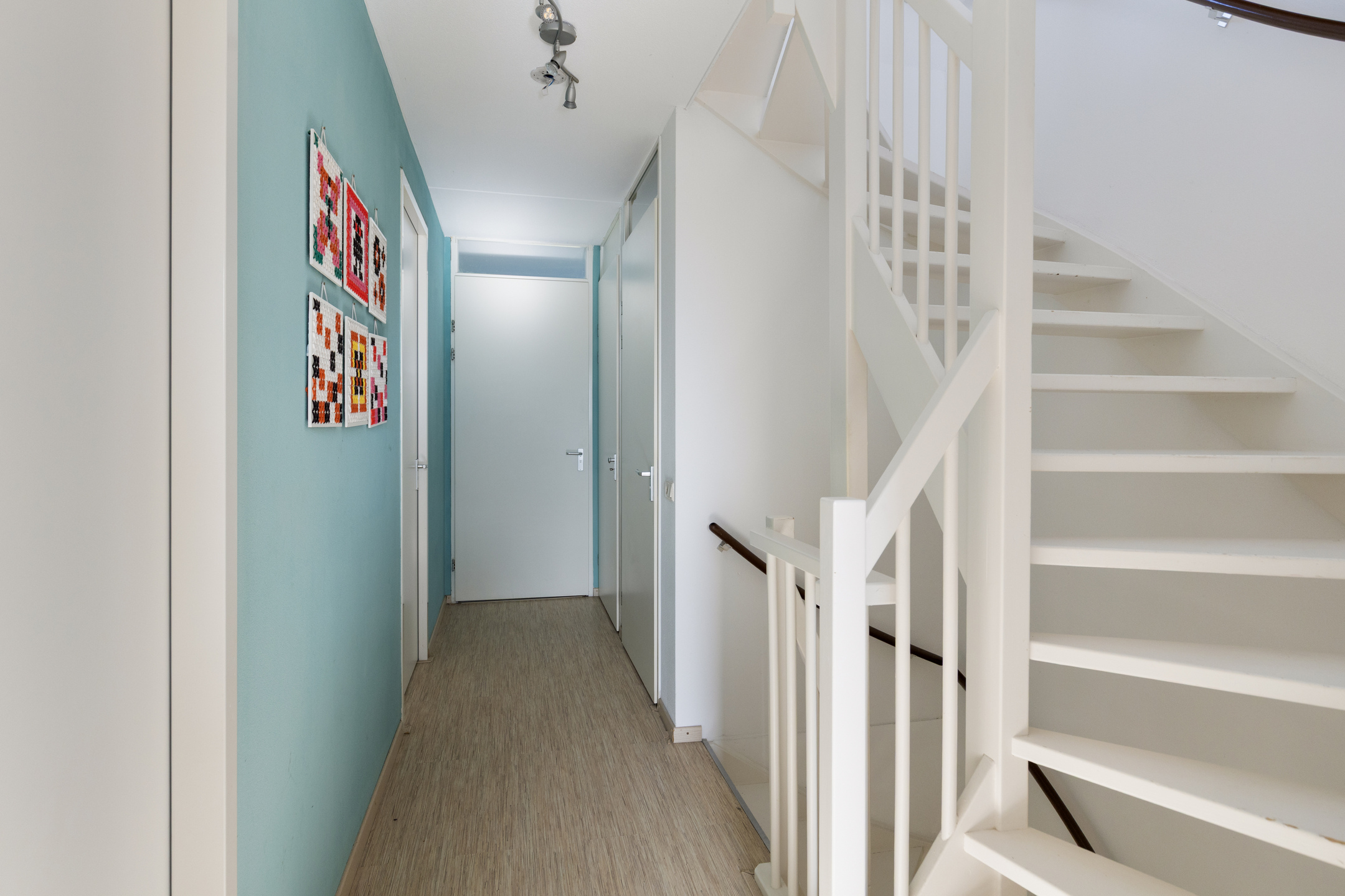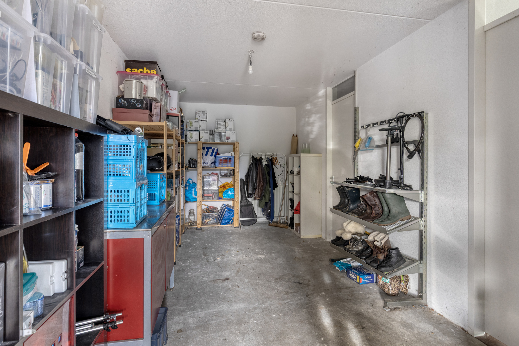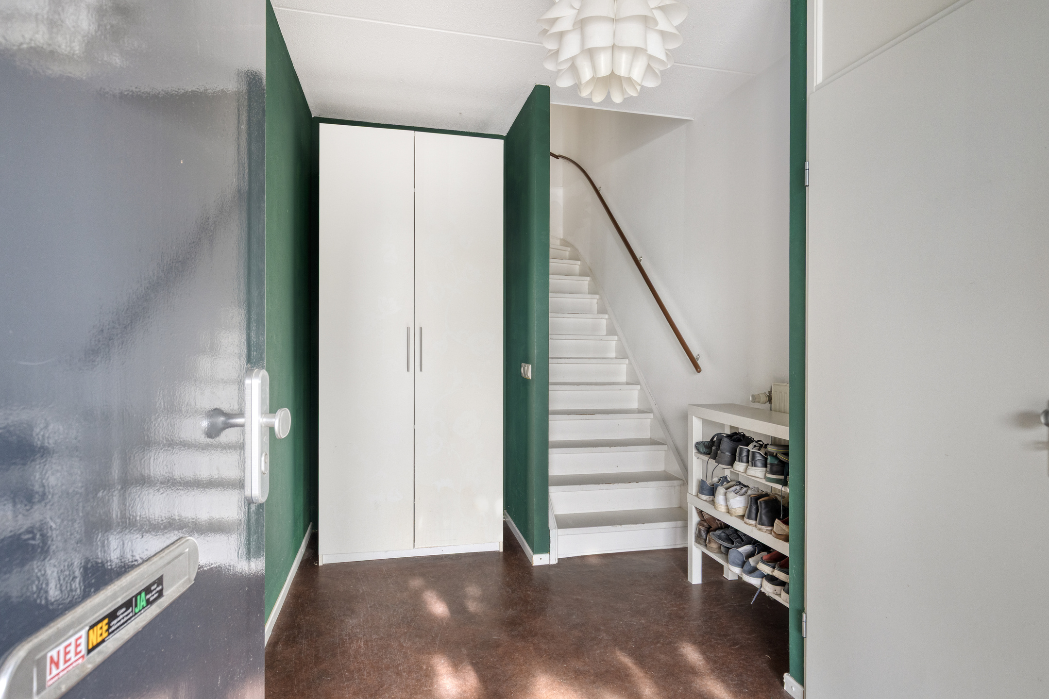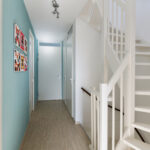 Entree met ruime hal en trapopgang. Vanuit hier is de inpandige garage bereikbaar, voorzien van praktische bergruimte en aansluitingen voor wasapparatuur. Ideaal voor fietsen, opslag en hobby’s.