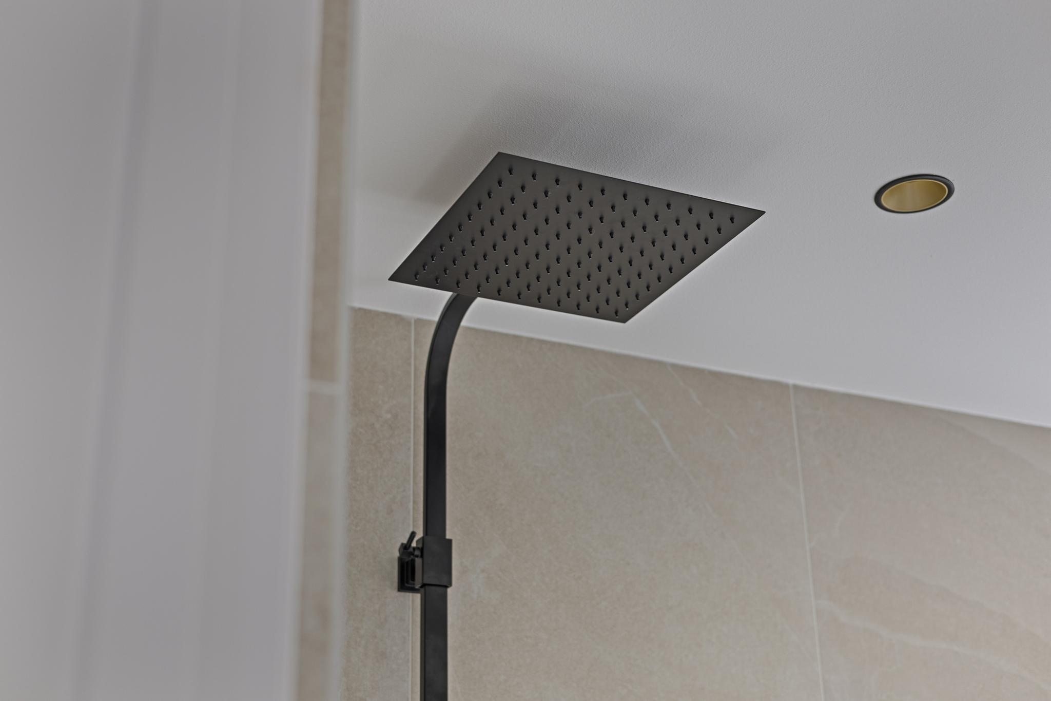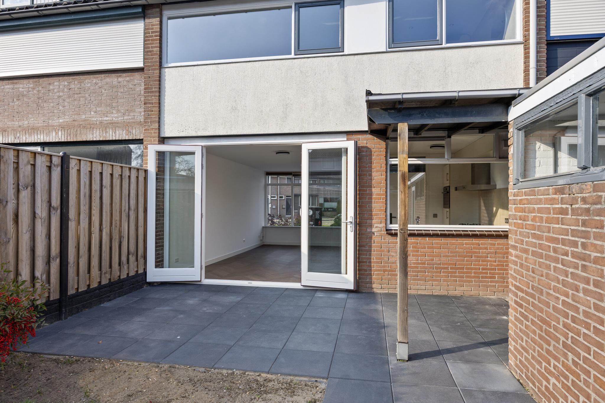 De zonnige achtertuin is voorzien van moderne grote terras tegels.