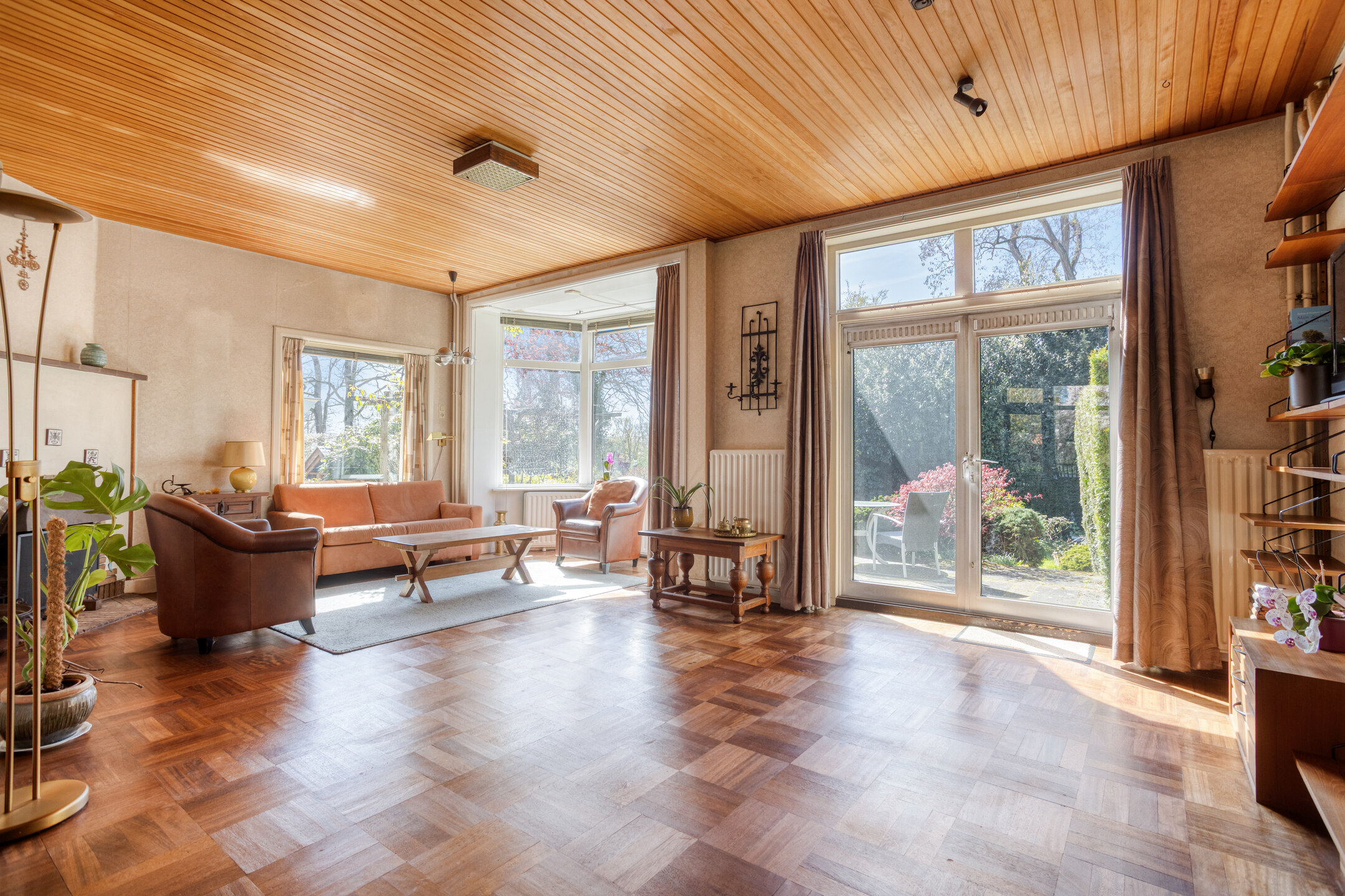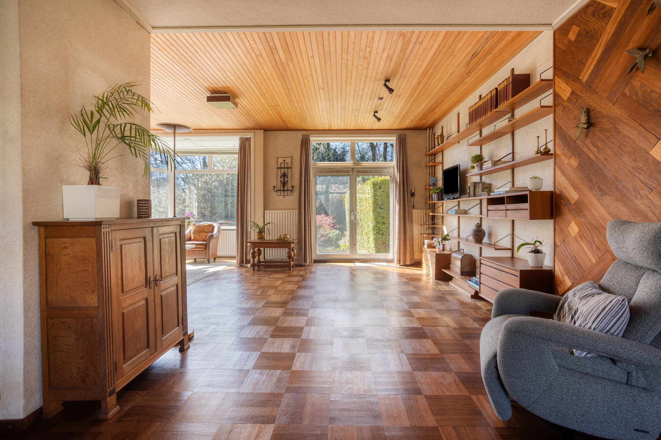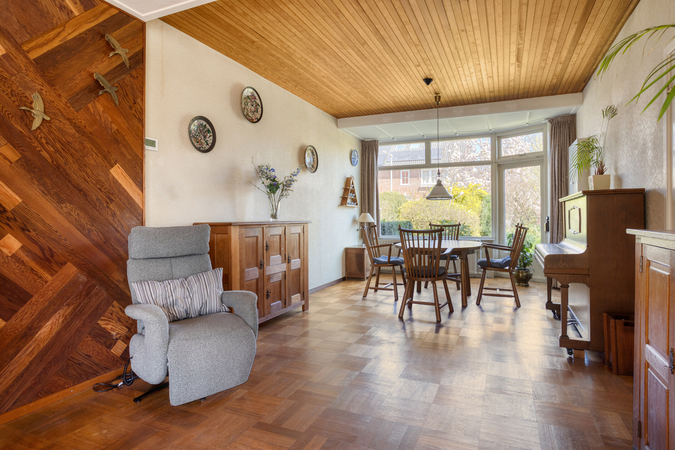 Entree, hal met toegang tot de garage, toilet en de woonkamer. De ruime woonkamer met een houten vloer en veel lichtinval aan zowel de voor- als achterzijde. Het uitzicht op de tuin zorgt voor een prettige verbinding met het groen rondom het huis. De indeling van de woonkamer biedt volop ruimte voor een royale zithoek en een eethoek.