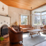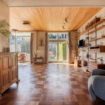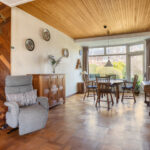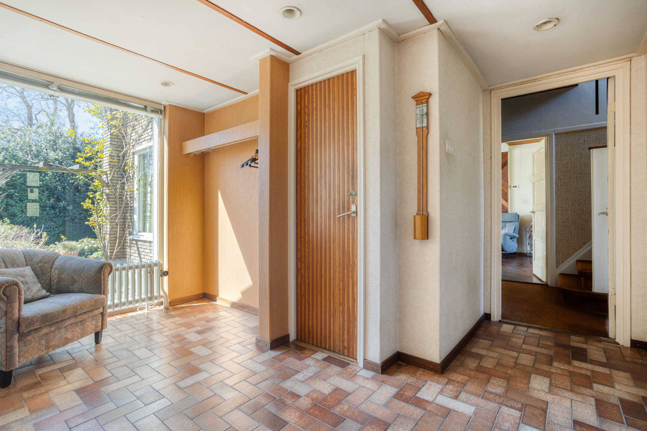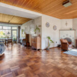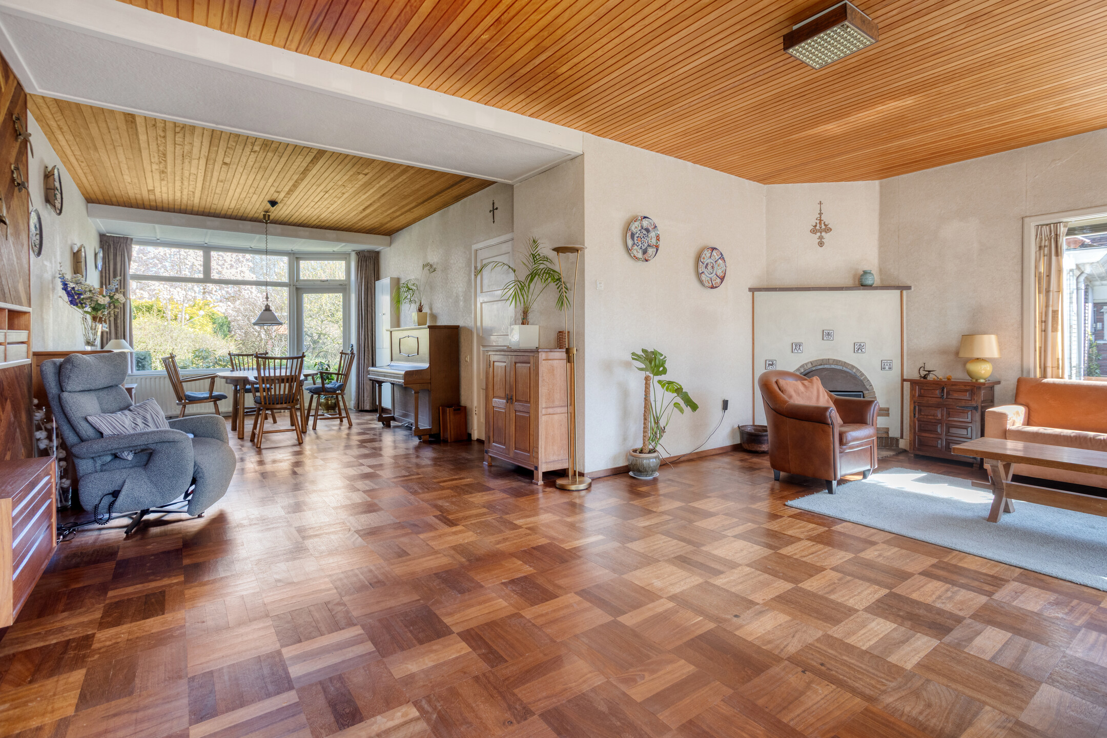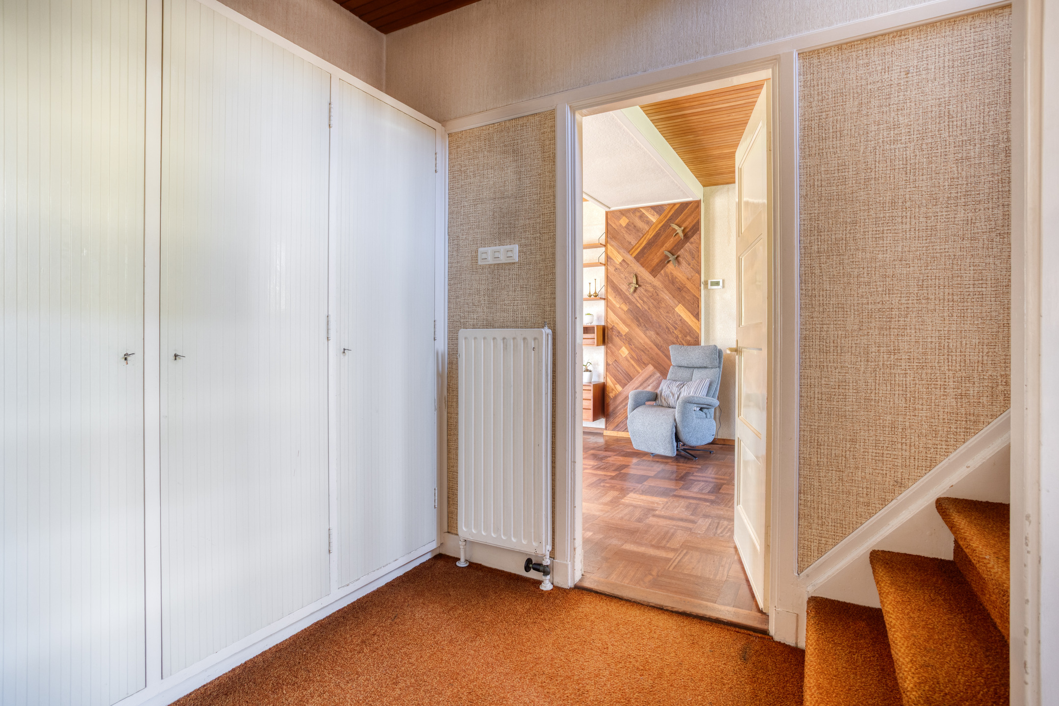 Entree, hal met toegang tot de garage, toilet en de woonkamer. De ruime woonkamer met een houten vloer en veel lichtinval aan zowel de voor- als achterzijde. Het uitzicht op de tuin zorgt voor een prettige verbinding met het groen rondom het huis. De indeling van de woonkamer biedt volop ruimte voor een royale zithoek en een eethoek.