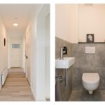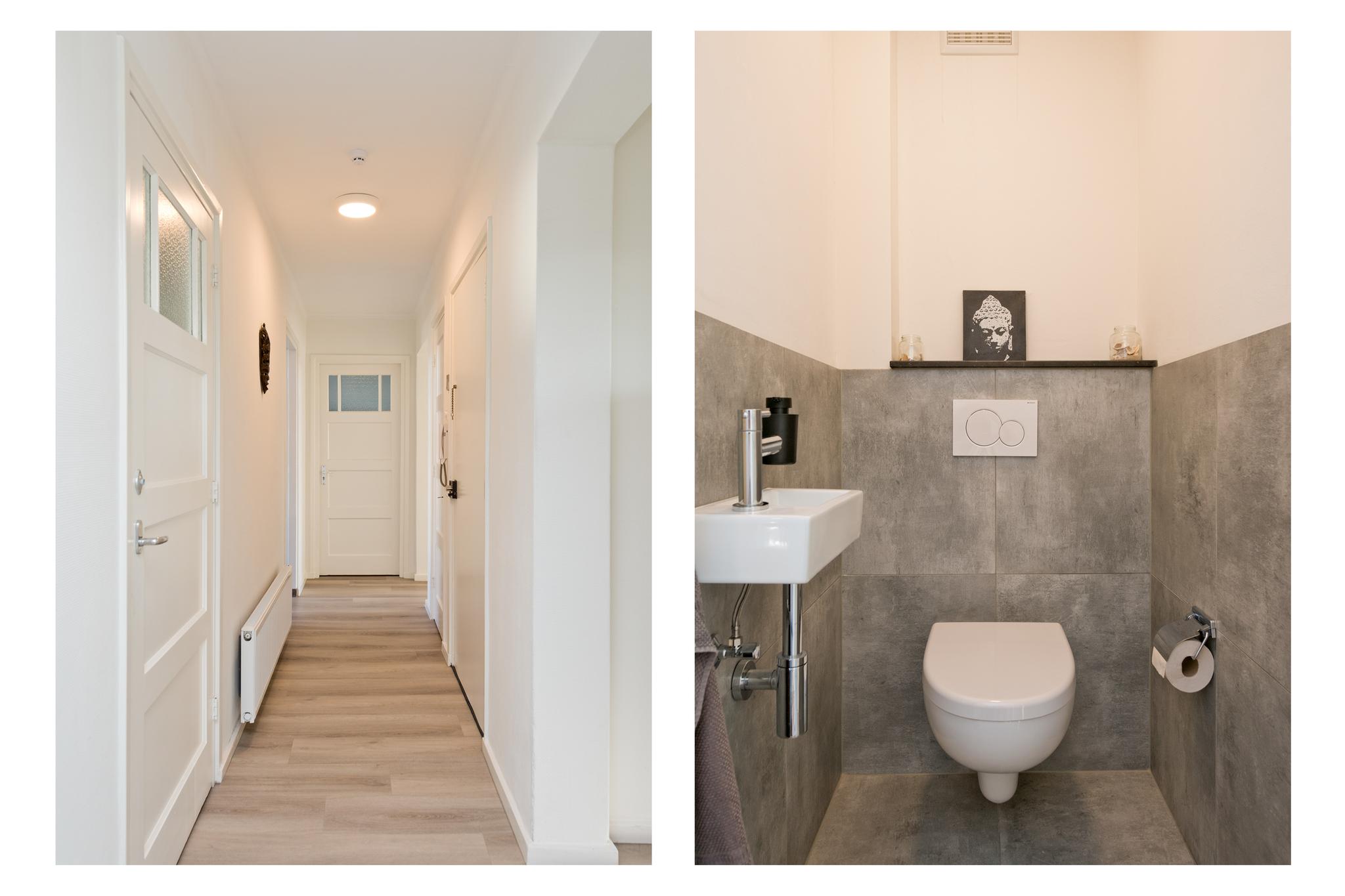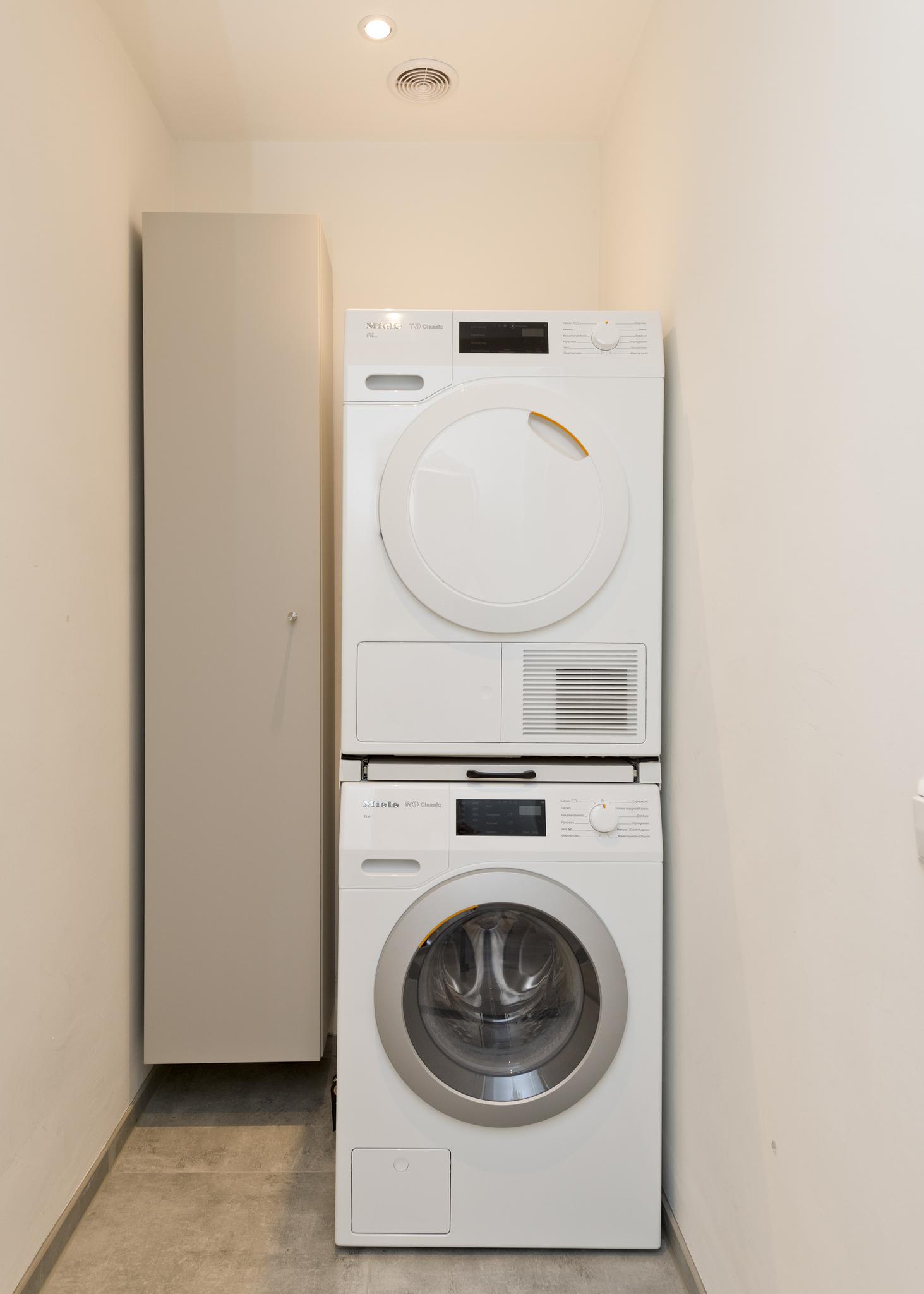 Binnen betreed je een U-vormige gang met garderoberuimte, toilet met wandcloset en fonteintje, meterkast met moderne groepenkast, daarnaast een praktische wasruimte met aansluiting voor wasmachine en droger.