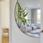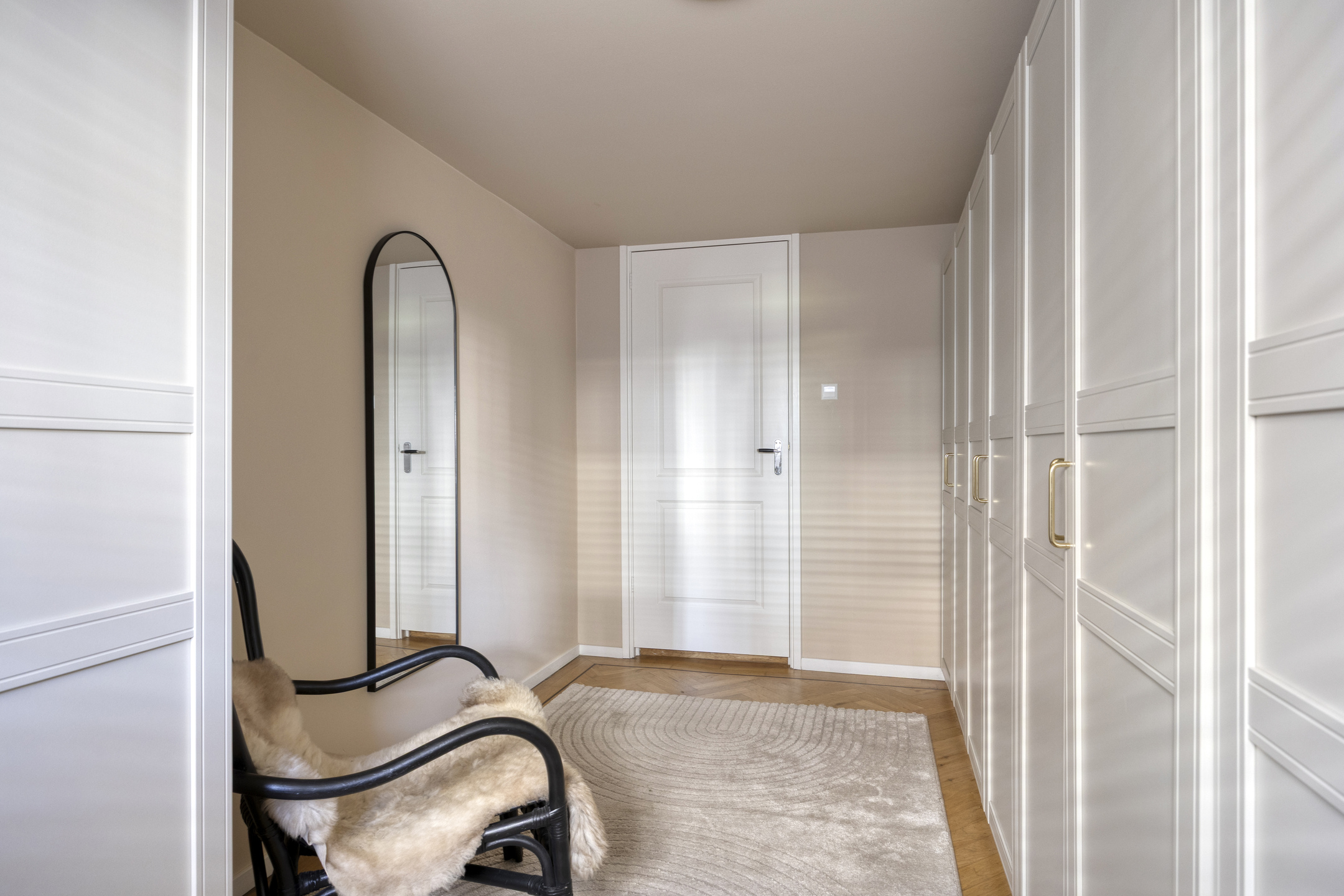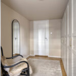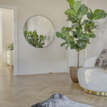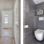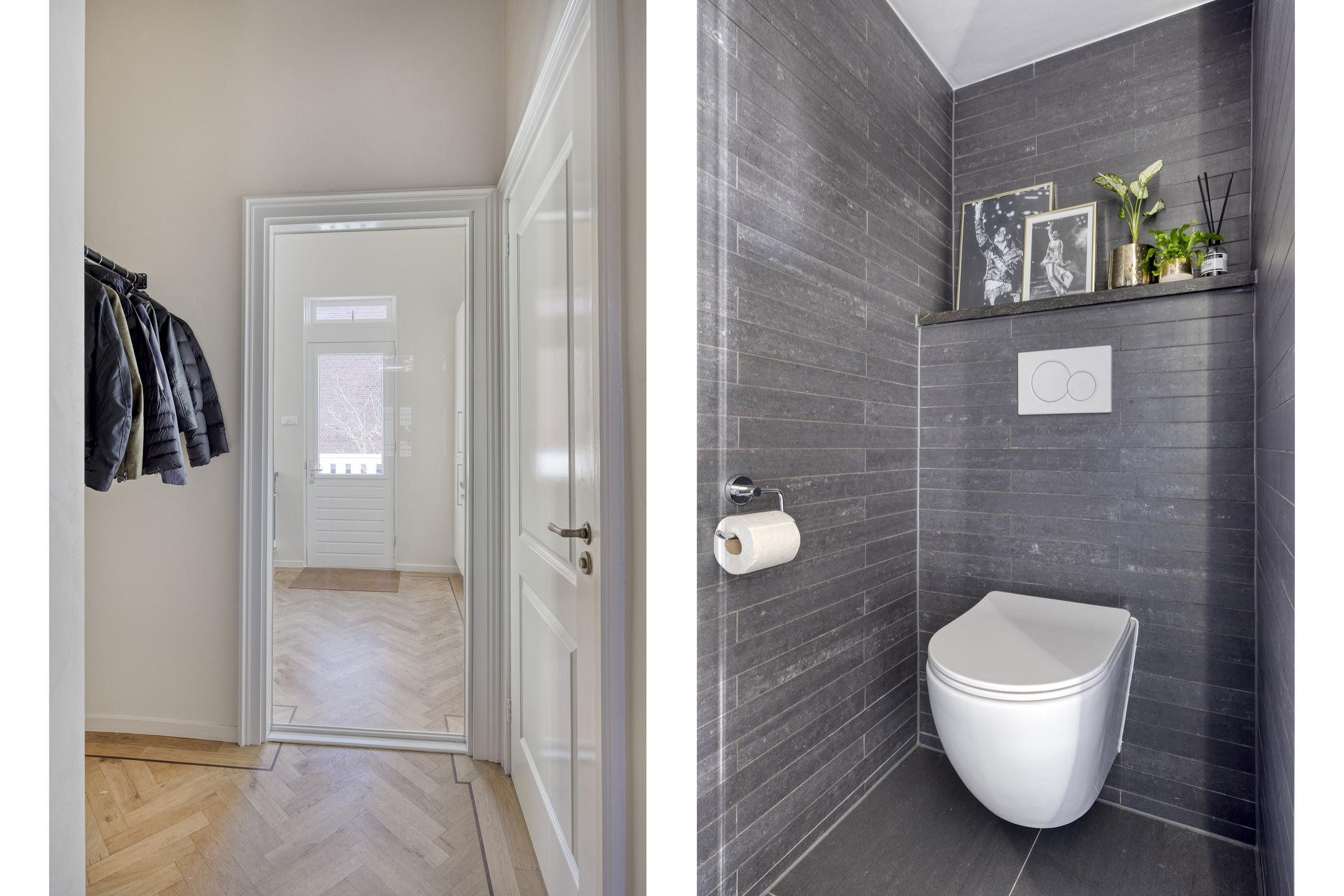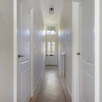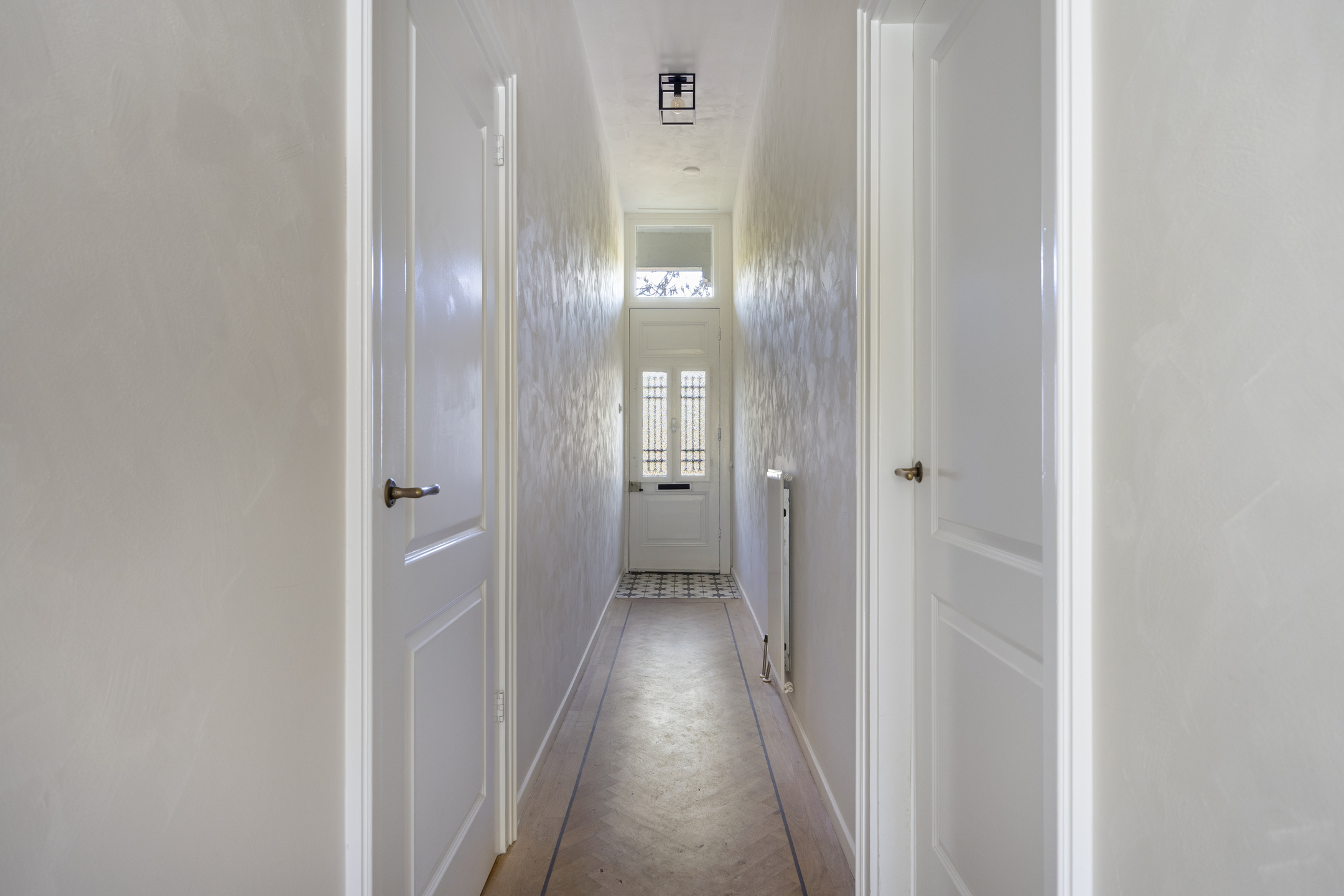 Ruime entree met stijlvolle vloertegels en een doorkijk richting de moderne keuken aan het einde van de hal. Hier bevinden zich tevens de garderobe, het trapportaal naar het souterrain en een modern toilet met fonteintje.