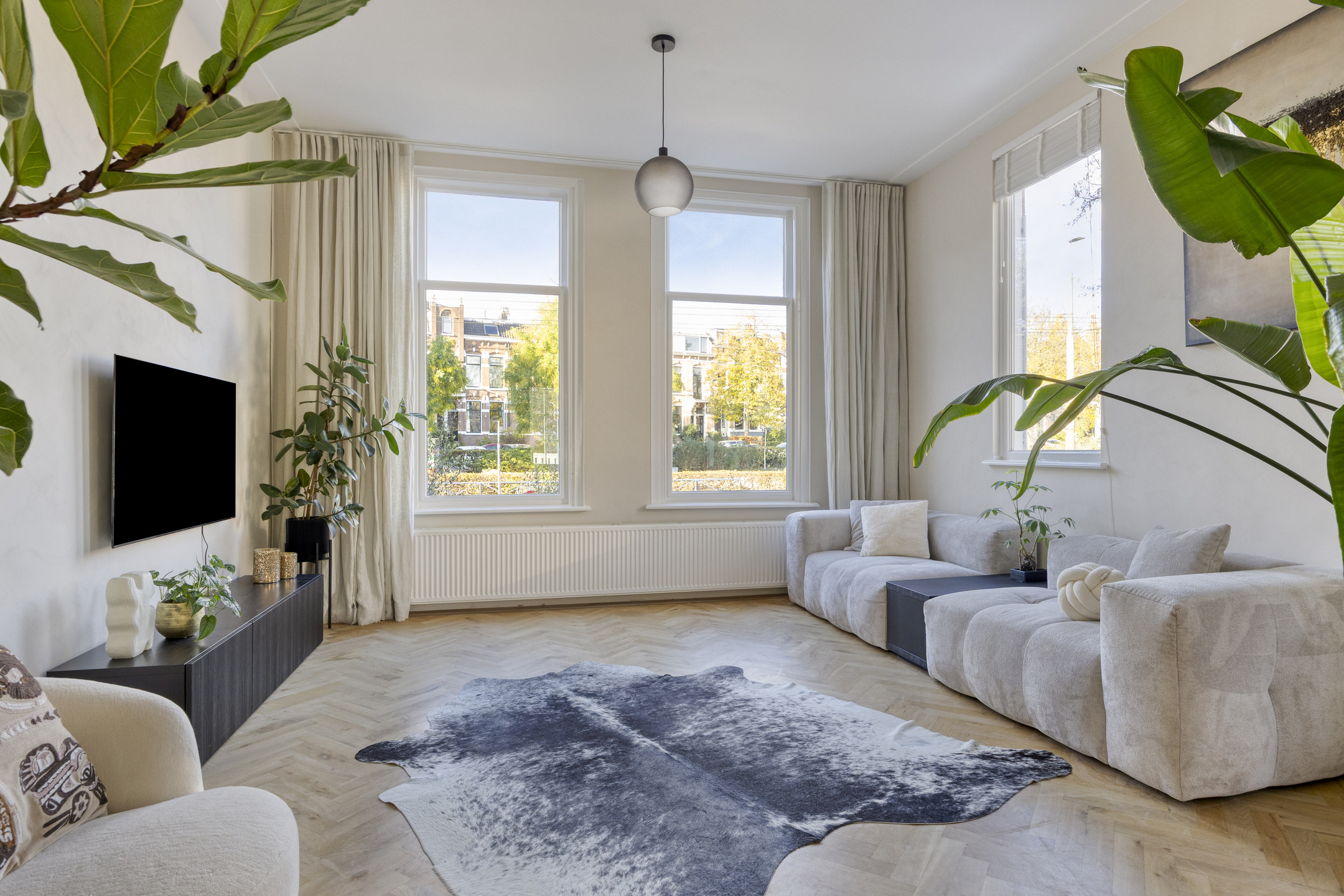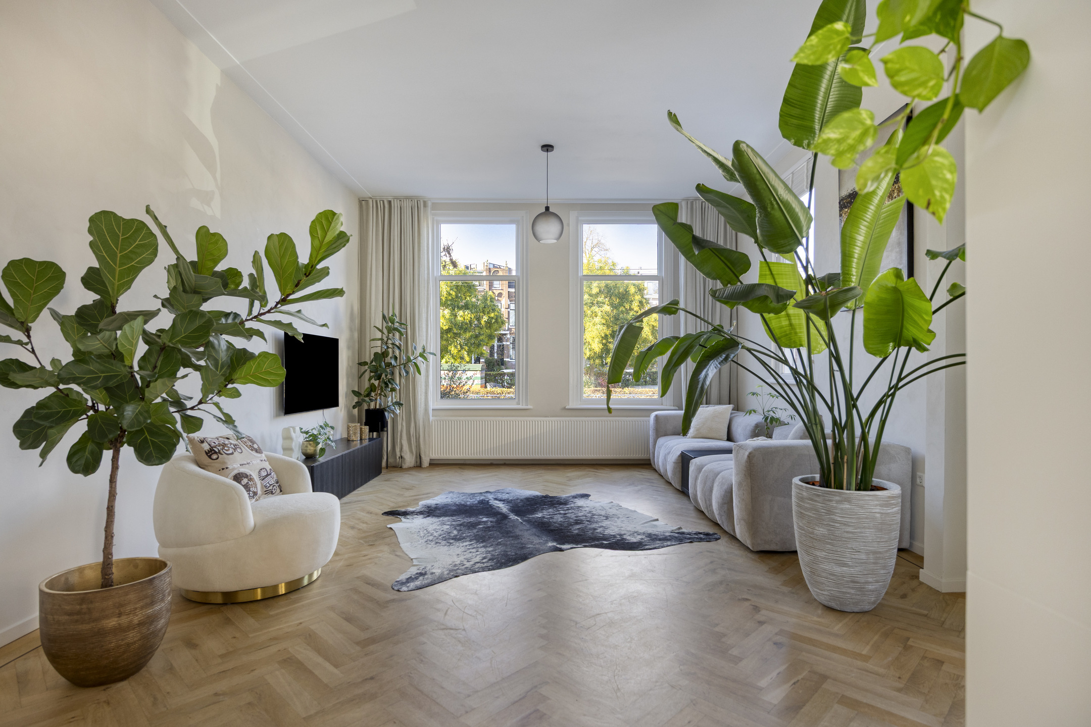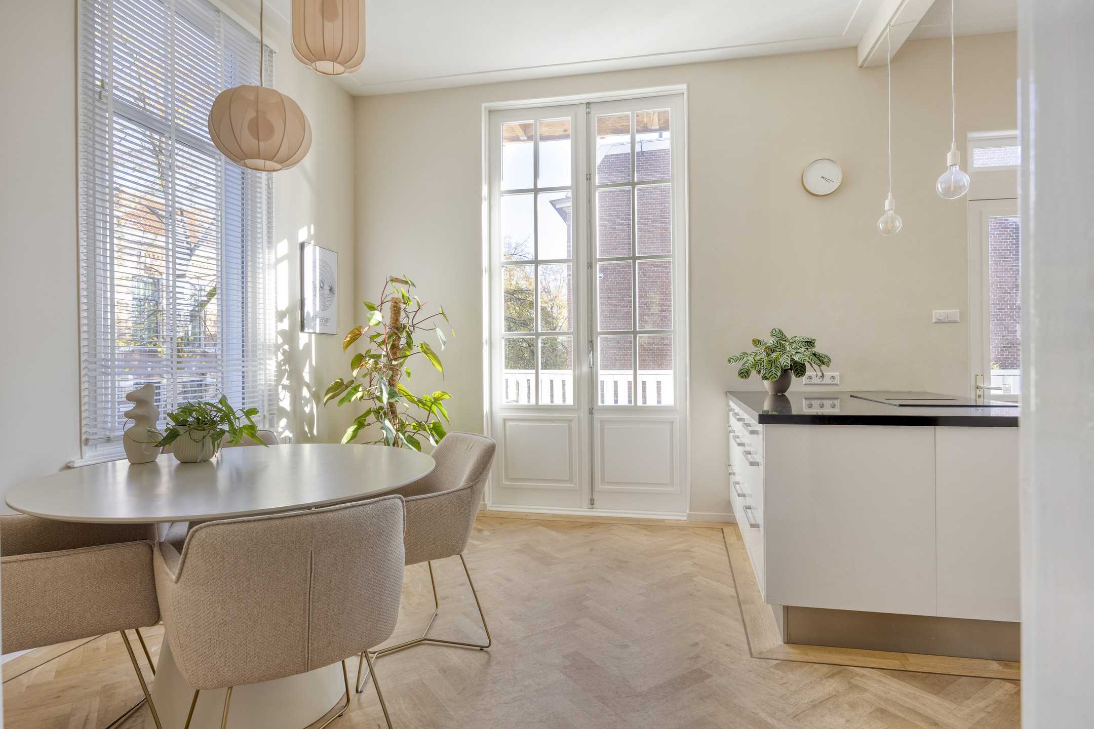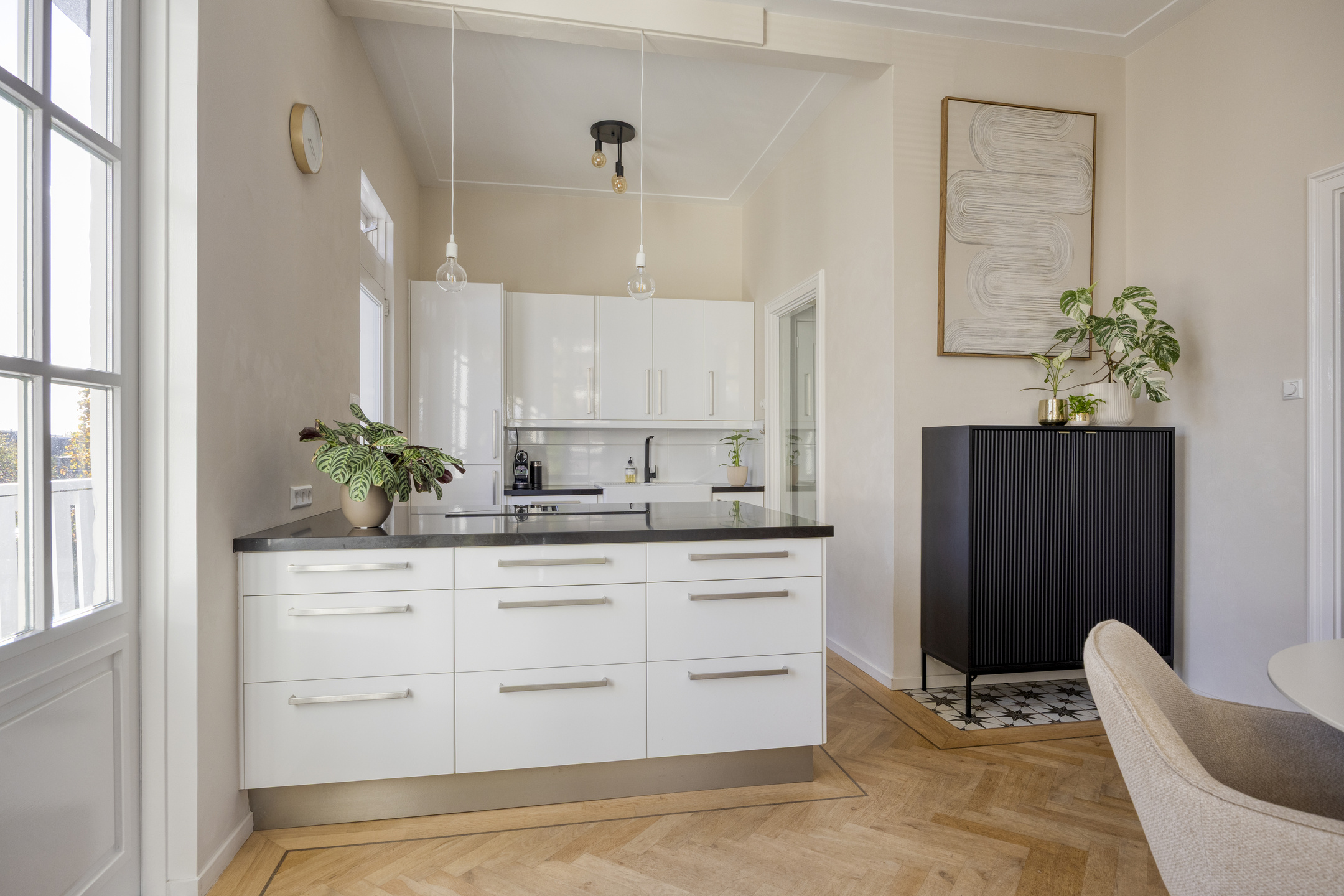 De lichte woonkamer is dankzij de hoekligging voorzien van grote raampartijen en een indrukwekkende plafondhoogte van ca. 3,21 meter. De eikenhouten visgraatvloer loopt door in de eetkamer en de moderne, hoogglans witte keuken met kookeiland.