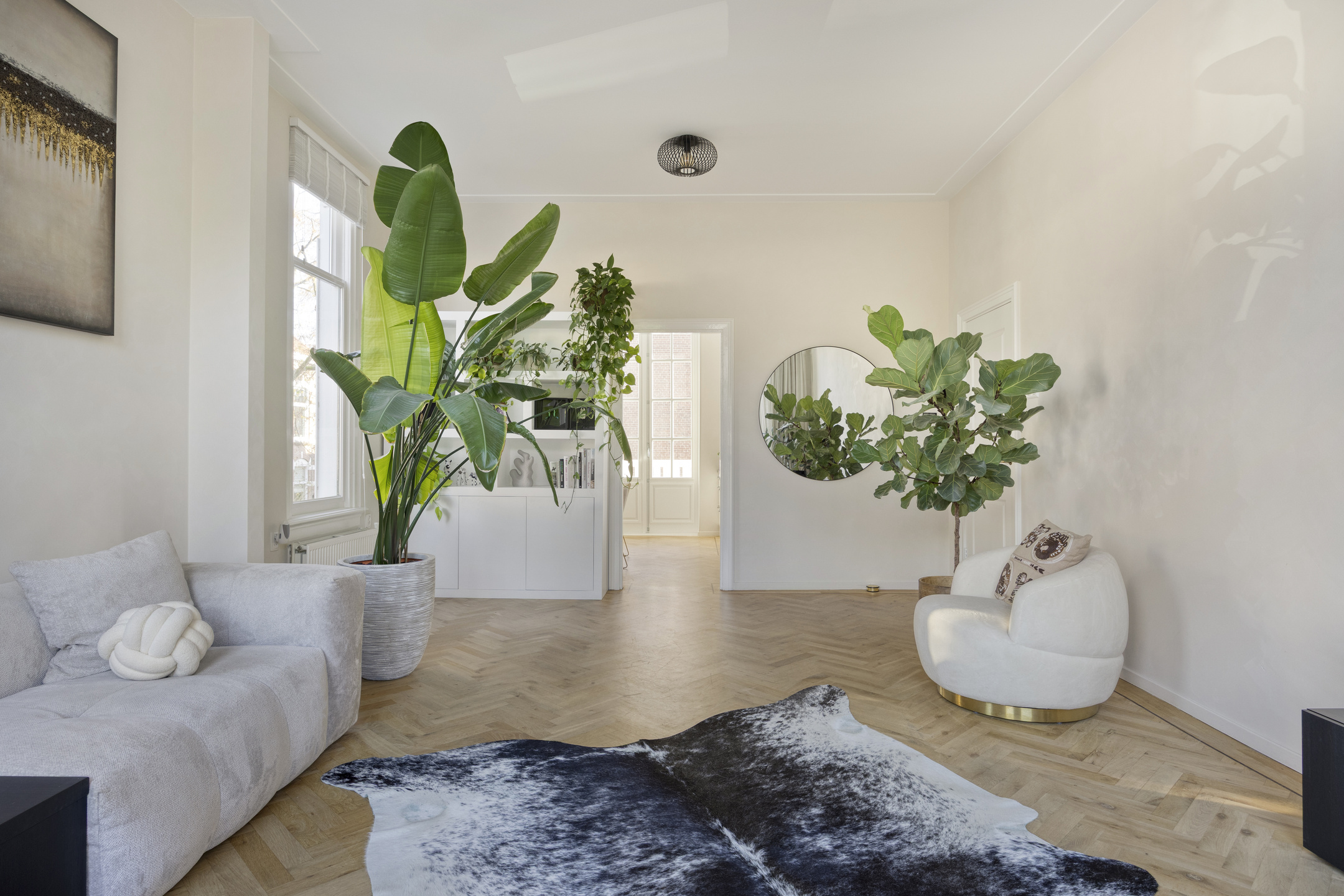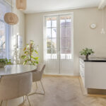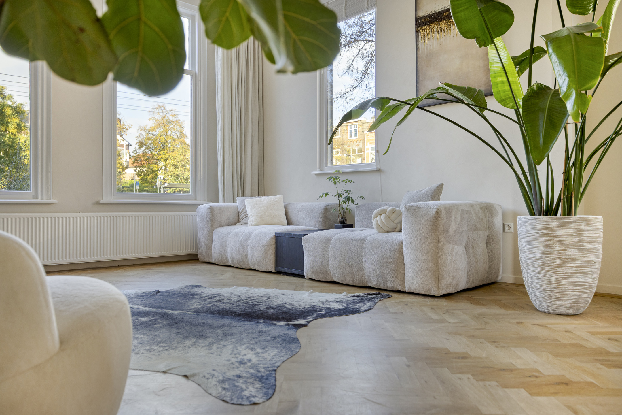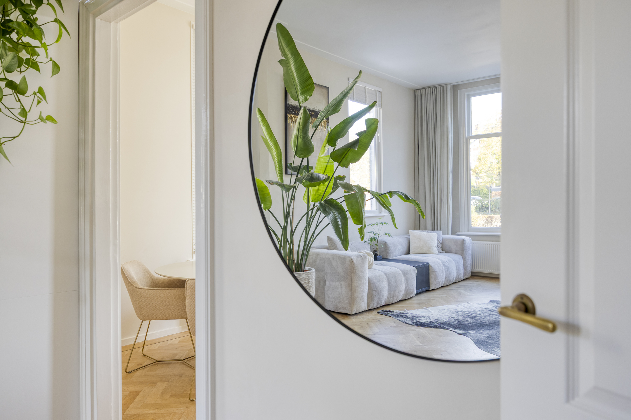De lichte woonkamer is dankzij de hoekligging voorzien van grote raampartijen en een indrukwekkende plafondhoogte van ca. 3,21 meter. De eikenhouten visgraatvloer loopt door in de eetkamer en de moderne, hoogglans witte keuken met kookeiland.
