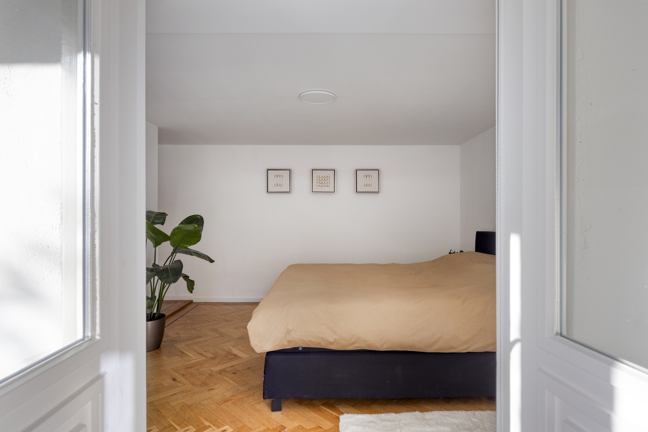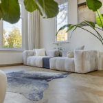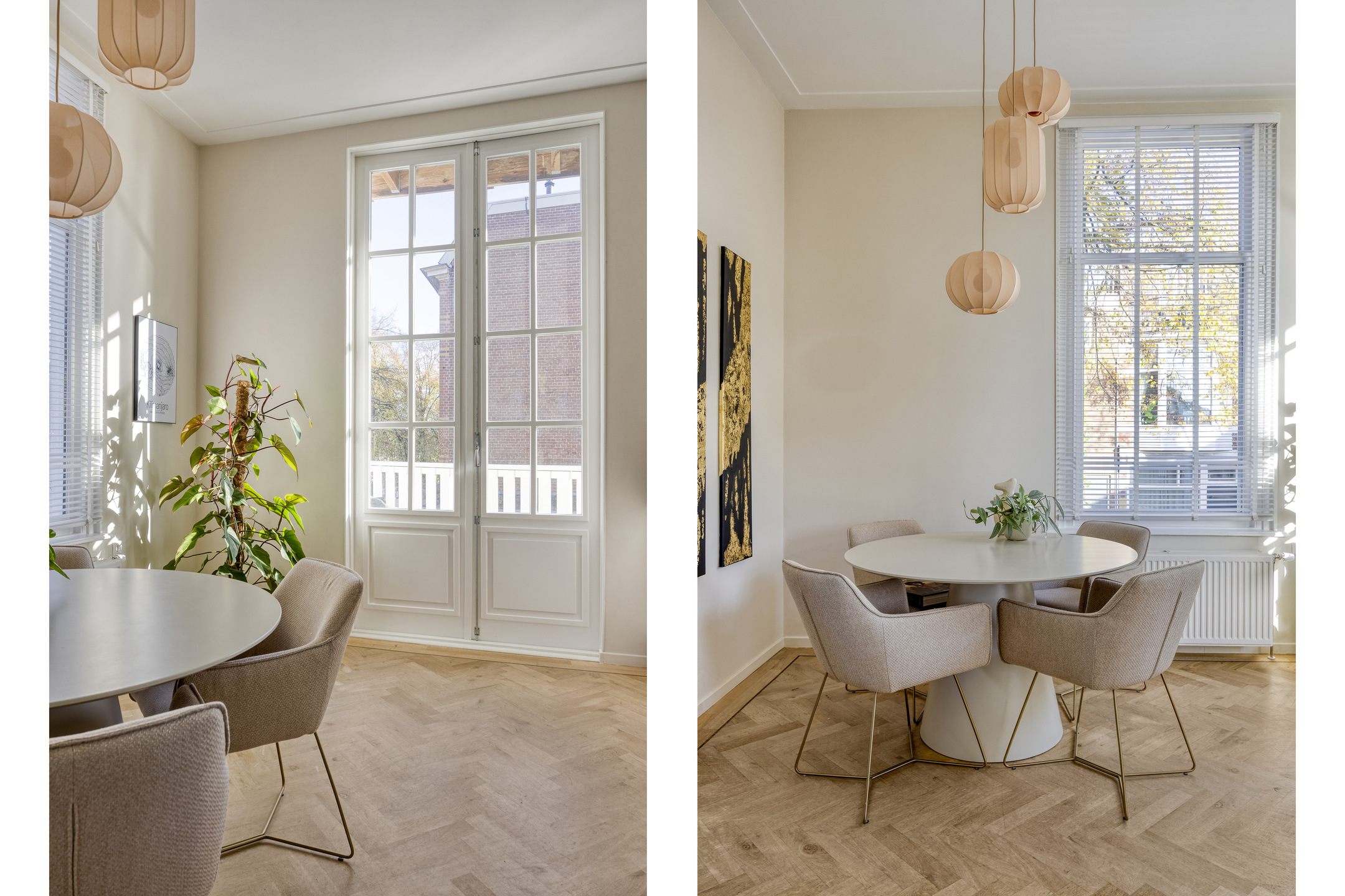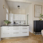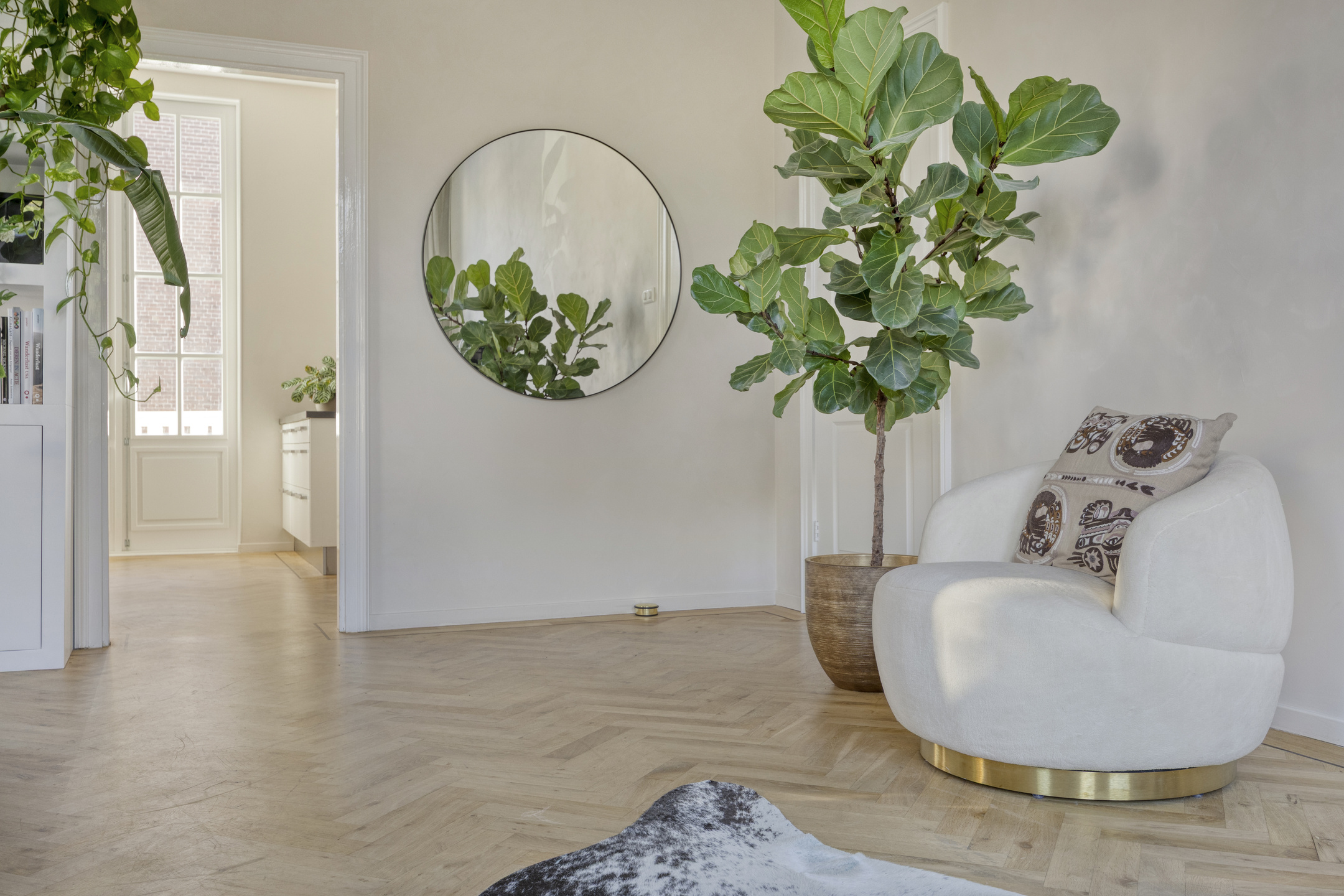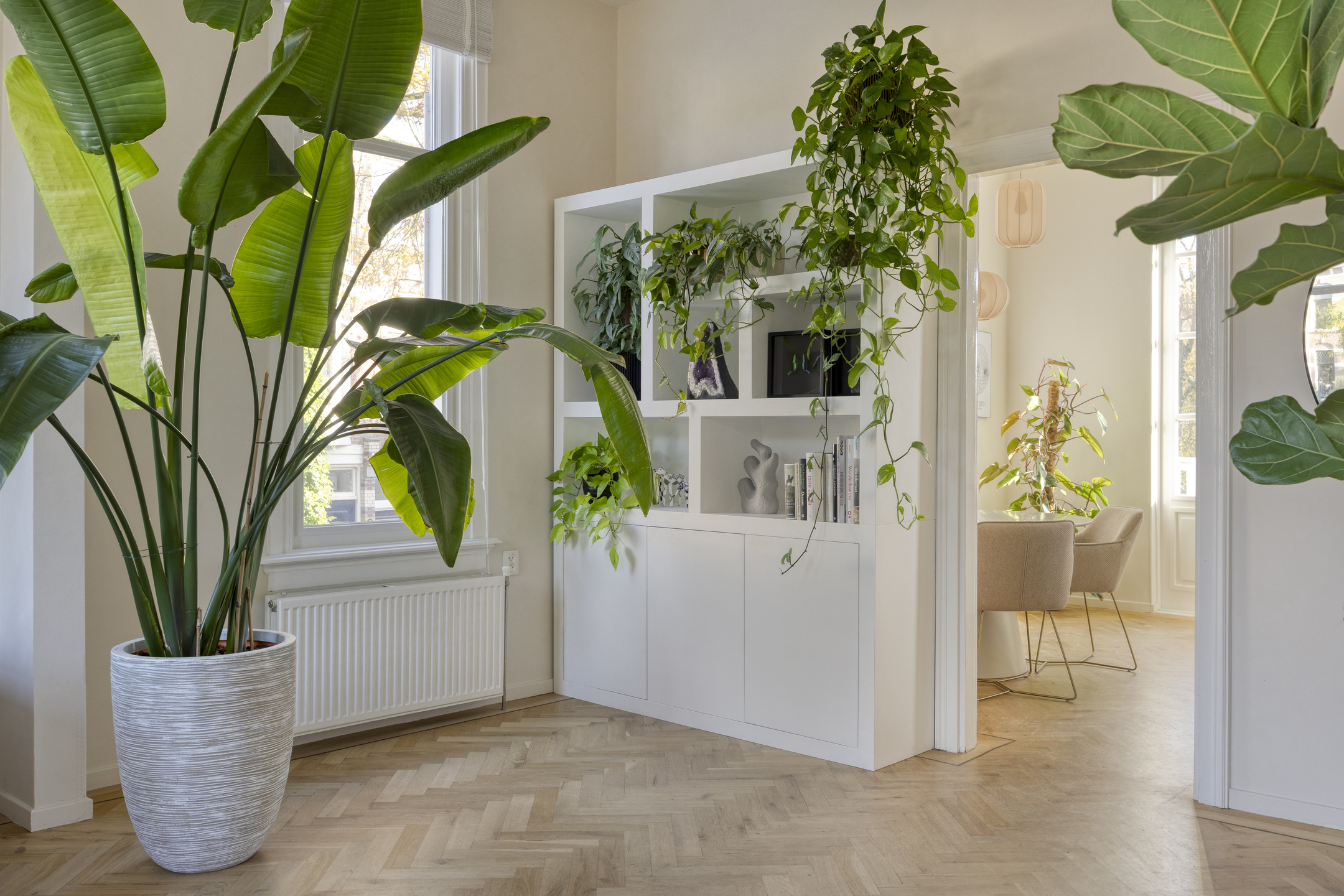 De lichte woonkamer is dankzij de hoekligging voorzien van grote raampartijen en een indrukwekkende plafondhoogte van ca. 3,21 meter. De eikenhouten visgraatvloer loopt door in de eetkamer en de moderne, hoogglans witte keuken met kookeiland.