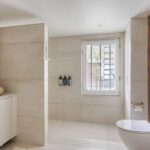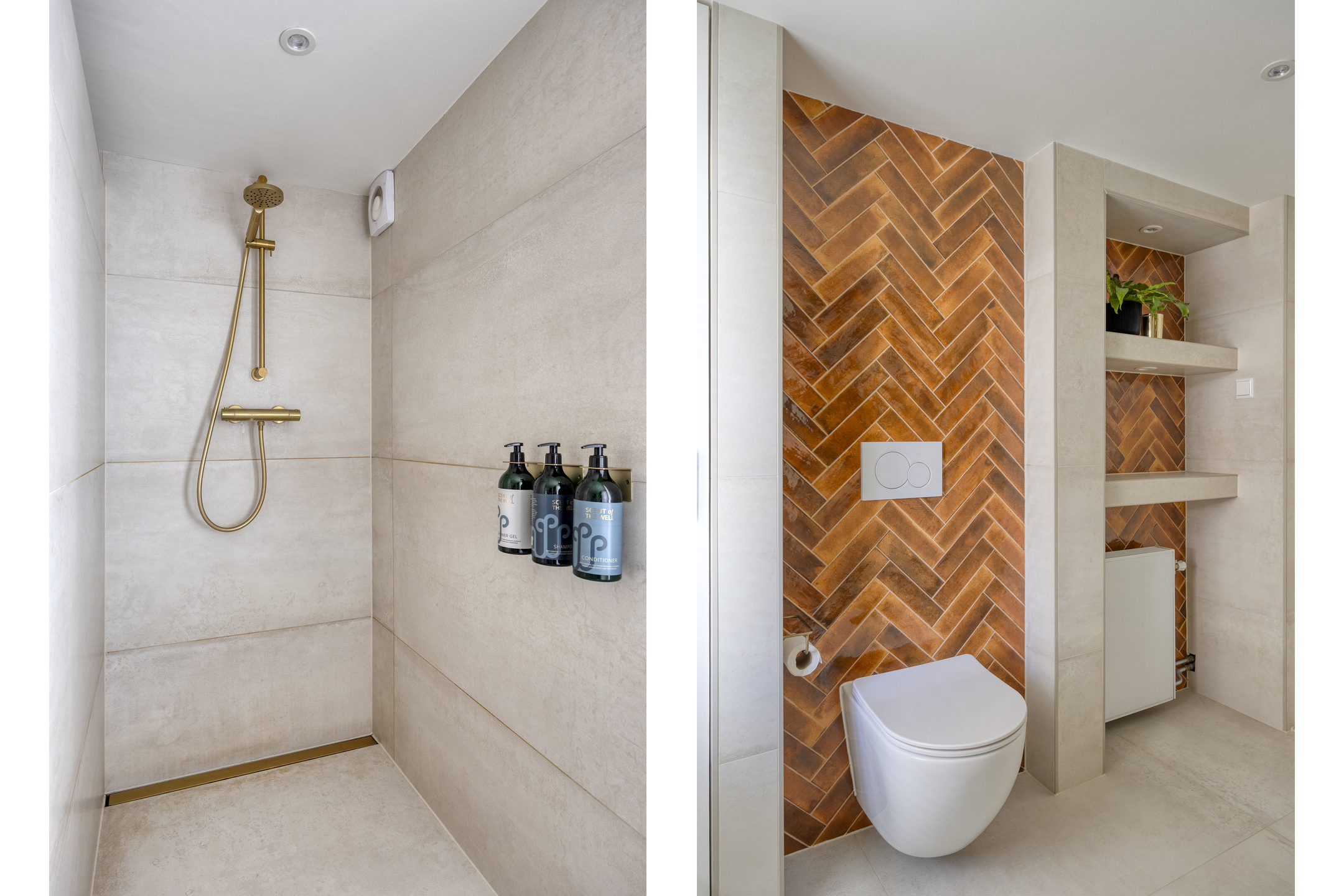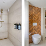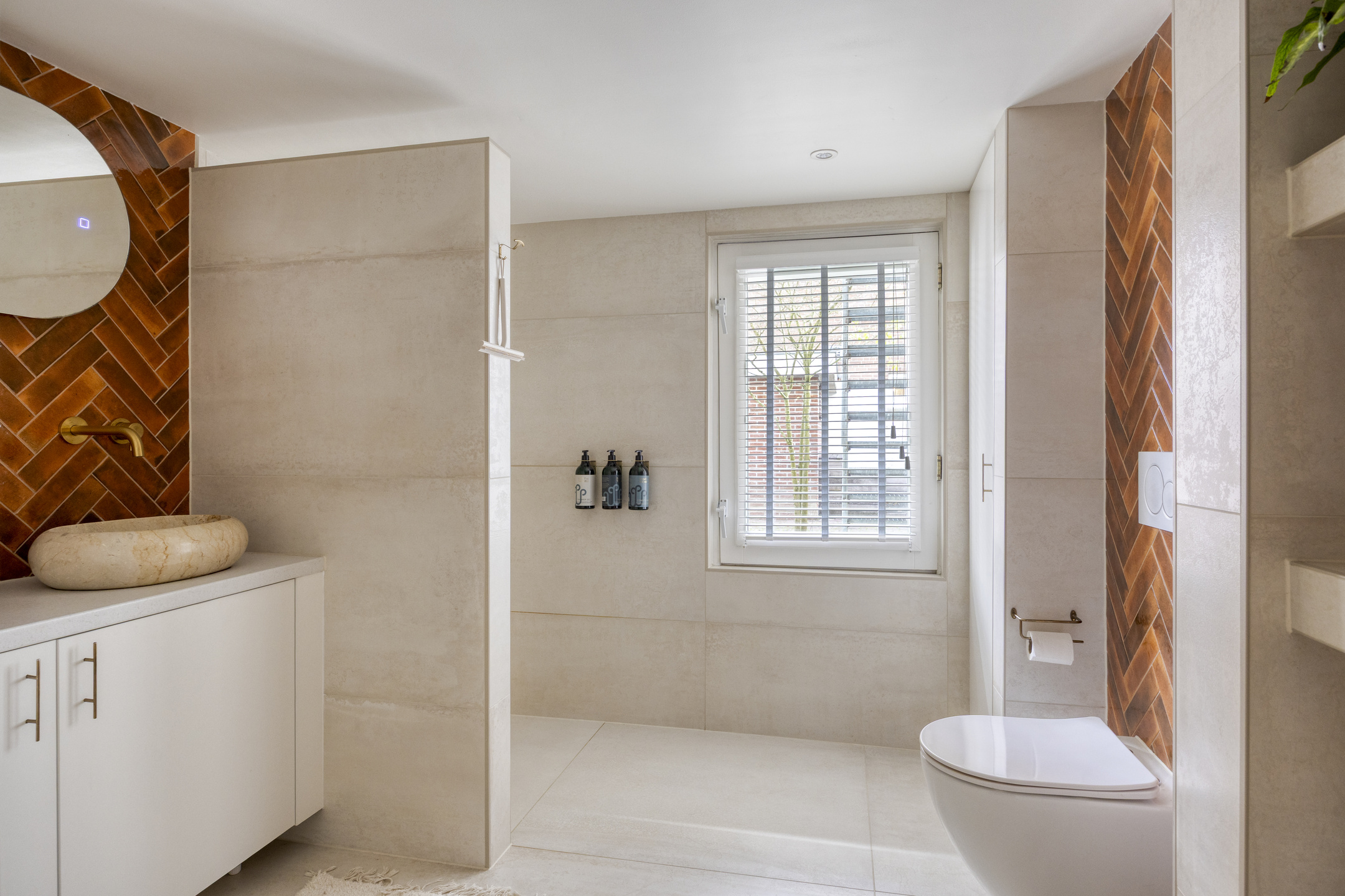 De luxe badkamer (gerealiseerd in december 2023) is voorzien van een ruime inloopdouche met regendouche, dubbele wastafels, maatwerkkast met cv-opstelling, tweede toilet, designradiator en natuurlijke lichtinval.
