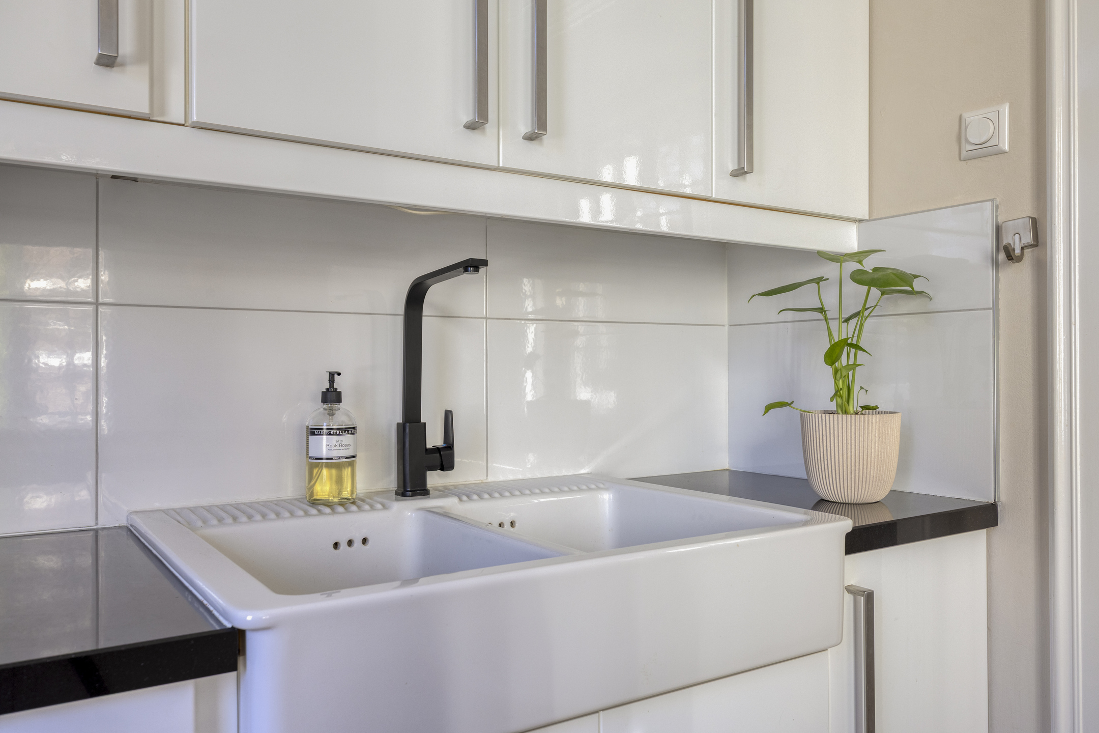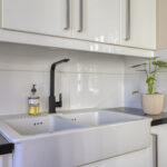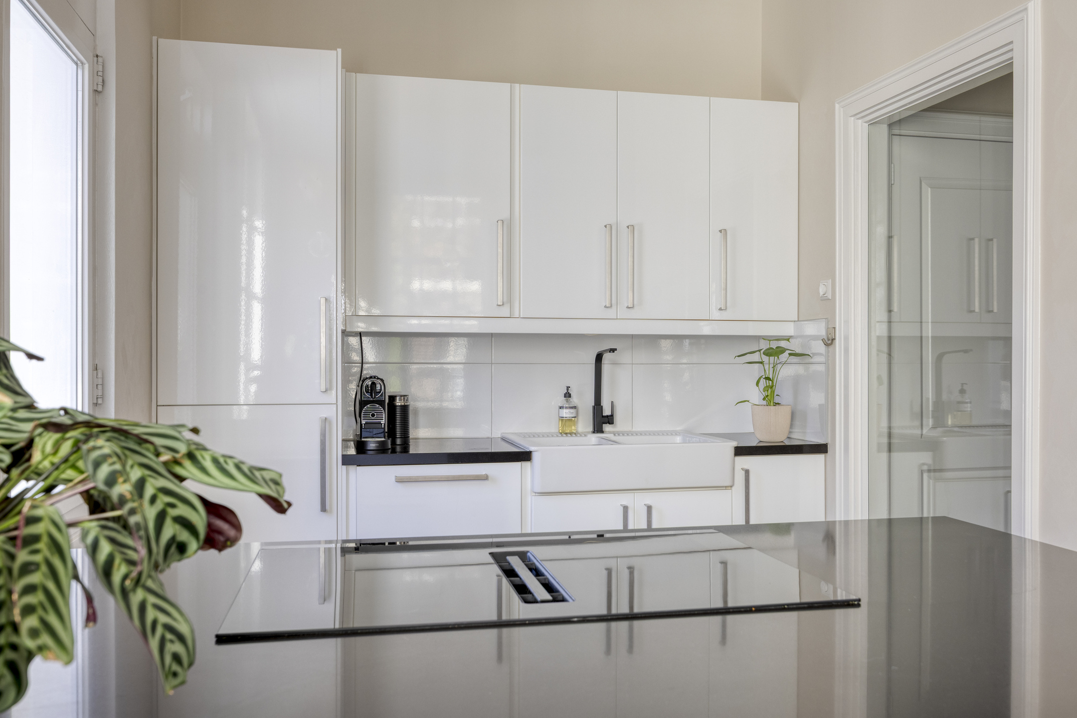 De keuken is uitgerust met diverse inbouwapparatuur, waaronder een inductiekookplaat met downdraft-afzuigsysteem (2024), koelkast, vrieskast, combi-oven, magnetron en vaatwasser. Het werkblad van zwart natuursteen en de ruime kasten zorgen voor een luxe uitstraling.