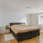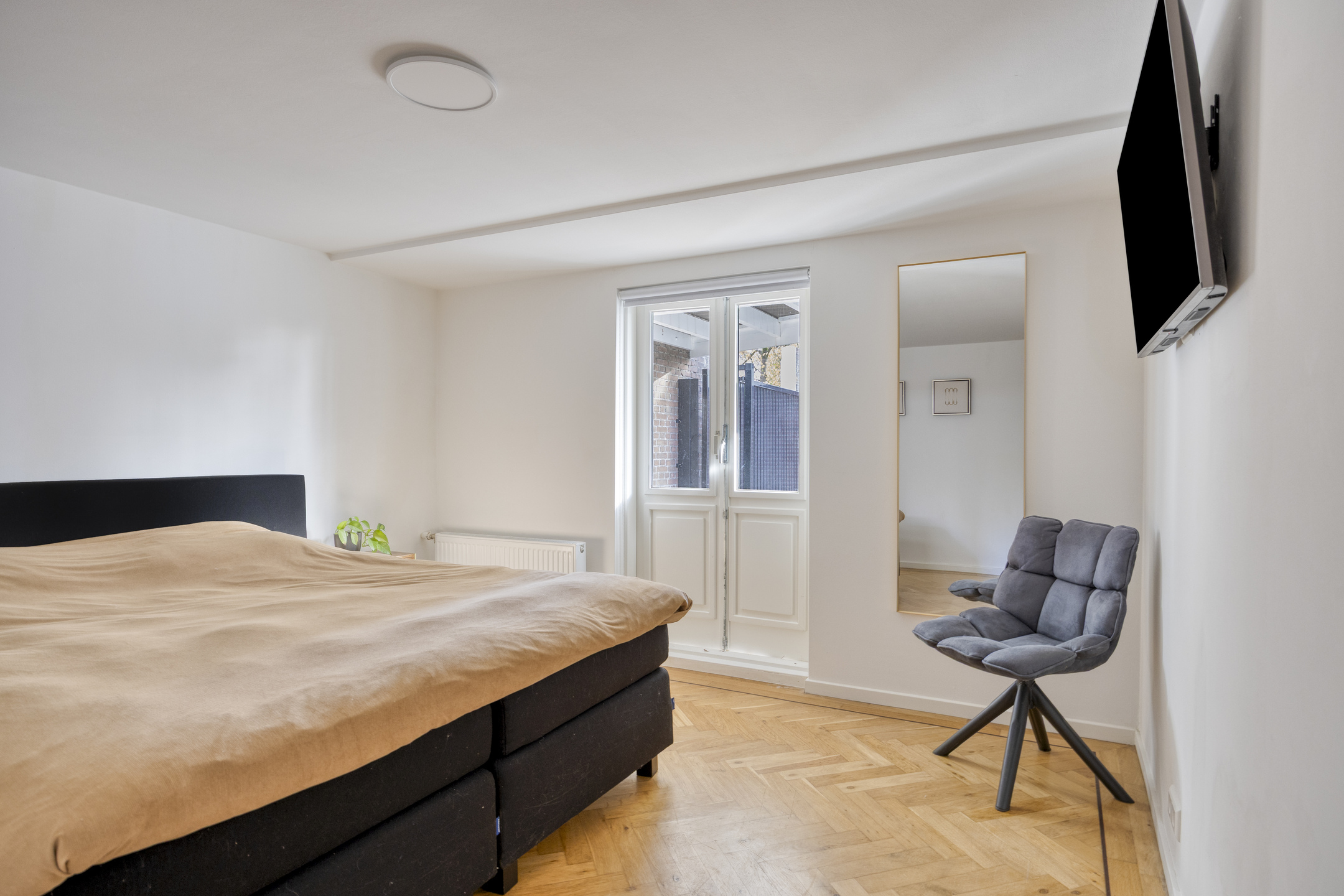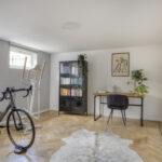 De derde slaapkamer aan de achterzijde heeft openslaande deuren naar de tuin onder het terras. Het souterrain is vochtwerend behandeld, geïsoleerd met watervast materiaal en grotendeels voorzien van eiken visgraatparket.