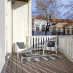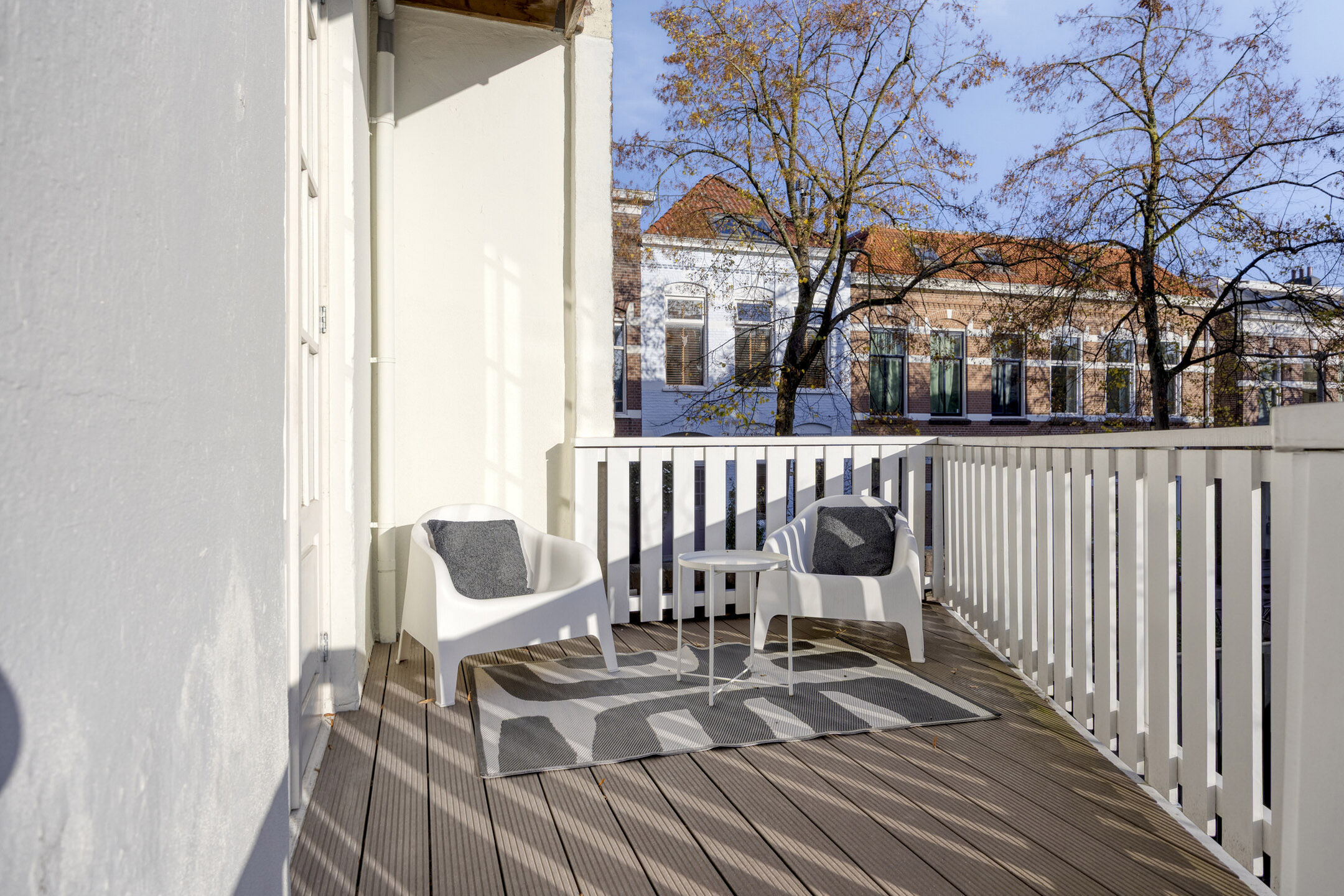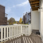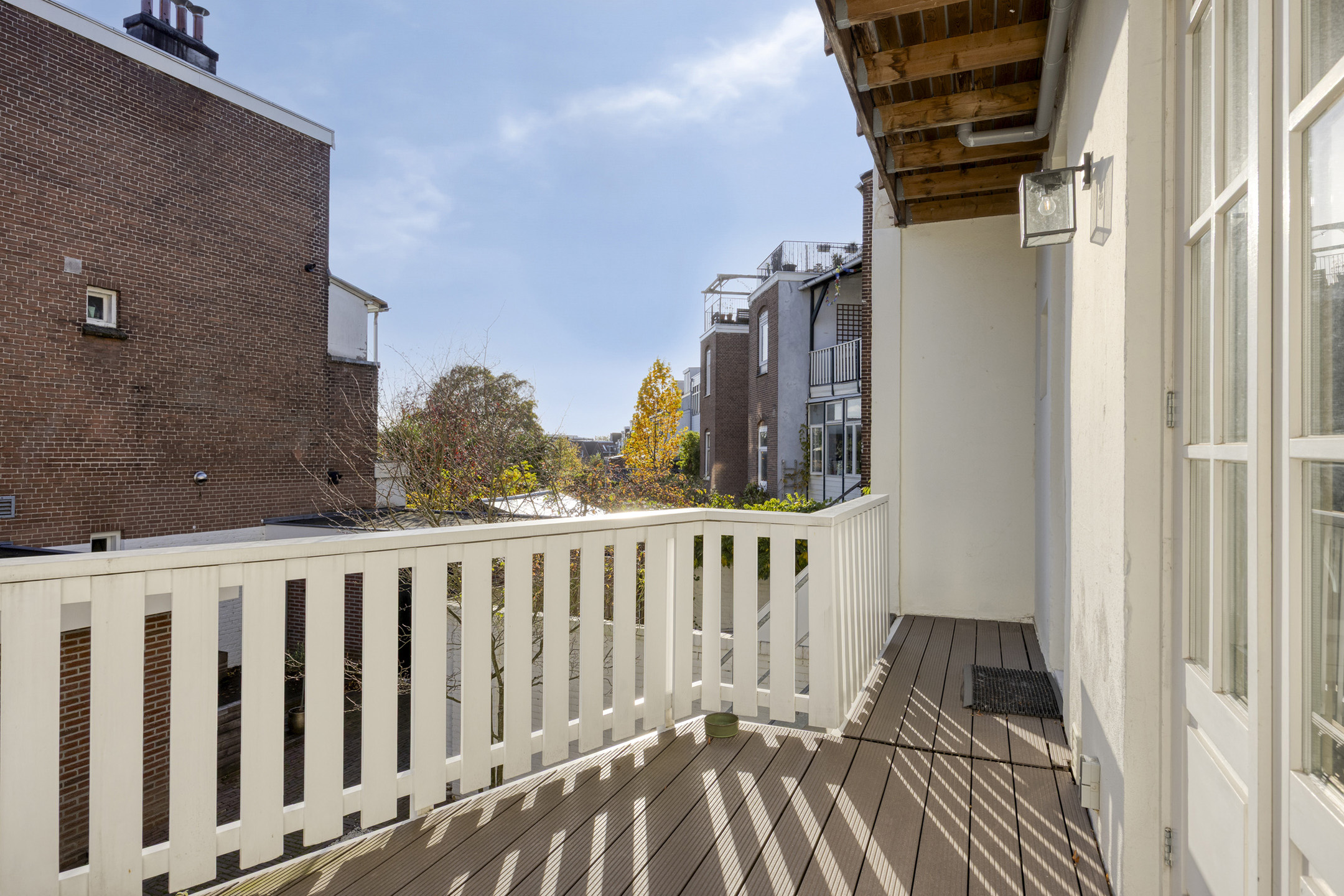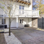 De achtertuin is een ware verlenging van de leefruimte binnen. Het terras strekt zich uit over de volle breedte van de woning en biedt op elk moment van de dag een heerlijke plek in zon of schaduw. De composiet vlonders, witte balustrade en trap naar de tuin zorgen voor een verzorgd geheel.