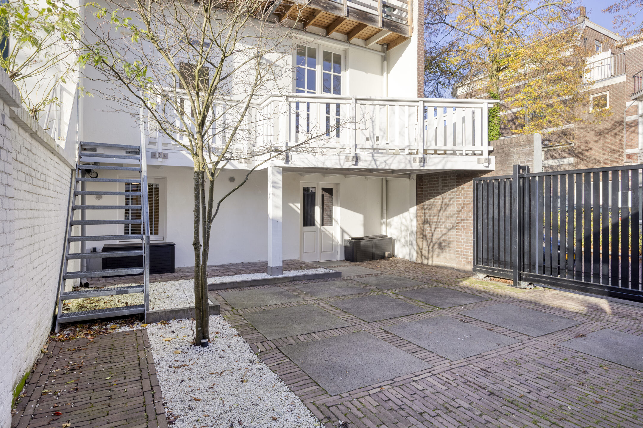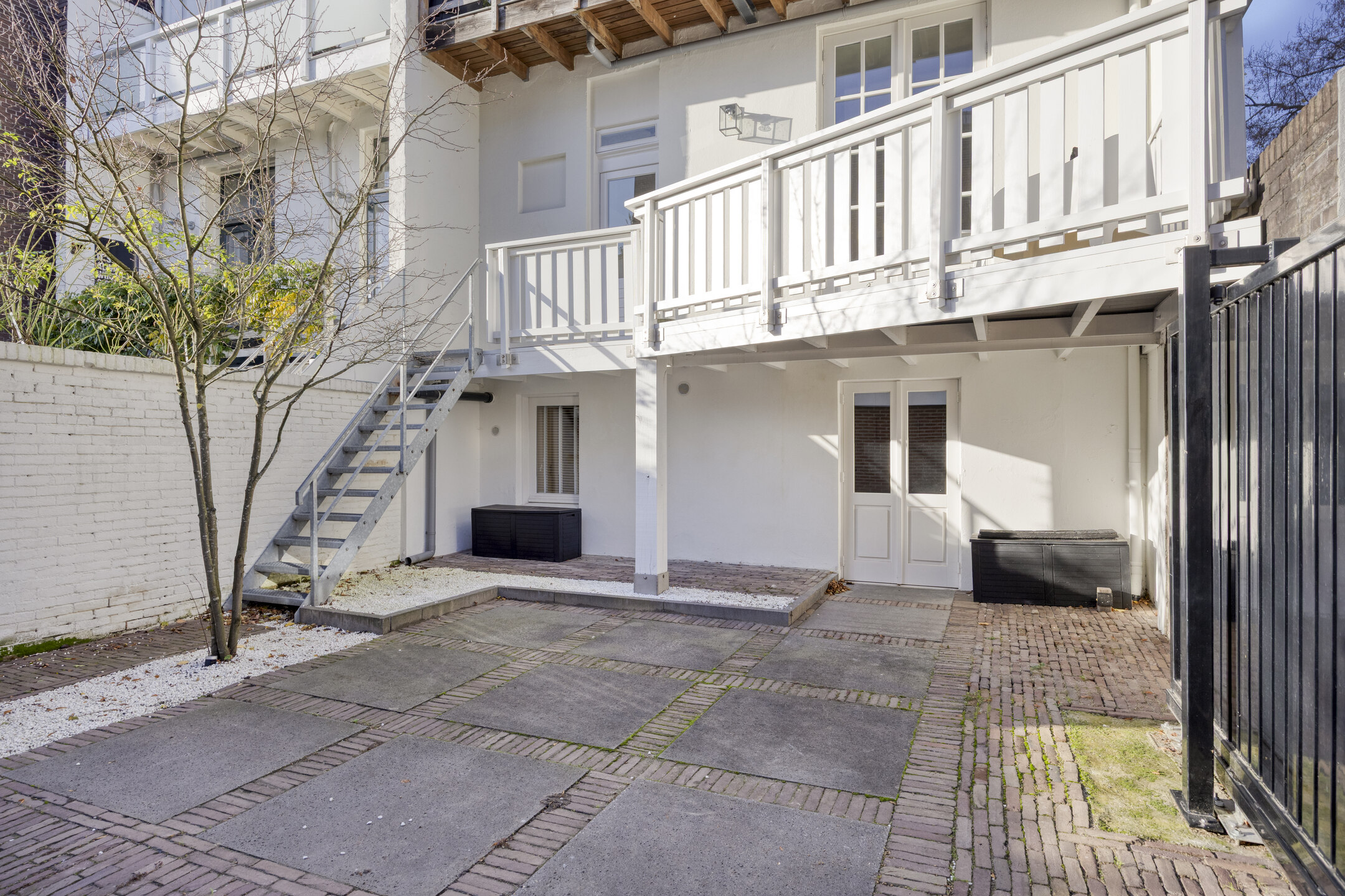 De besloten tuin beneden is omsloten door stadsmuren en voorzien van een hardhouten terras, tuinbank, verlichting en elektra. De grote stenen berging met dubbele deuren biedt ruimte voor bijvoorbeeld een motor of bakfiets.