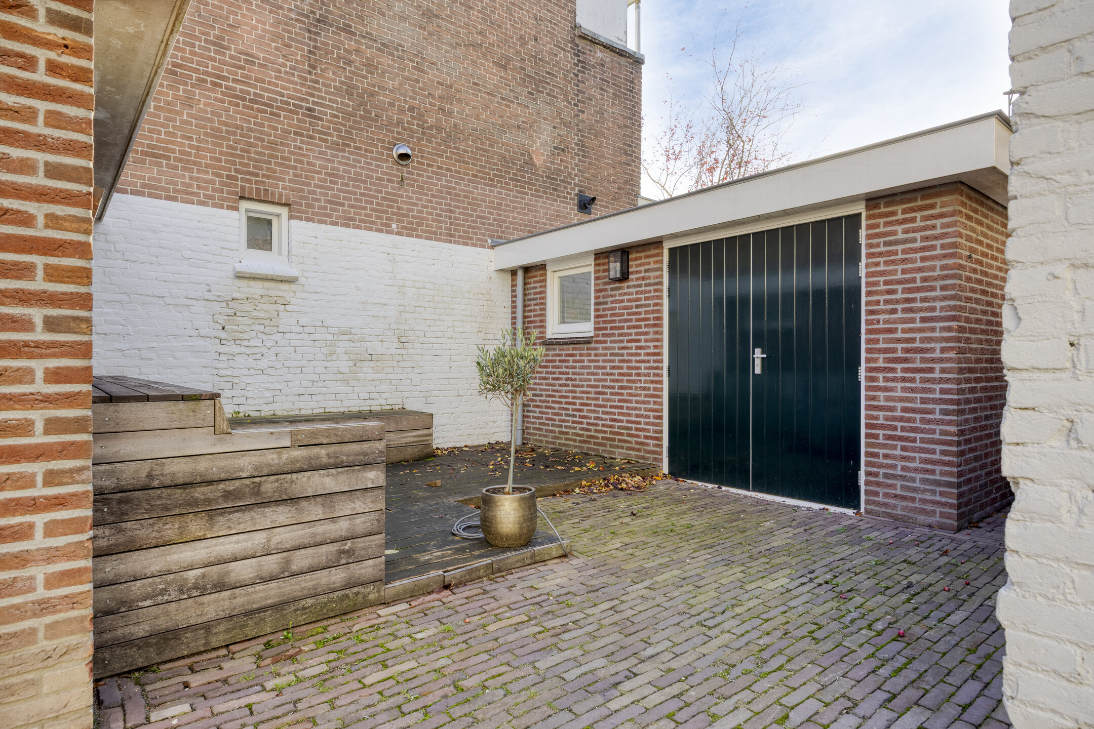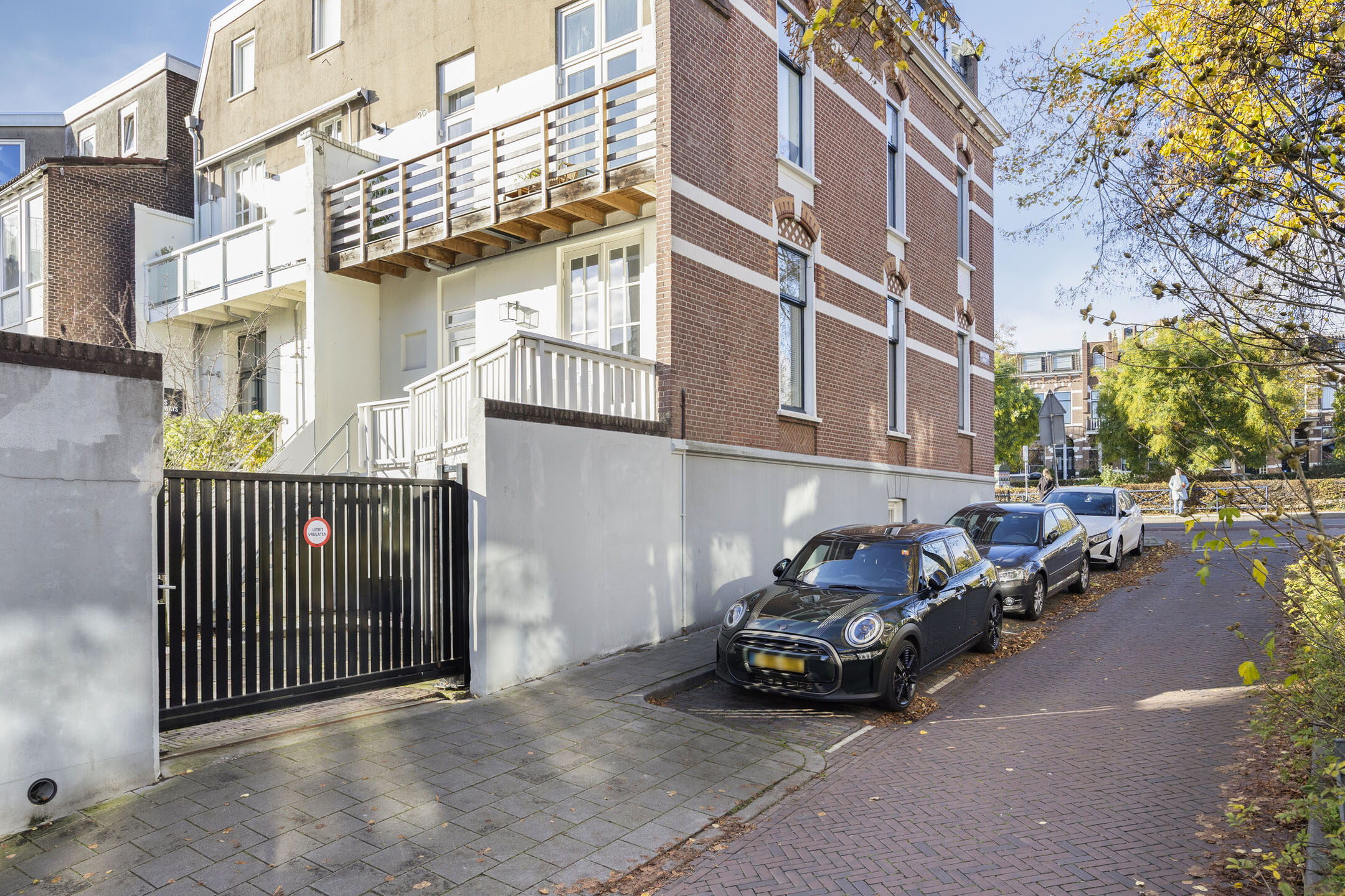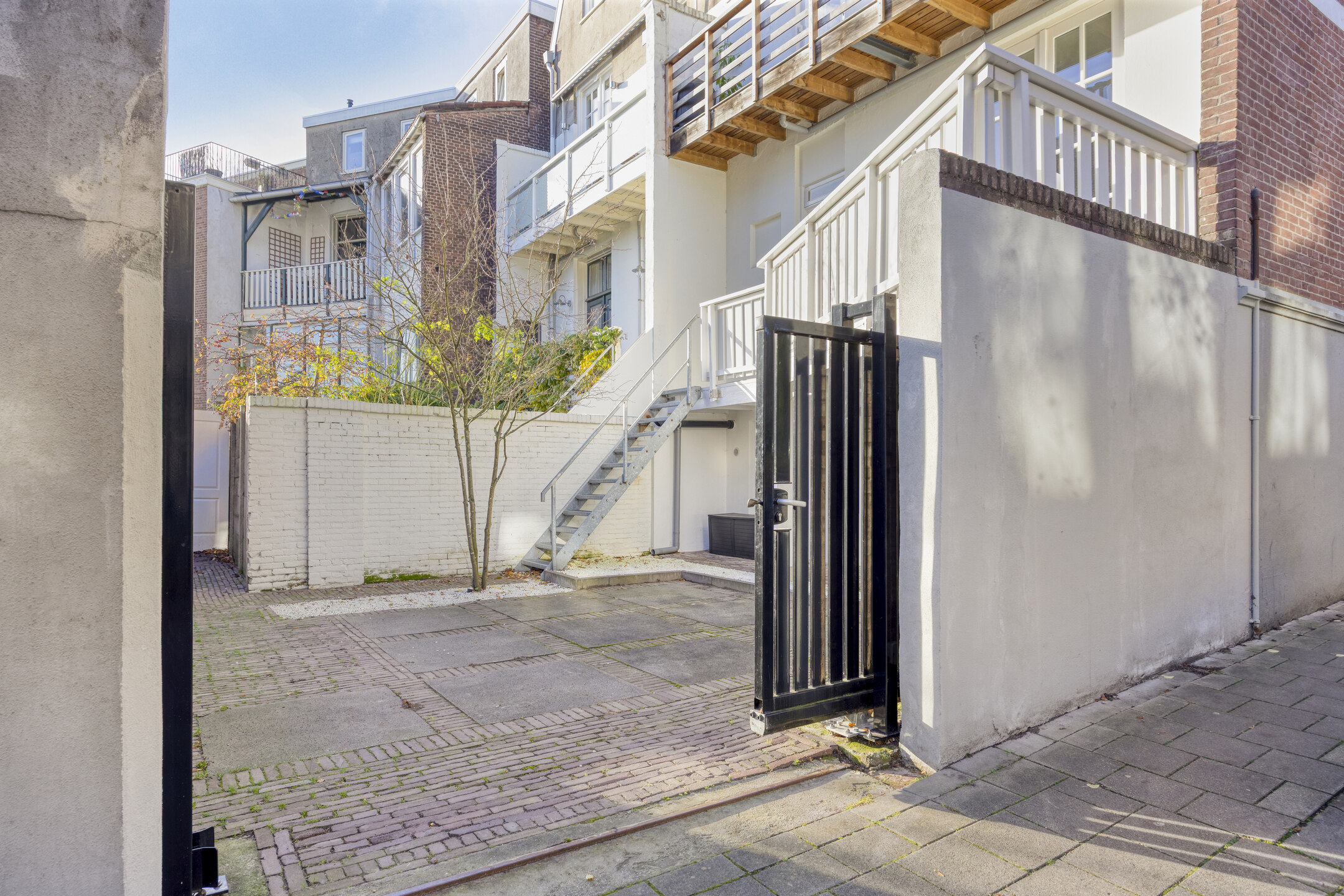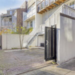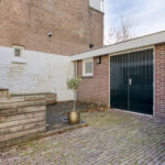 Via de brede poort aan de zijkant is er toegang tot het erf waar ruimte is om een auto op eigen terrein te parkeren.