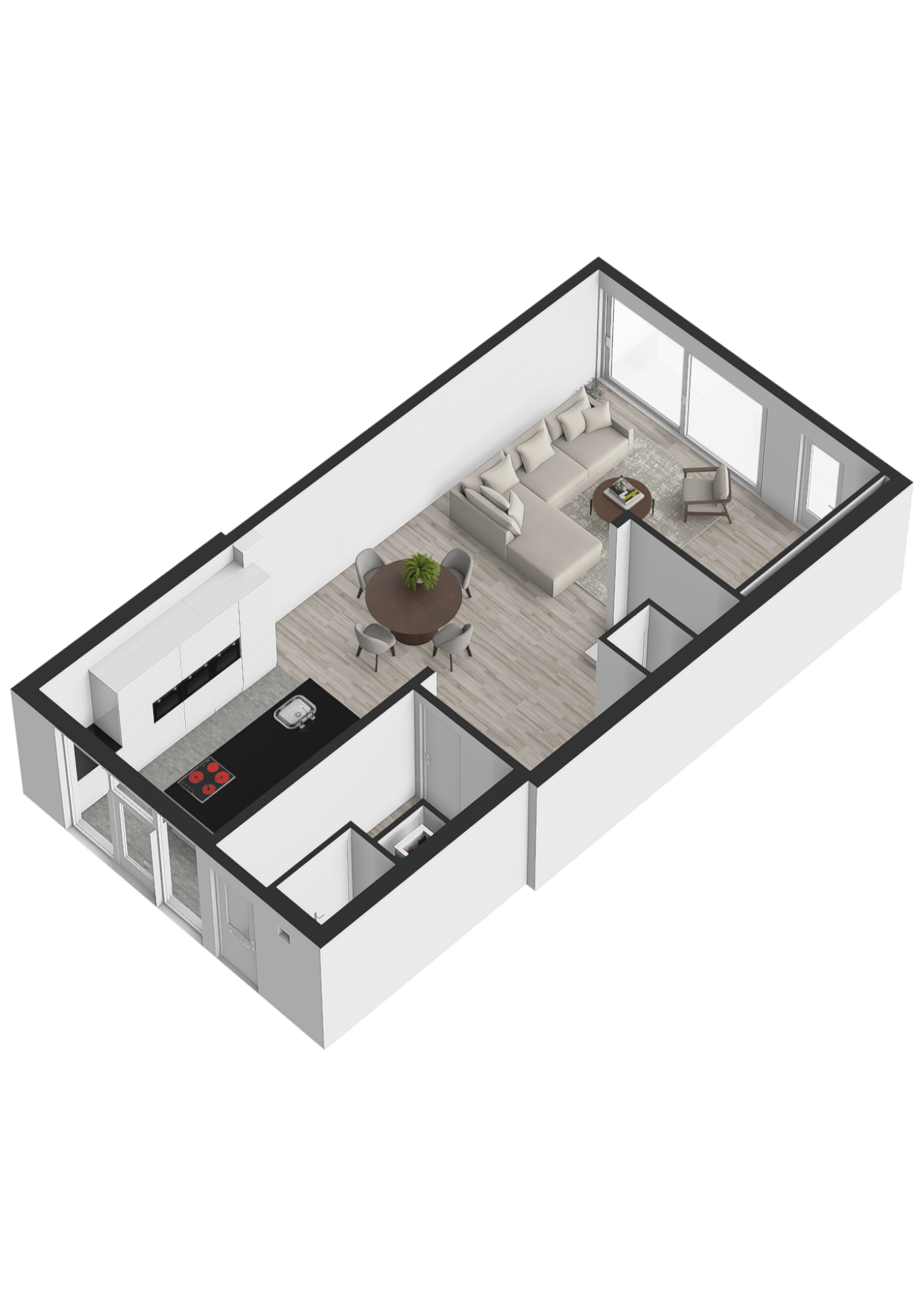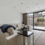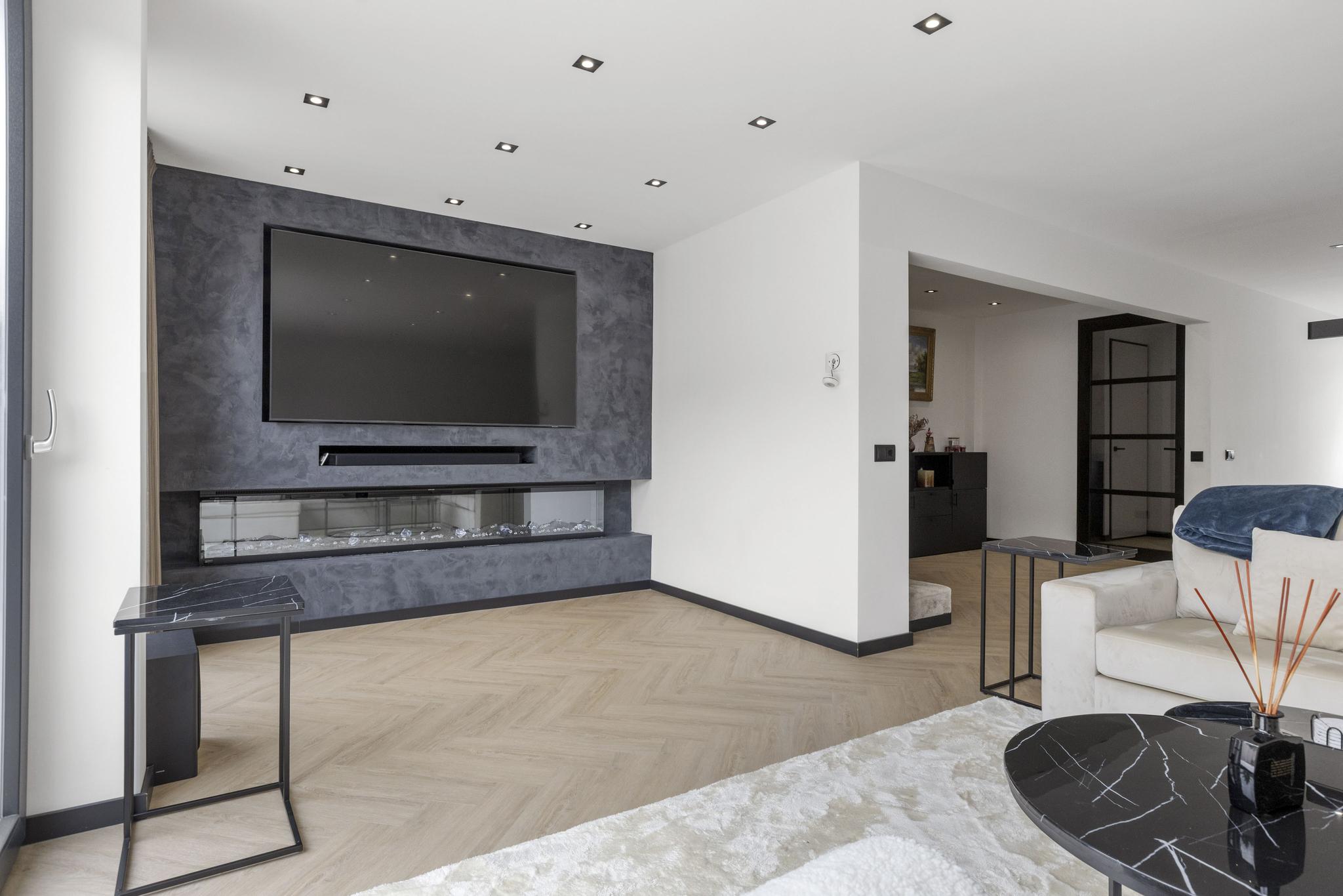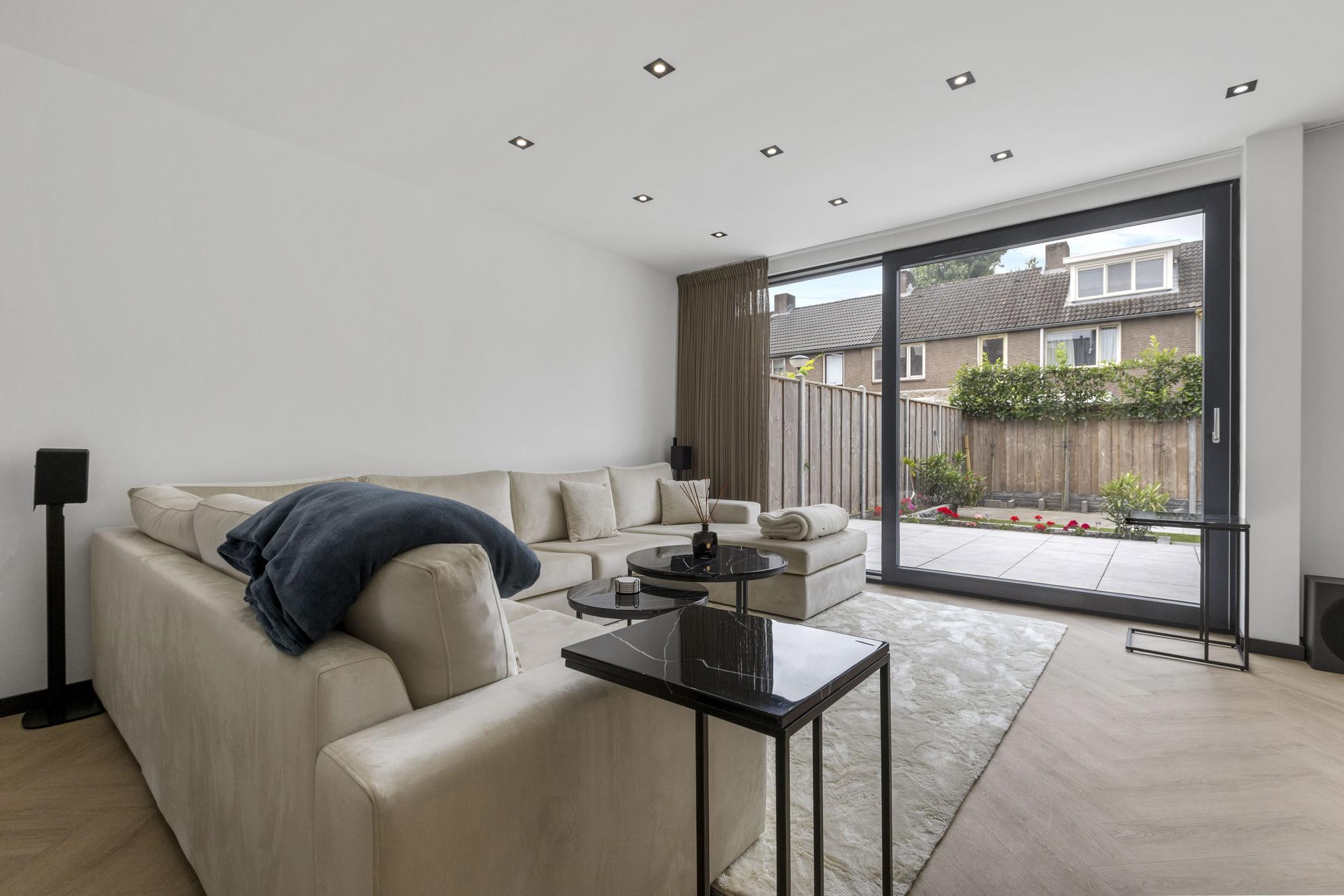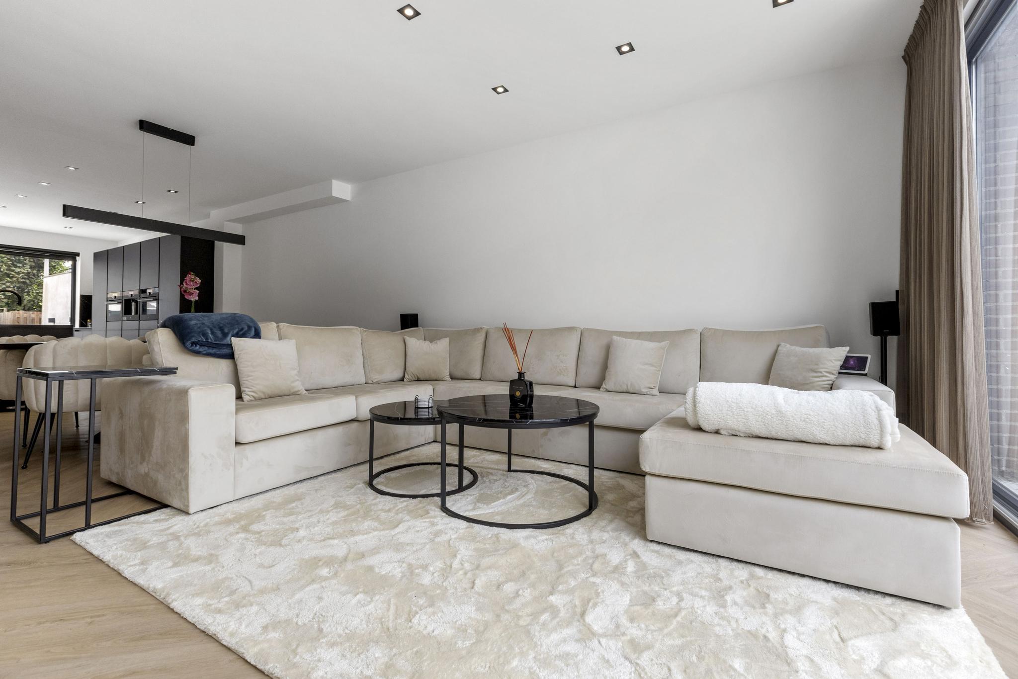 Dankzij de grote ramen tot aan de vloer in de keuken én woonkamer geniet je hier van een heerlijke lichtinval en een vrije verbinding met de tuin. Het woongedeelte sluit perfect aan op de leefkeuken en is een fijne plek om te ontspannen of gasten te ontvangen.