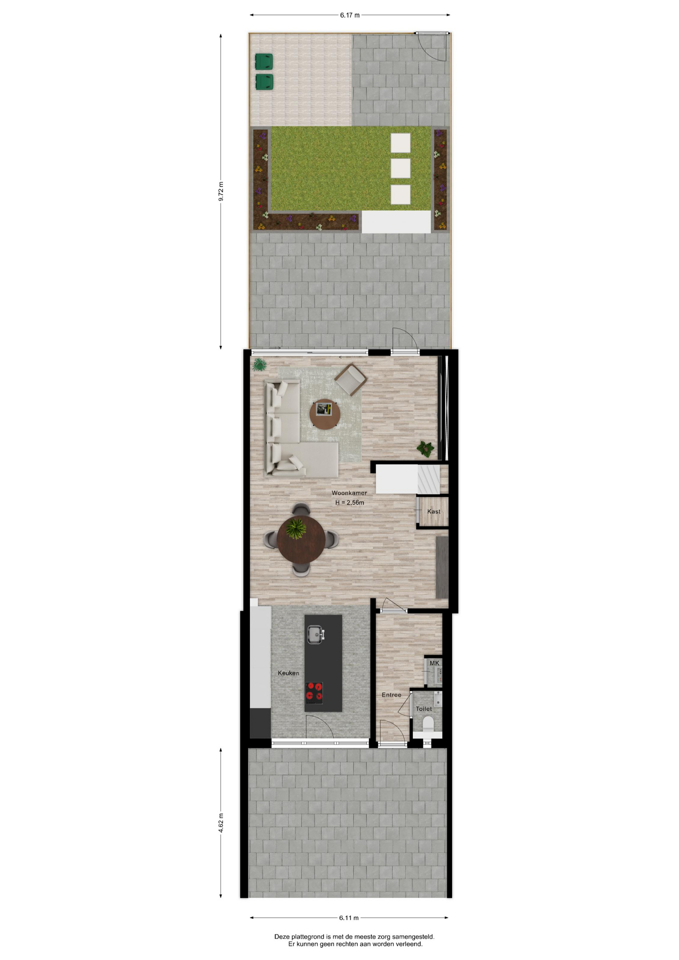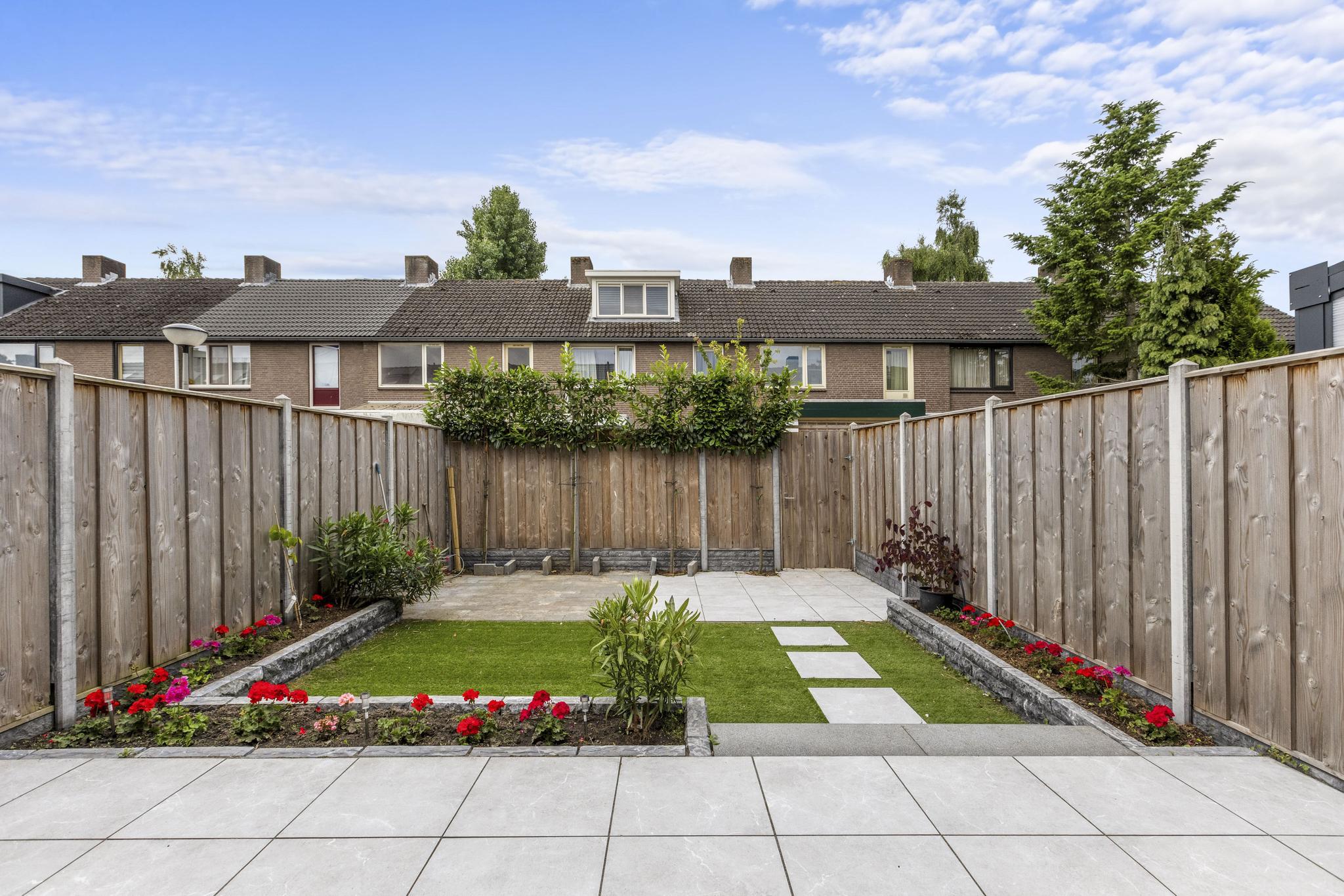 De verzorgde tuin is voorzien van een achterom. Een heerlijke plek om te loungen, tuinieren of buiten te eten met vrienden en familie. De ligging van de tuin is georiënteerd op het zuidwesten.