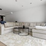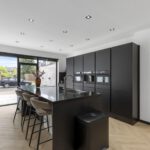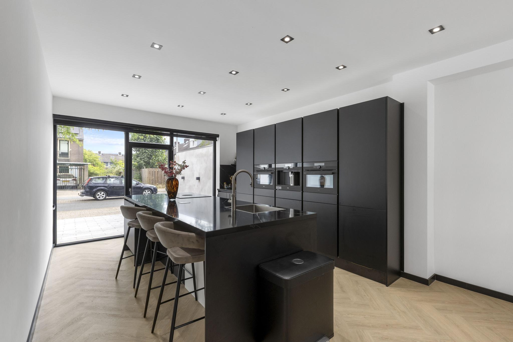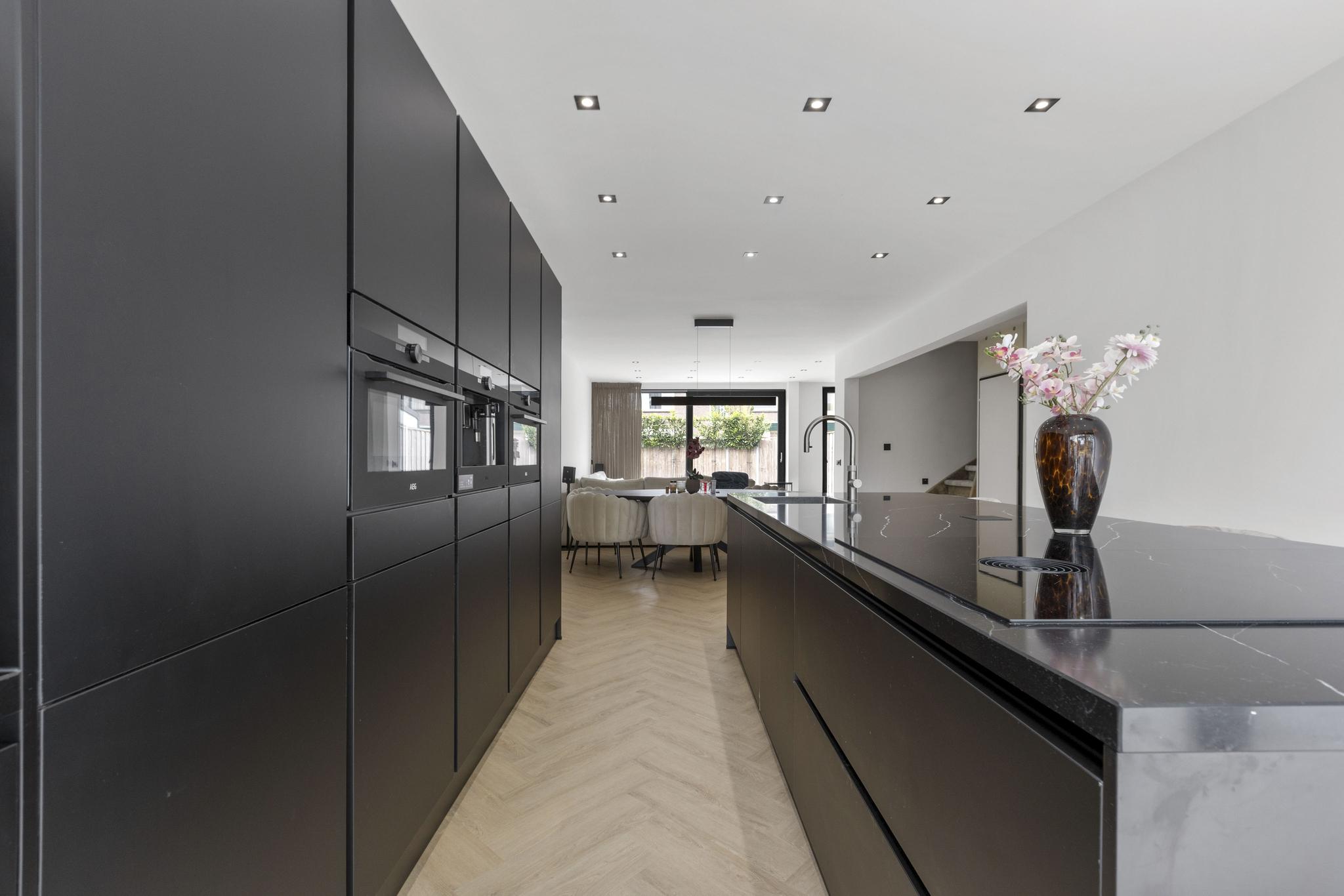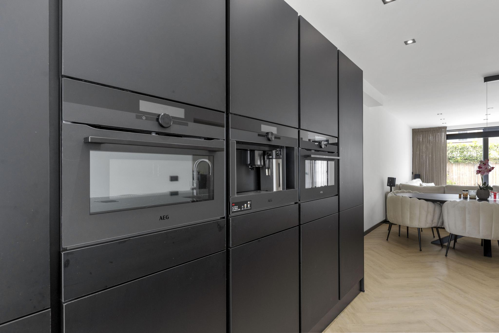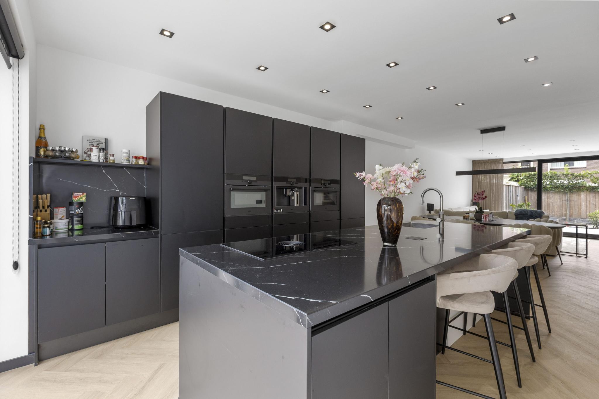 De royale leefkeuken vormt het kloppend hart van het huis: strak vormgegeven met een imposant kookeiland, hoogwaardige inbouwapparatuur zoals een Quooker, drie ovens, koffiemachine, vaatwasser en ruime koel- en vrieskasten. De slimme indeling biedt volop opbergruimte en laat niets te wensen over.