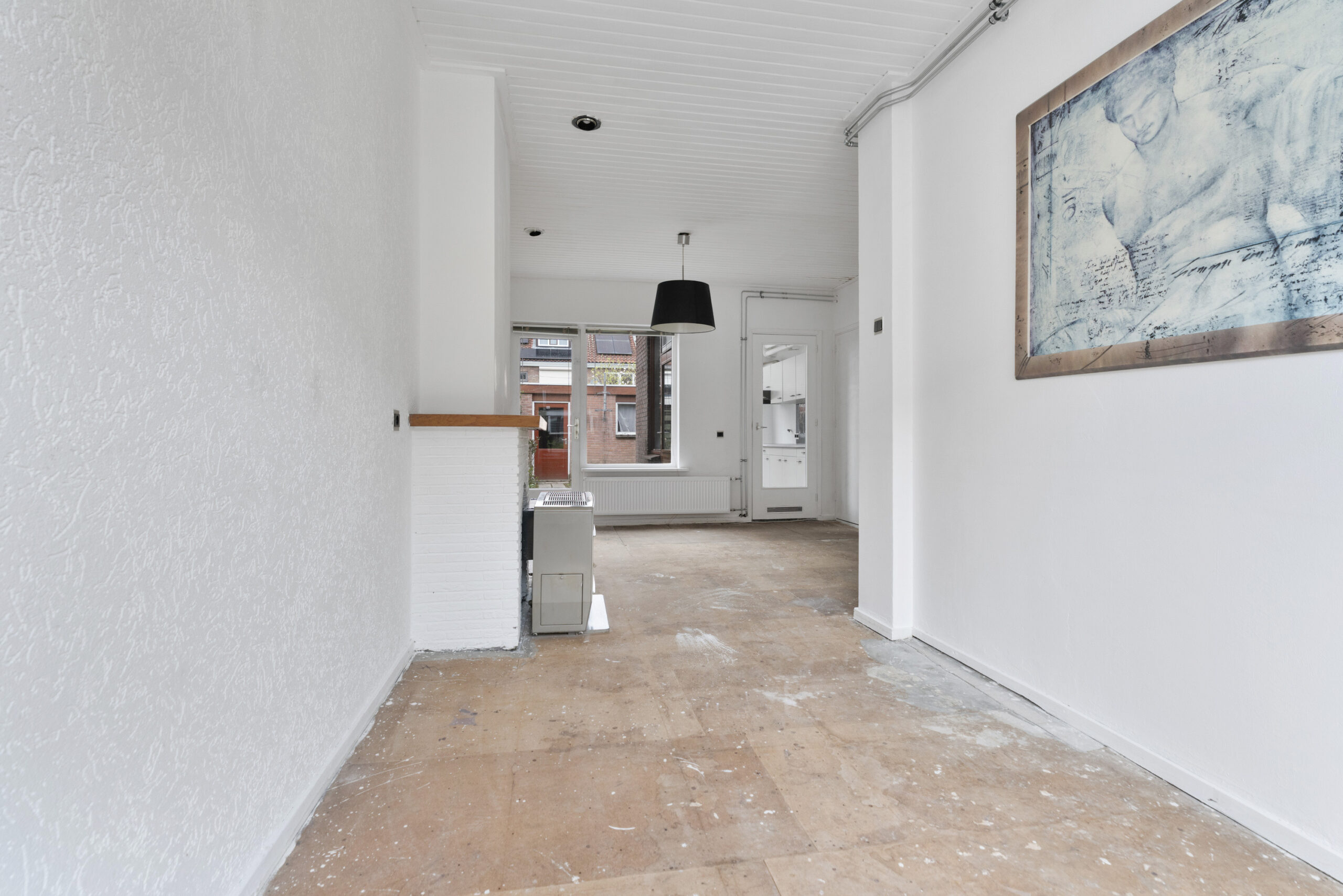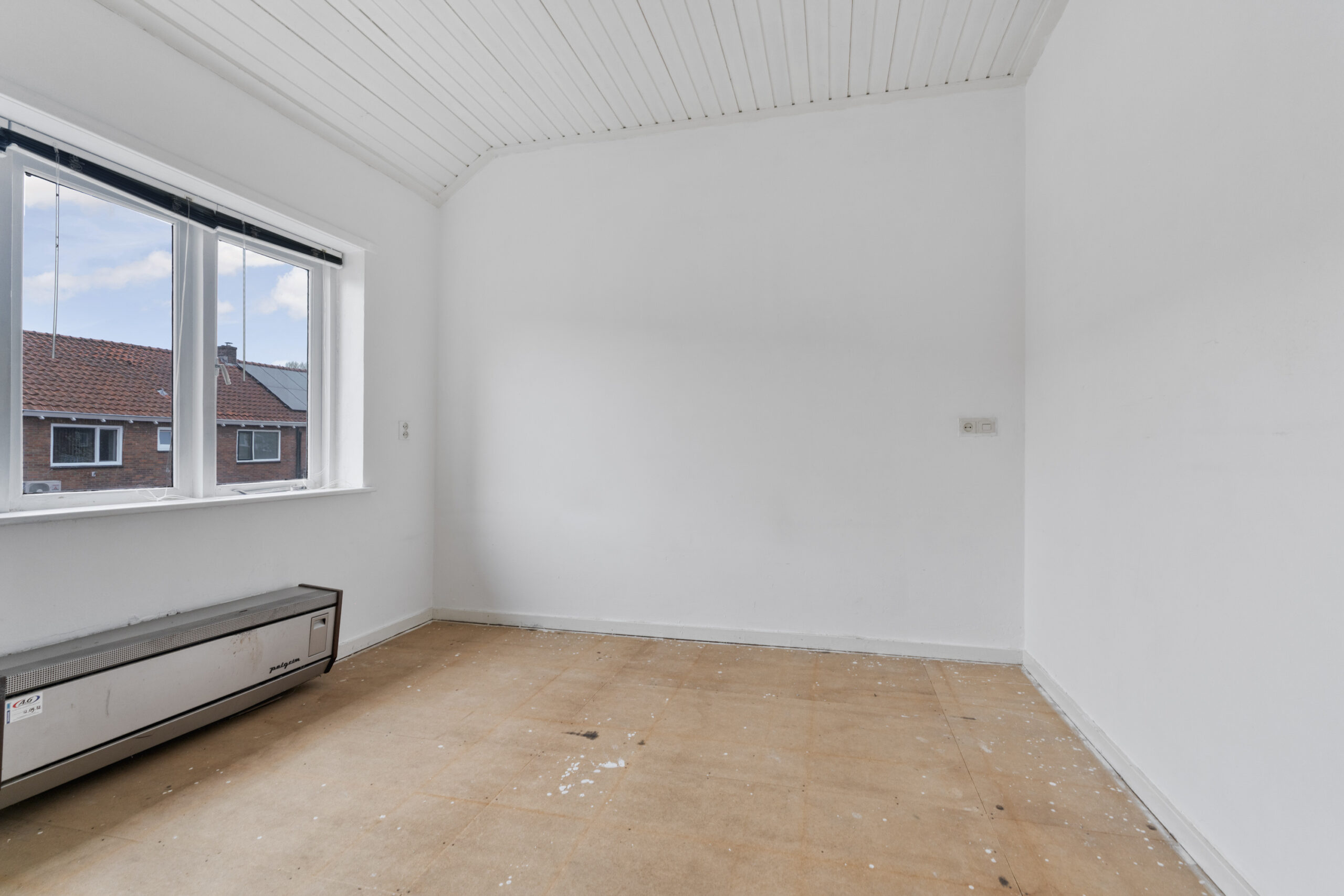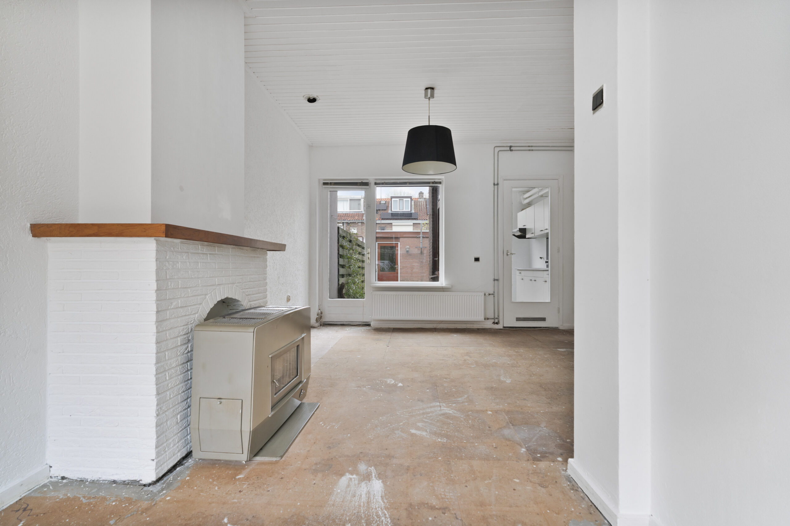 De woning zelf biedt volop mogelijkheden, maar dient wel gemoderniseerd te worden. Je komt binnen in de hal met toegang tot de trap naar de eerste verdieping, een praktische trapkast en het toilet. De woonkamer is voorzien van een gaskachel en biedt een goede basis voor een sfeervolle leefruimte. Aan de achterzijde bevindt zich de keuken in de uitbouw, waar tevens een nieuwe cv-ketel is geplaatst.