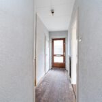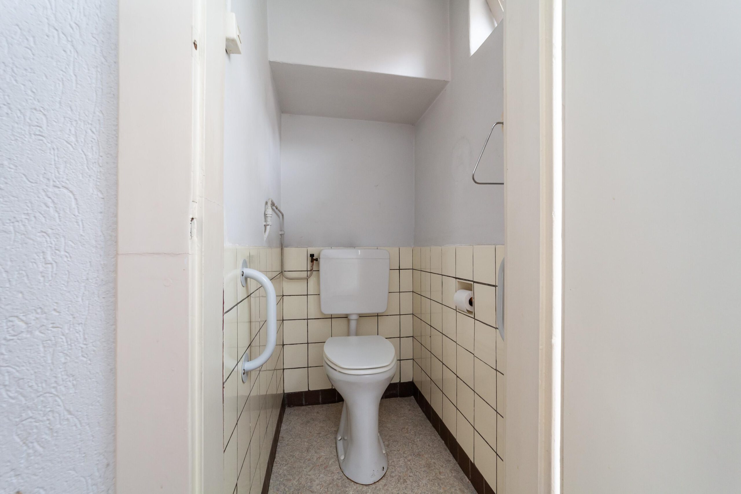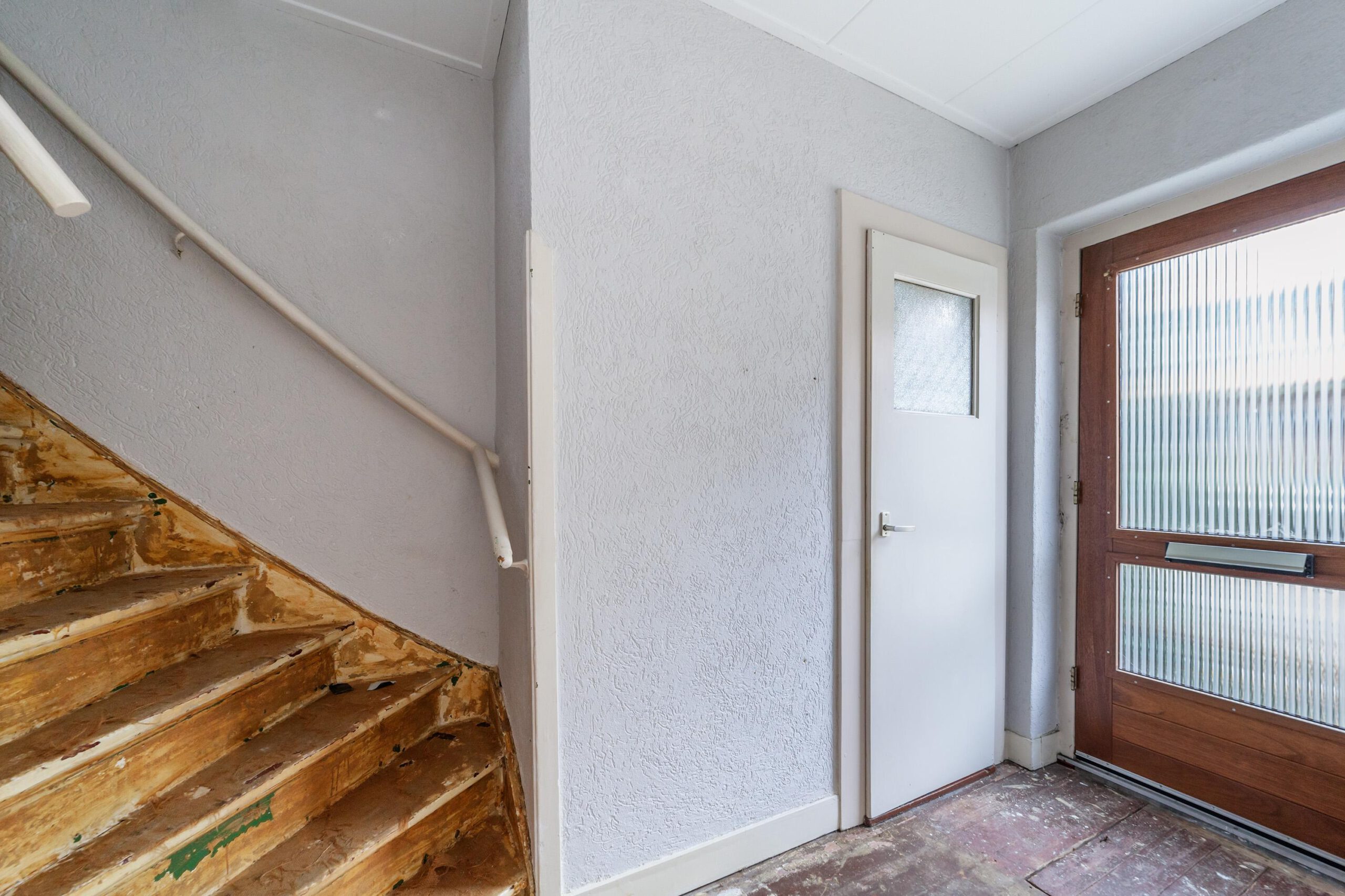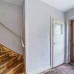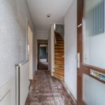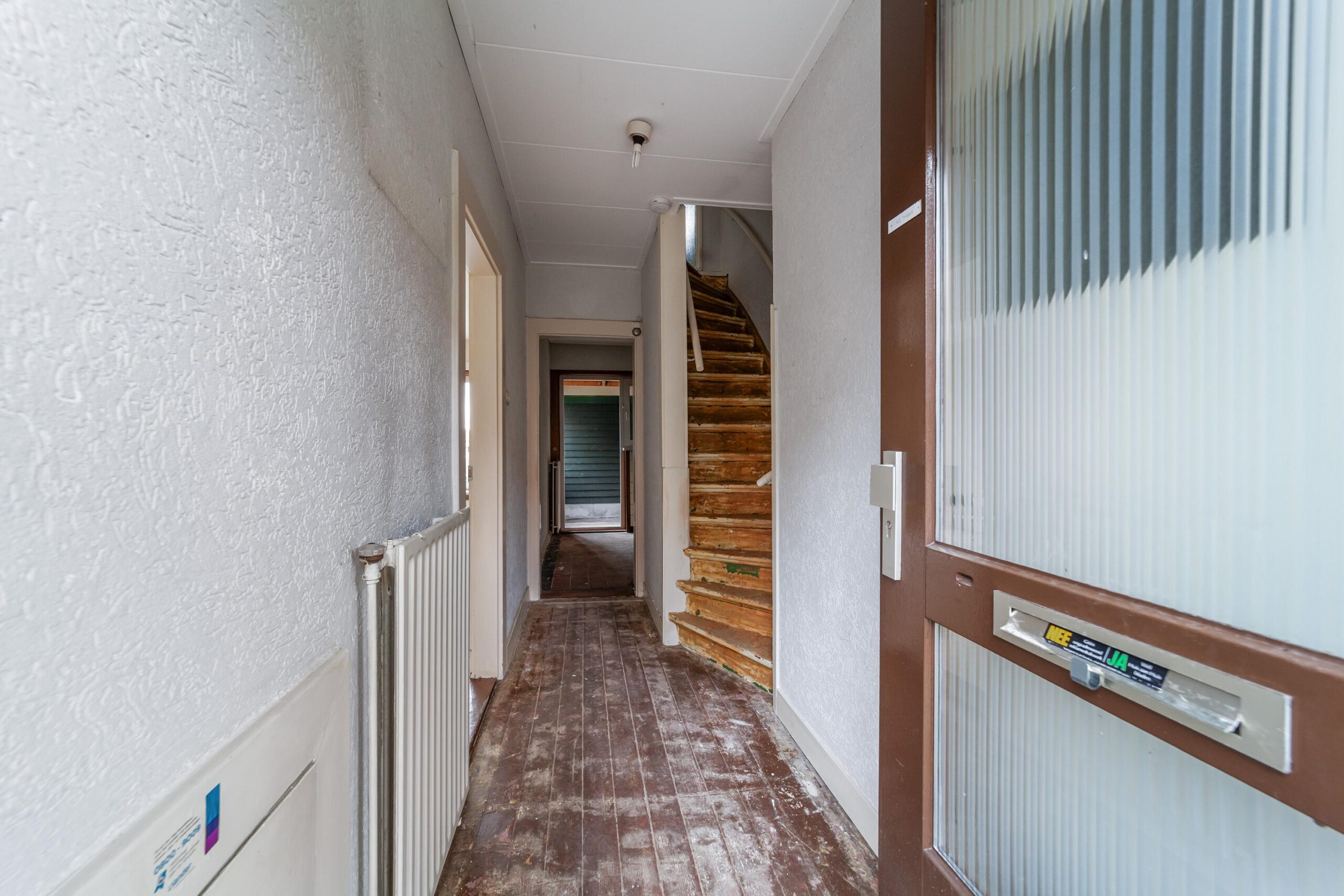 Entree, hal, toilet, trap, trapkast met groepenkast, deur naar woonkamer met open keuken.