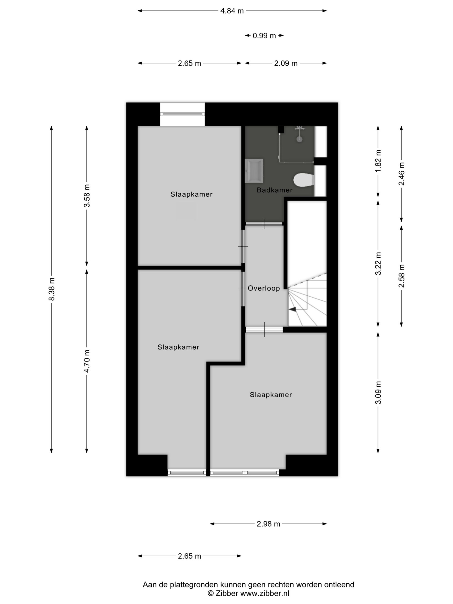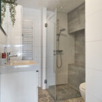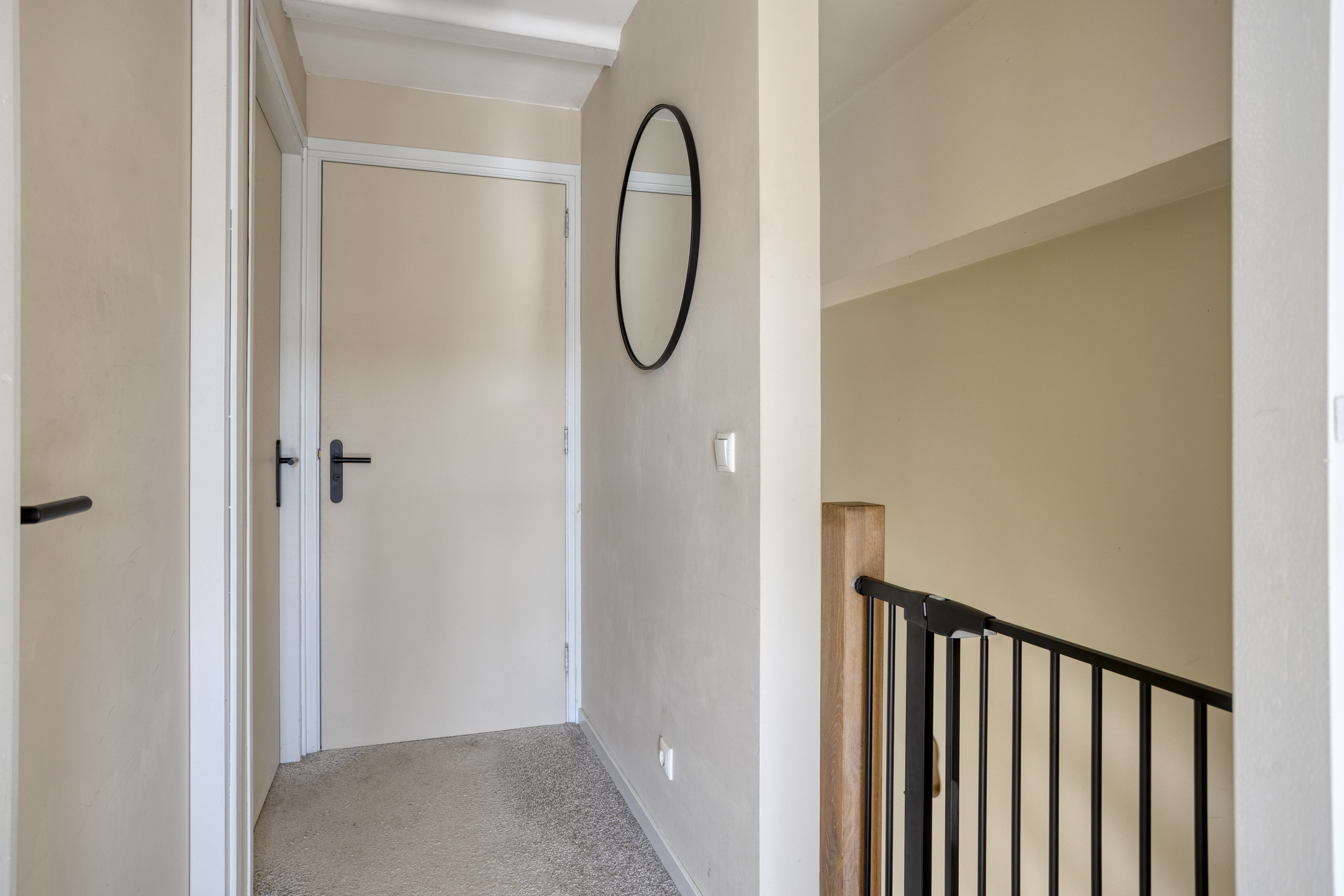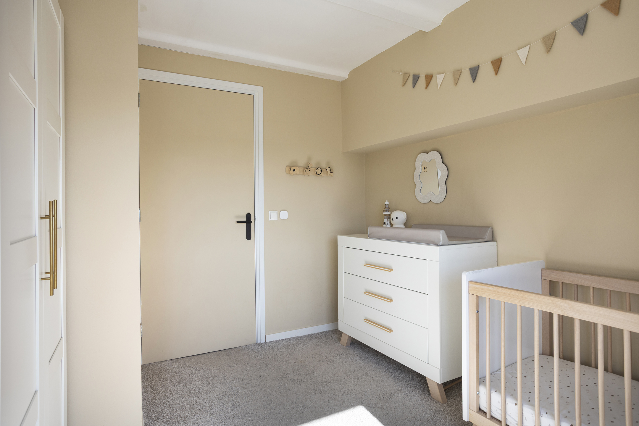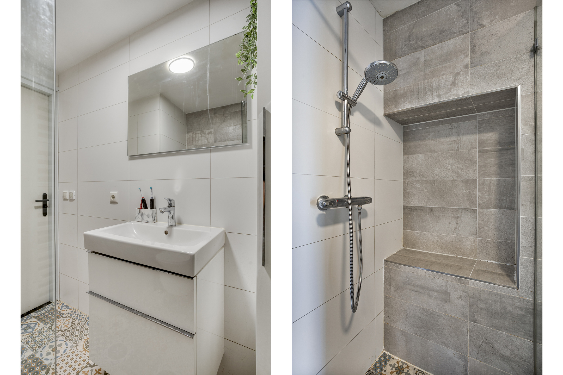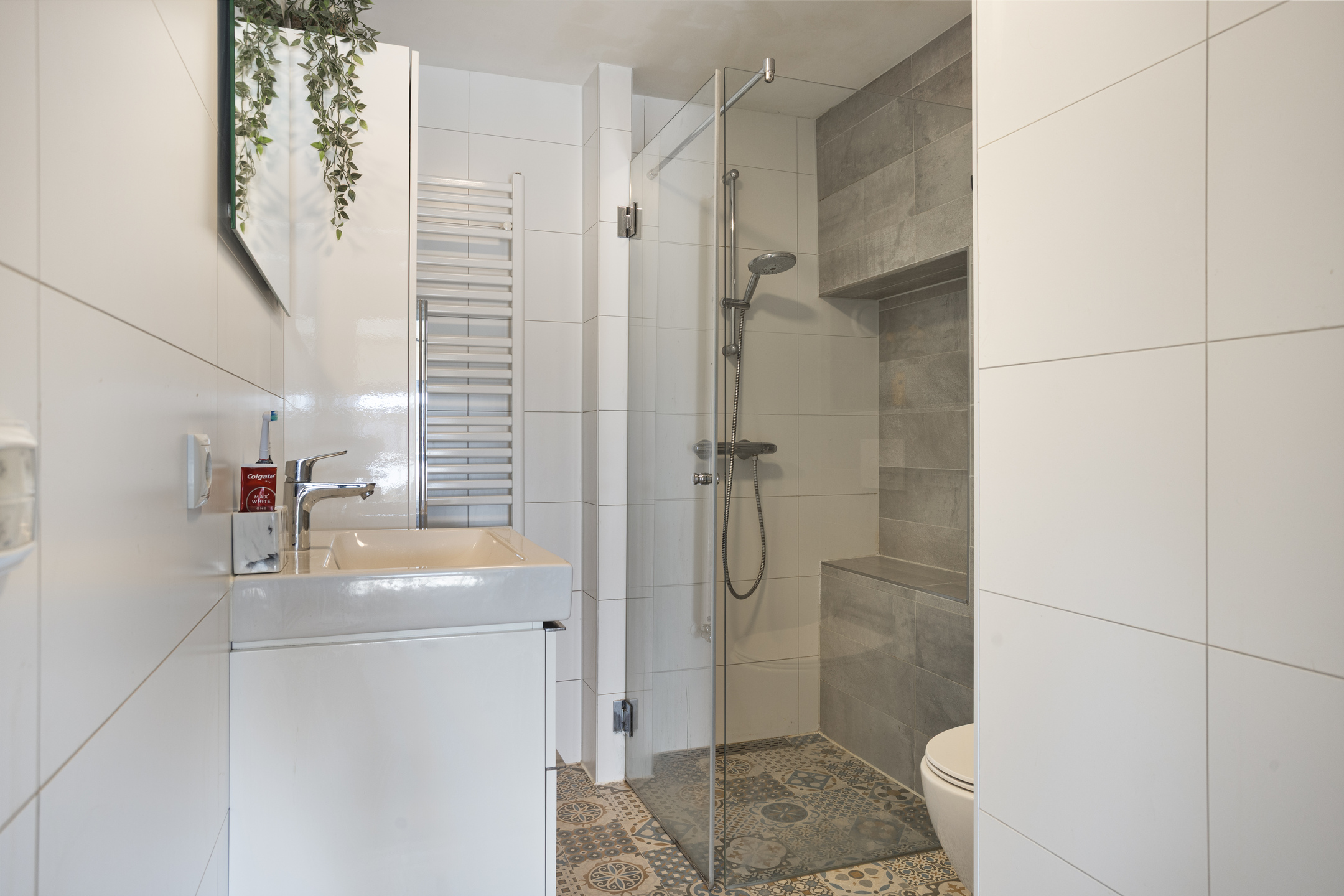 Op de eerste verdieping bevinden zich drie slaapkamers en een badkamer, die bereikbaar zijn via de overloop. Ideaal voor gezinnen of voor wie een extra werk- of hobbyruimte zoekt. De moderne badkamer is compleet uitgerust met een tweede toilet, inloopdouche en een wastafel met meubel, strak en verzorgd.