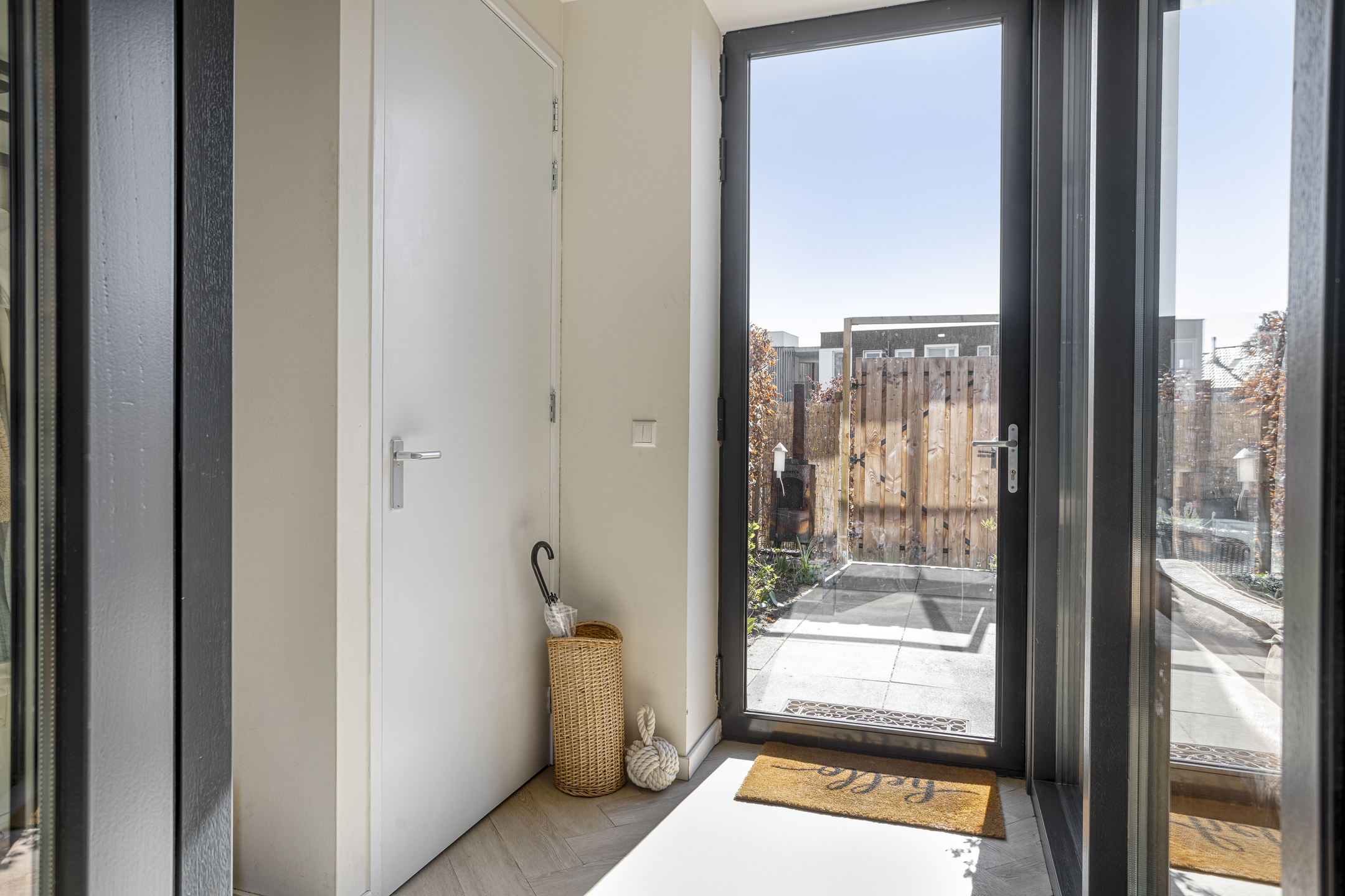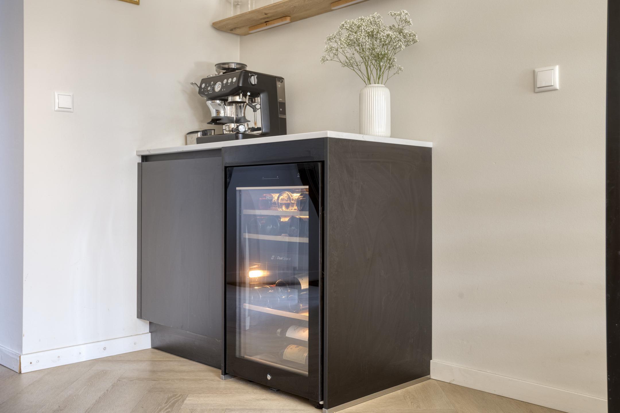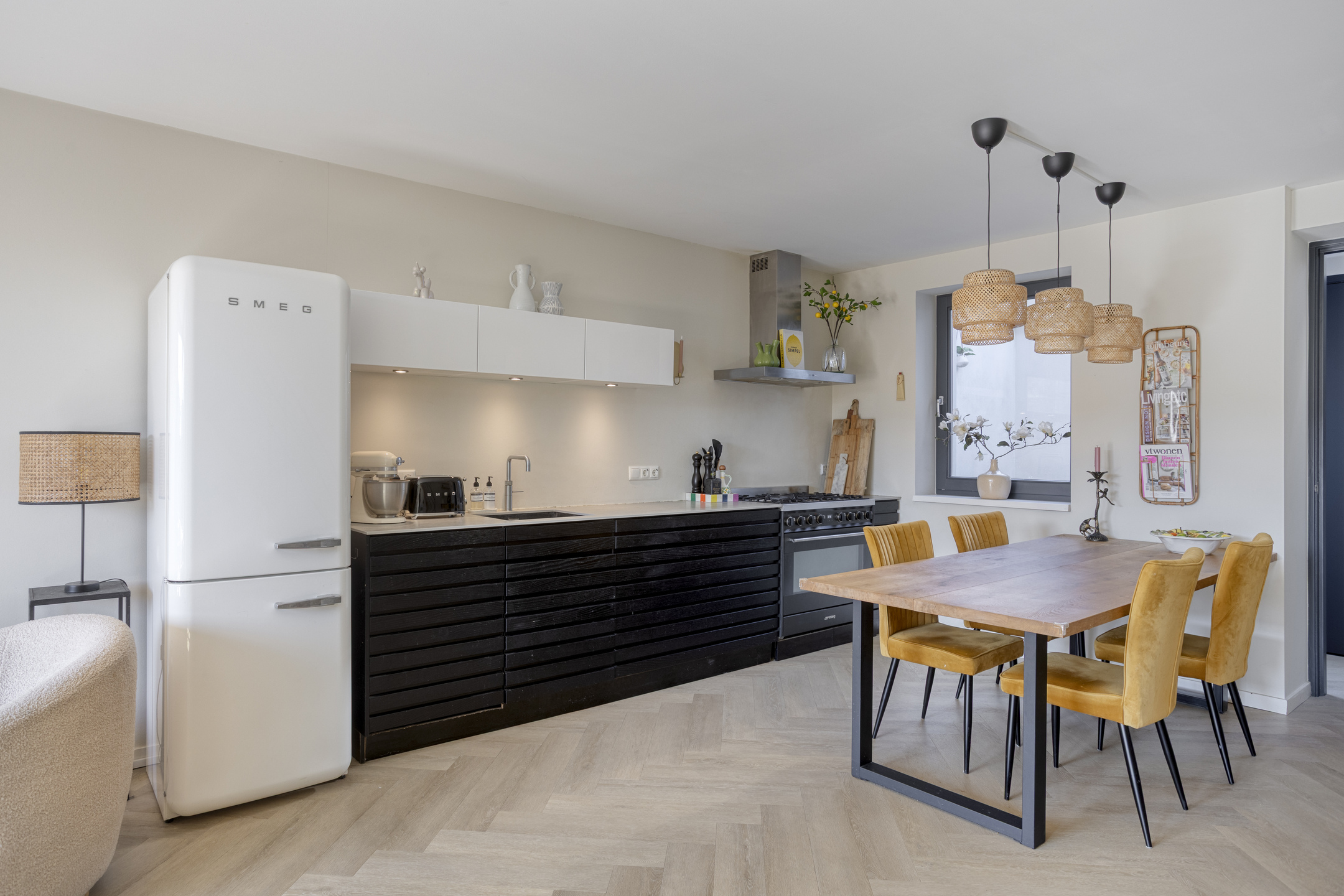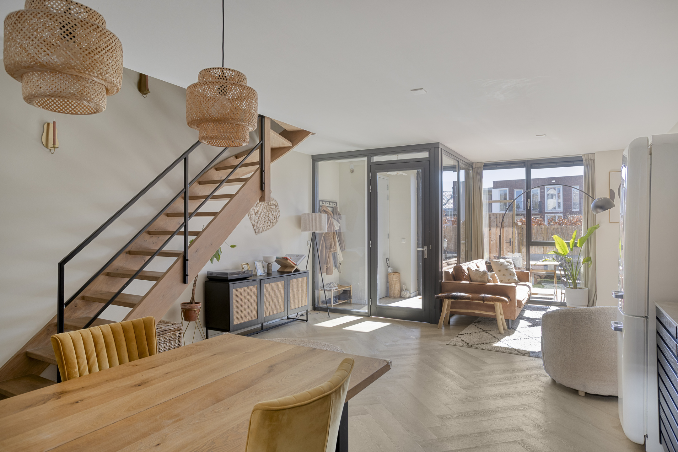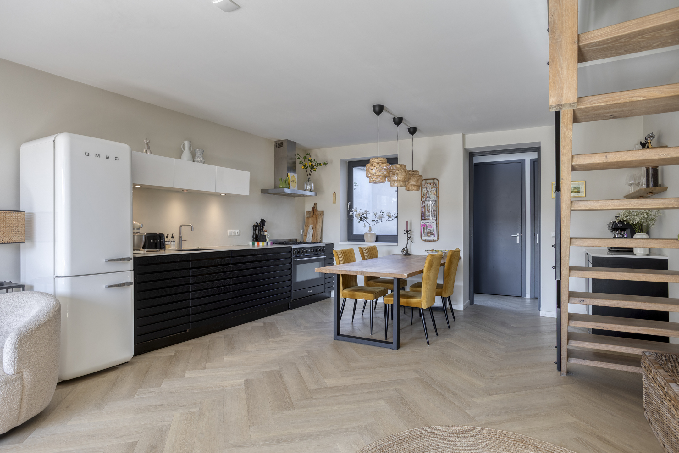 De begane grond biedt een royale open leefruimte met een stijlvolle visgraatvloer en comfortabele vloerverwarming. De moderne open keuken is uitgerust met hoogwaardige inbouwapparatuur (Smeg, Bosch en Quooker) en beschikt over een sfeervolle coffee corner. De woning is in 2017 gerealiseerd en in 2023/2024 volledig gemoderniseerd. Aan de achterzijde bevindt zich een hal met apart toilet en een praktische ruimte voor de wasmachine, droger en cv-installatie. Vanuit hier bereik je tevens een knusse, beschutte patio; een fijne plek om even tot rust te komen.