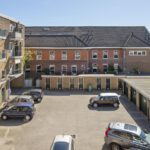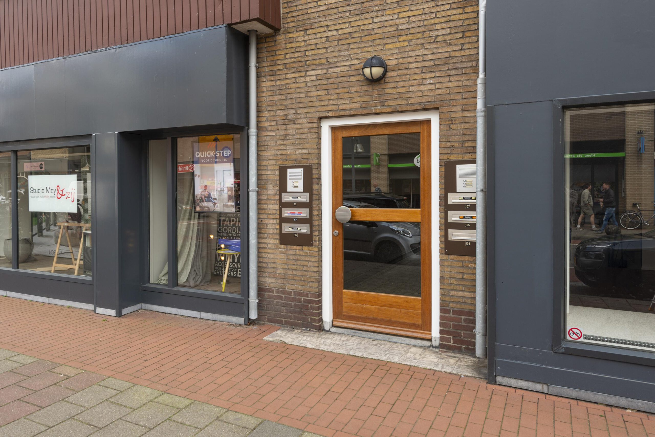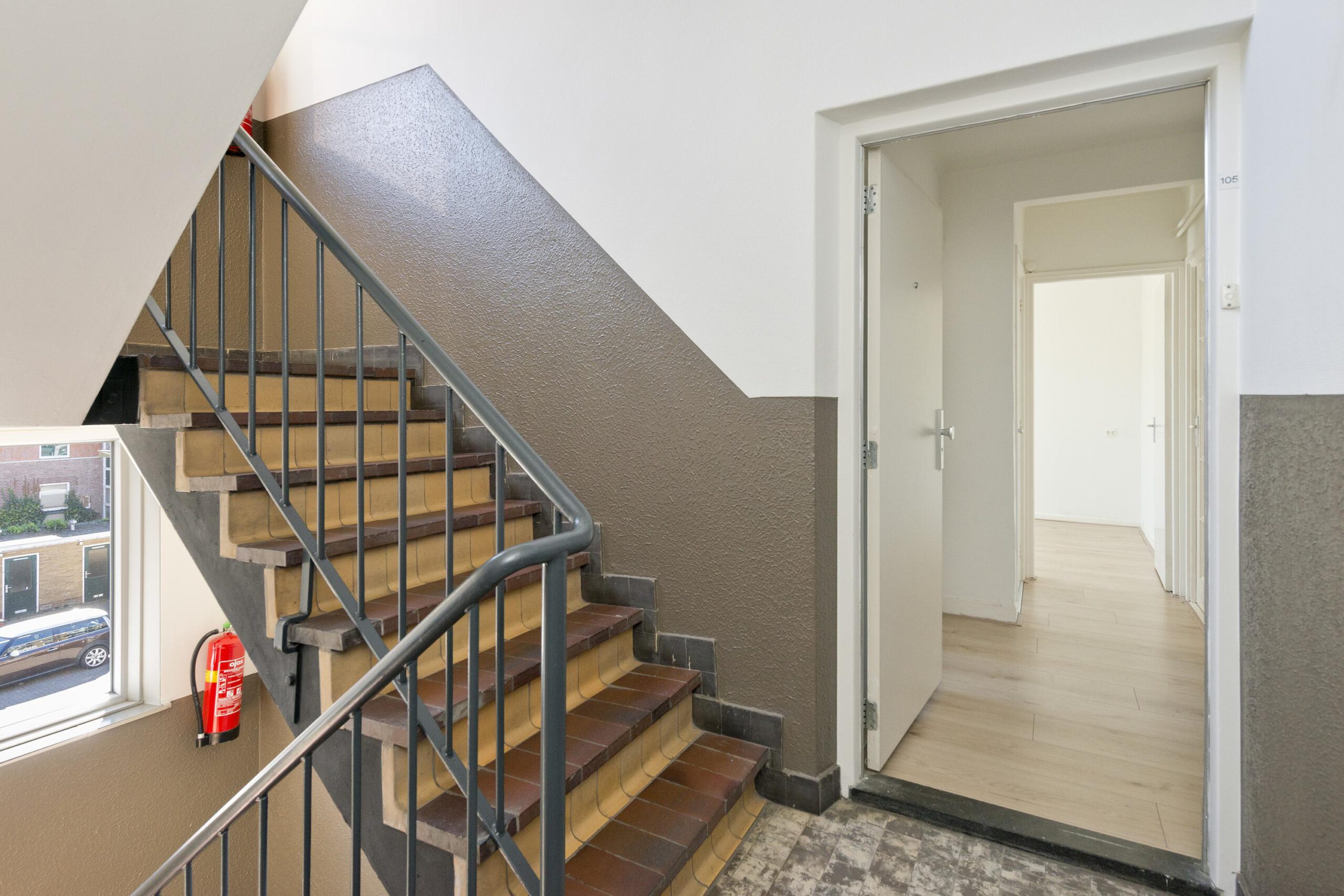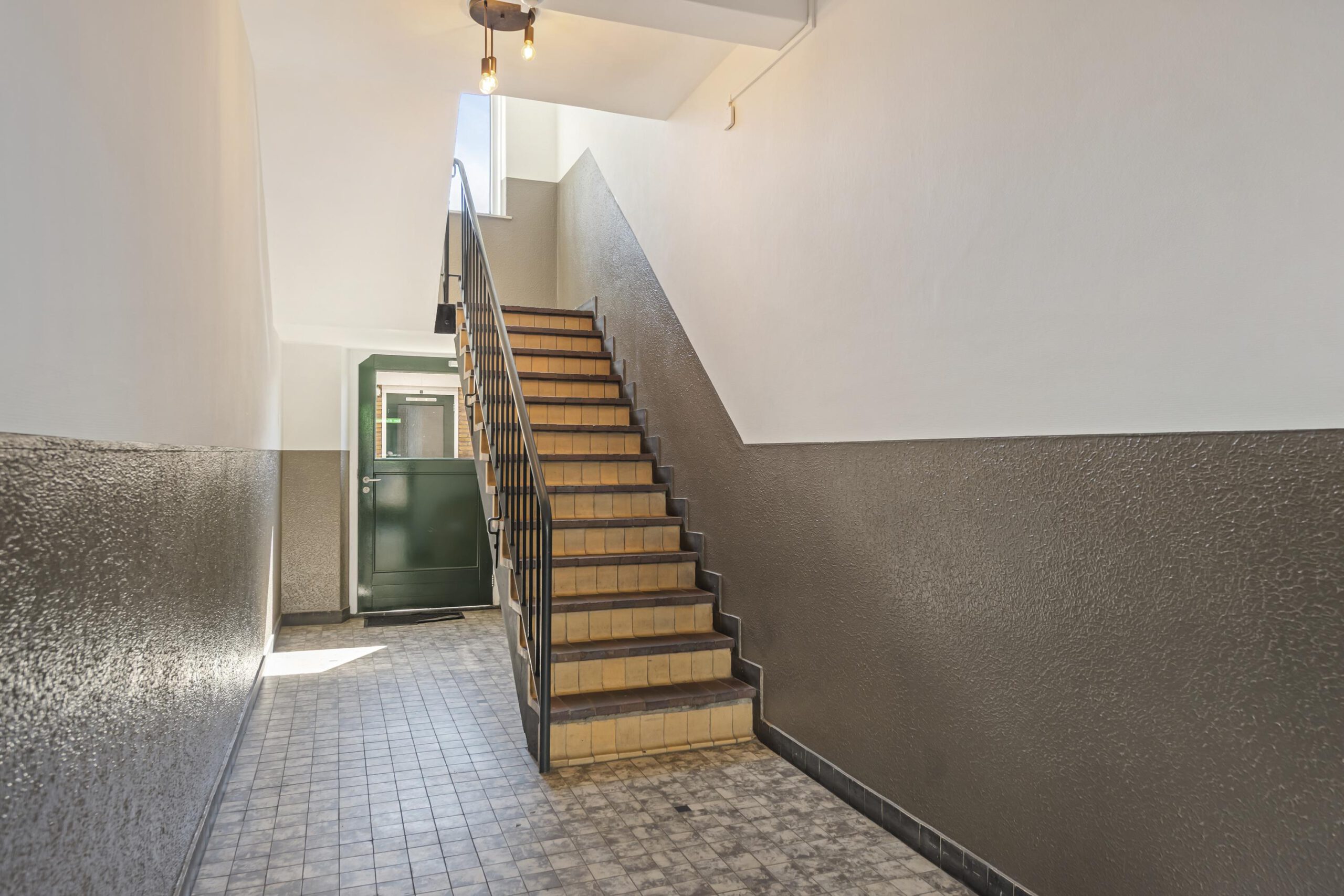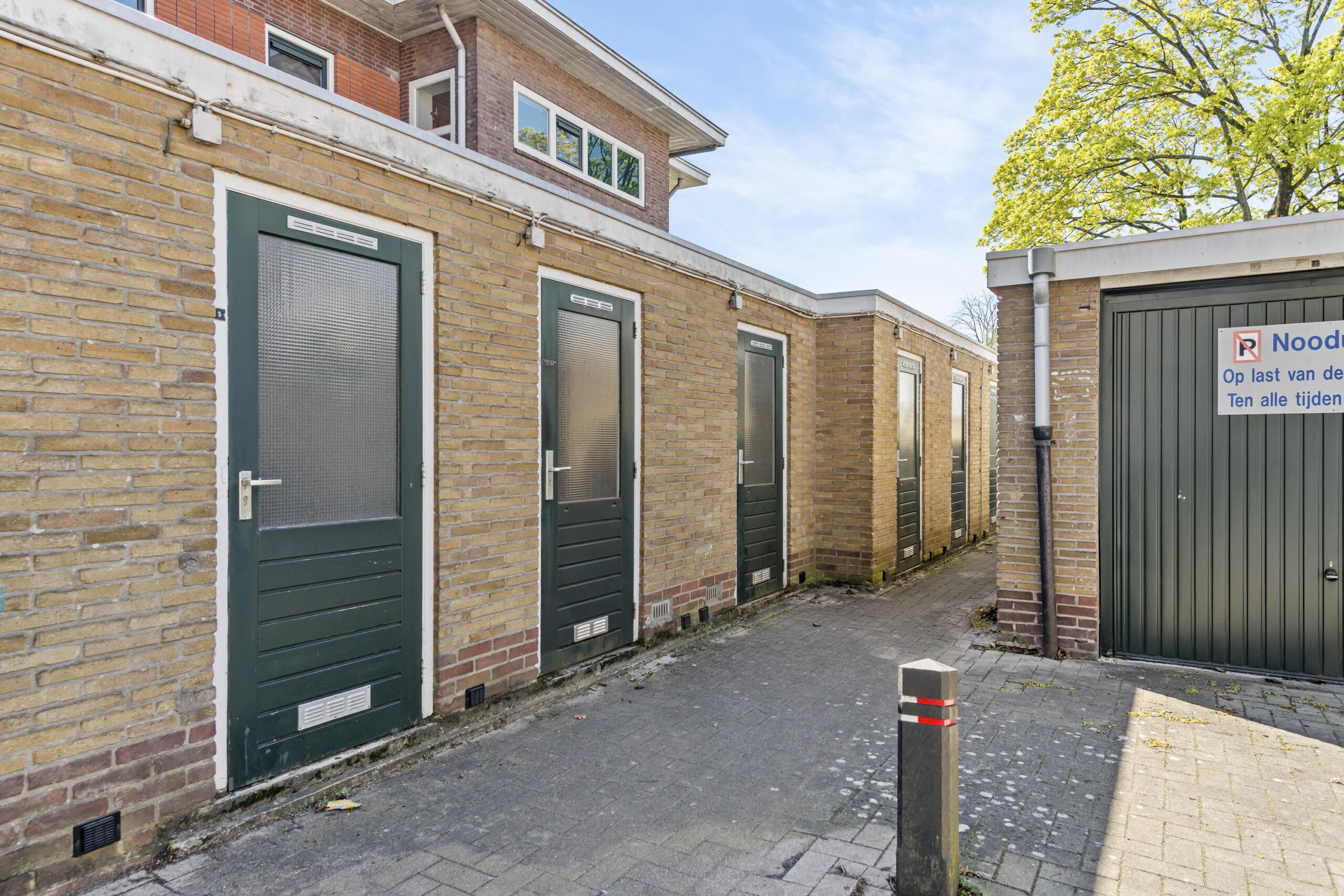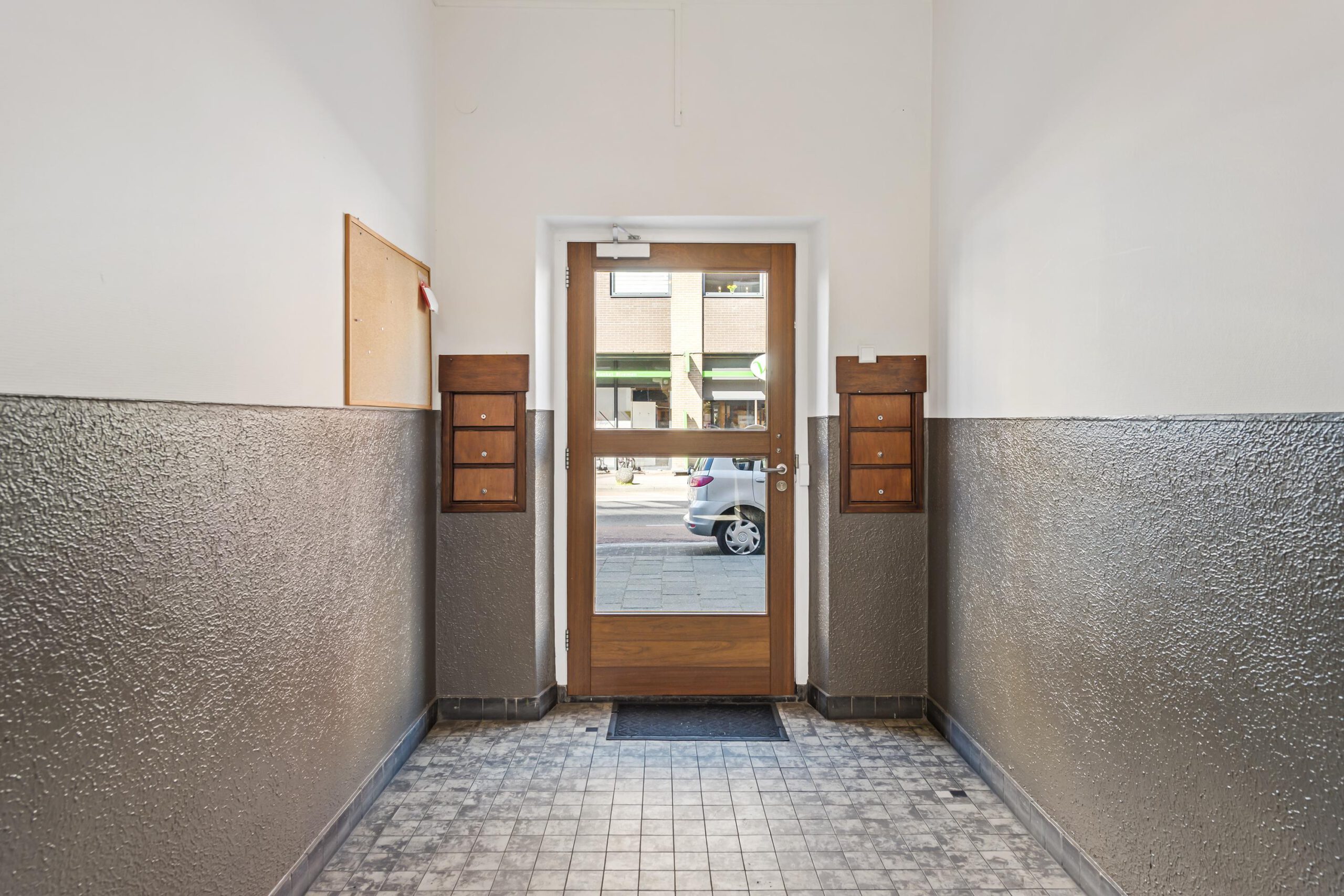 De hoofdentree is afgesloten en kan geopend worden met een intercomsysteem. De centrale hal is ruim en kan via de achterzijde verlaten worden om rechtstreeks bij de bergingen en het binnenterrein te komen.