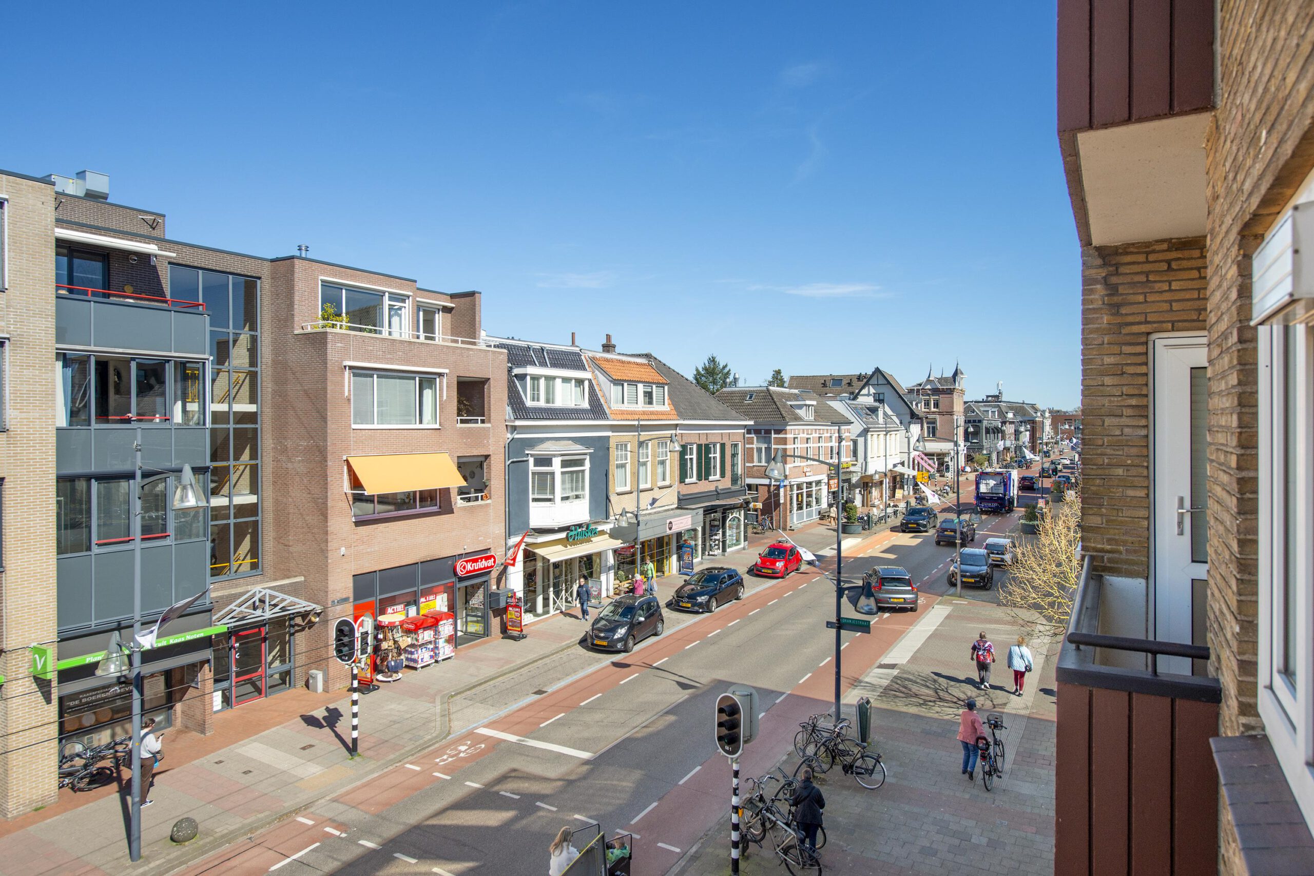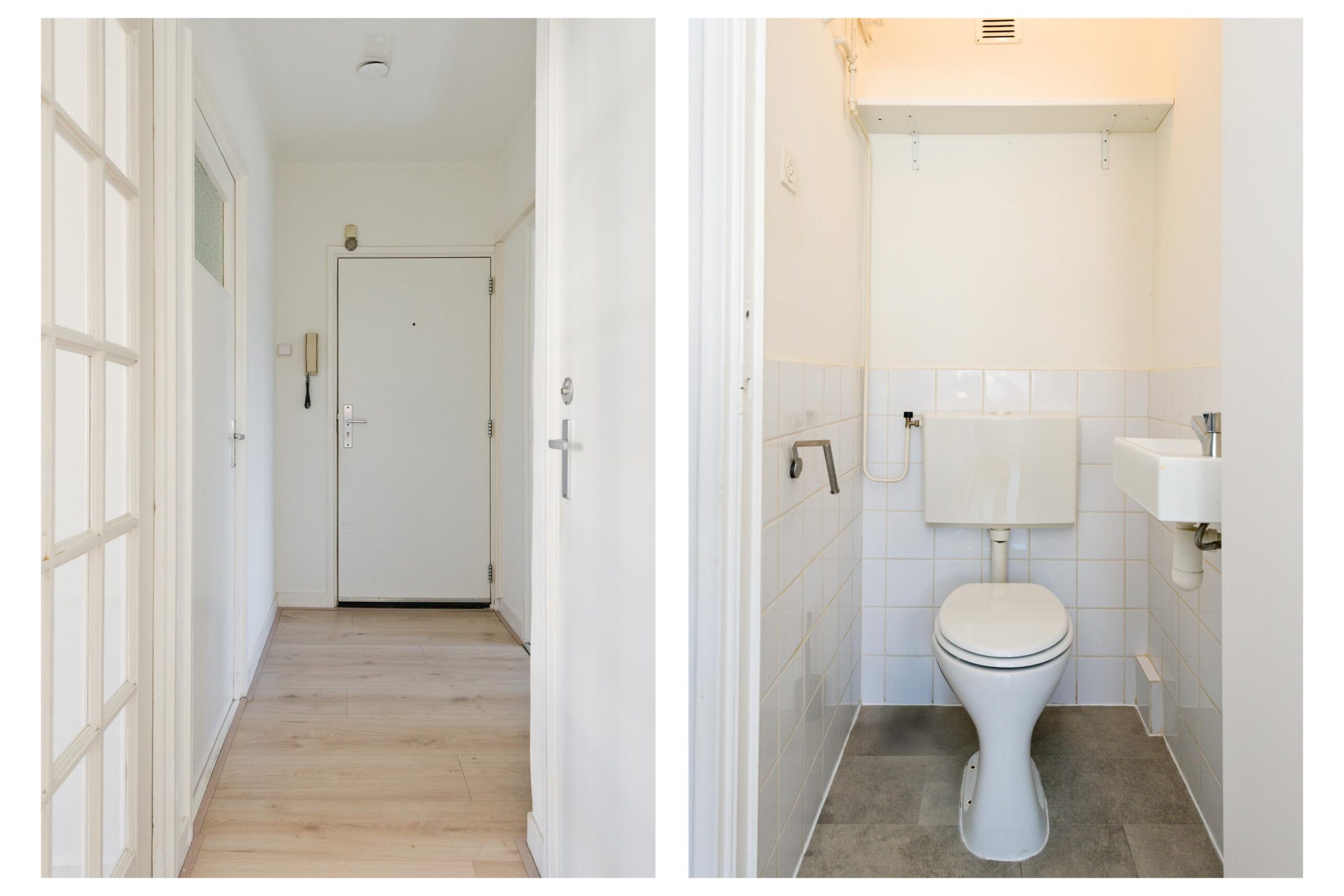 Appartemententree, hal met meterkast en modern toilet, knusse woonkamer met leuk uitzicht over de straat. Dit is ook te volgen vanaf het balkon.