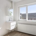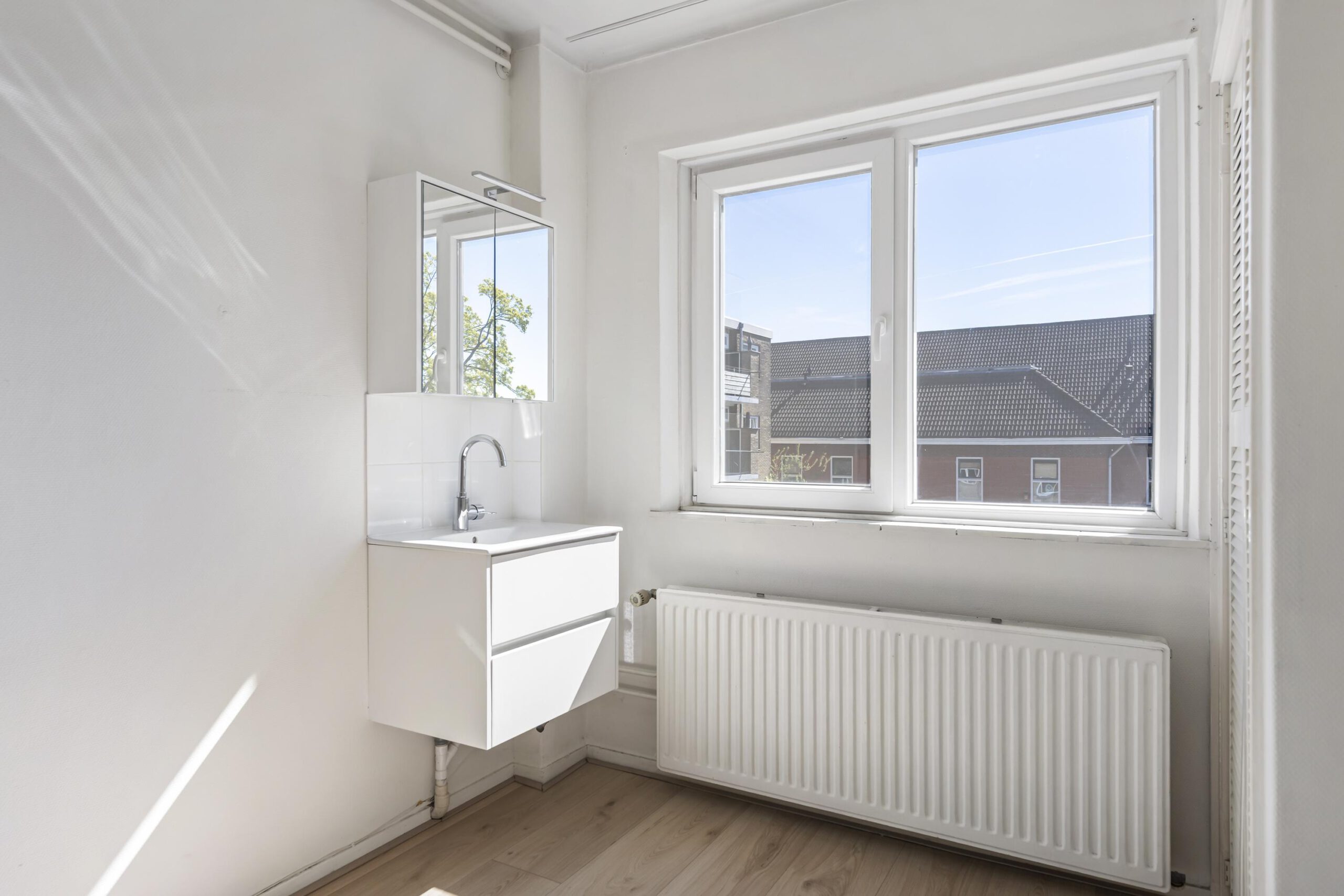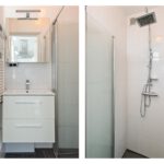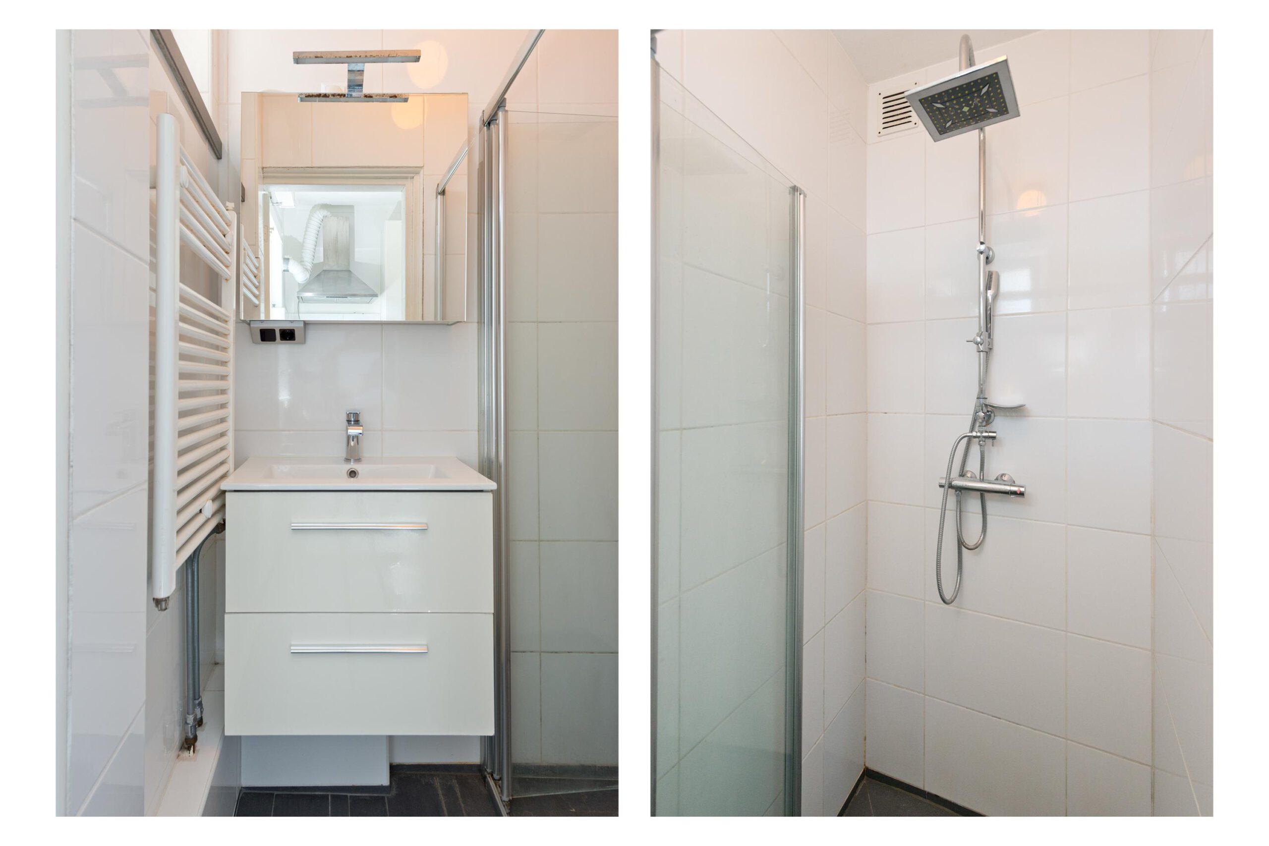 De keuken geeft toegang tot de badkamer. De badkamer is uitgevoerd en voorzien van: douche, wastafelmeubel en spiegelkast.