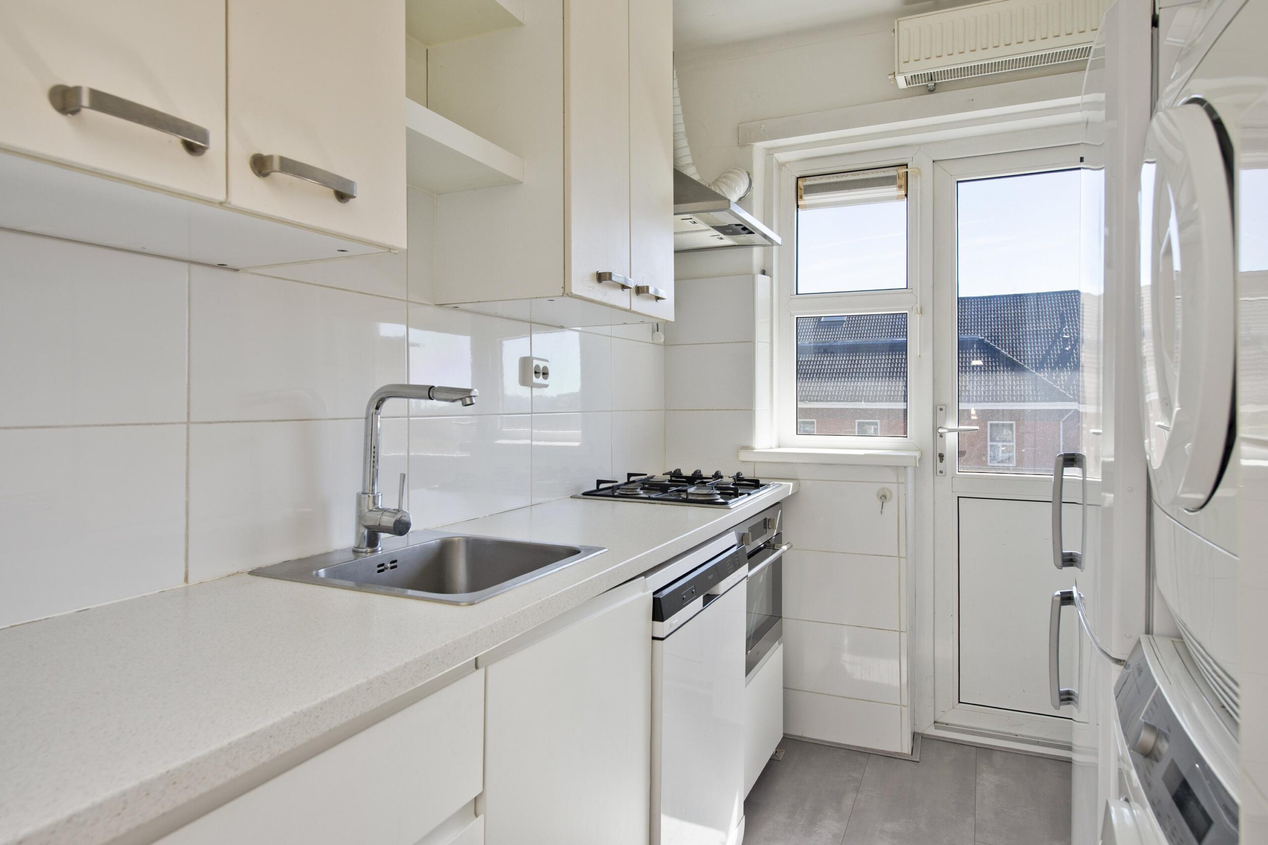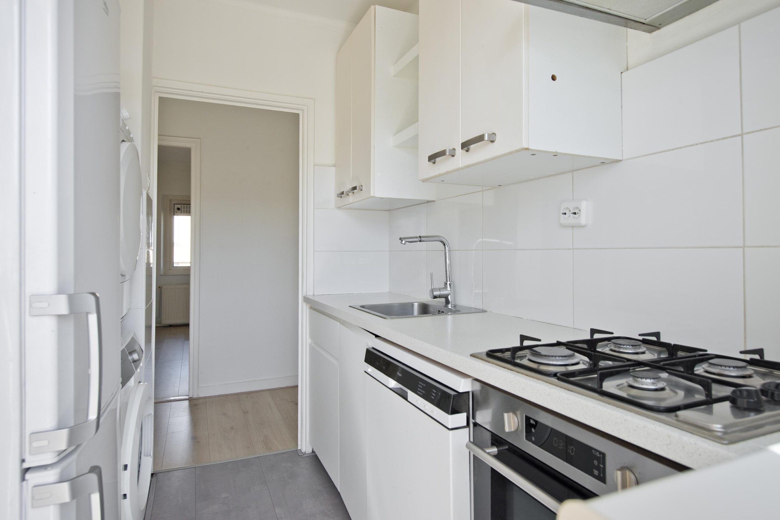 De woning beschikt over een nette keuken met moderne apparatuur, waaronder: 4-pits gas kookplaat, afzuigkap, elektrische oven en koel-/vriescombinatie.