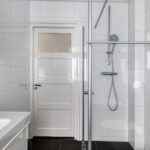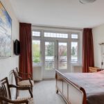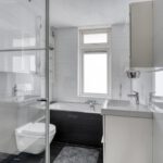 Op de eerste verdieping bevinden zich drie slaapkamers, waaronder een royale master bedroom met openslaande deuren naar een zonnig balkon. De badkamer is een oase van rust: uitgerust met een inloopdouche, een ligbad met tv, en een stijlvol wastafelmeubel.