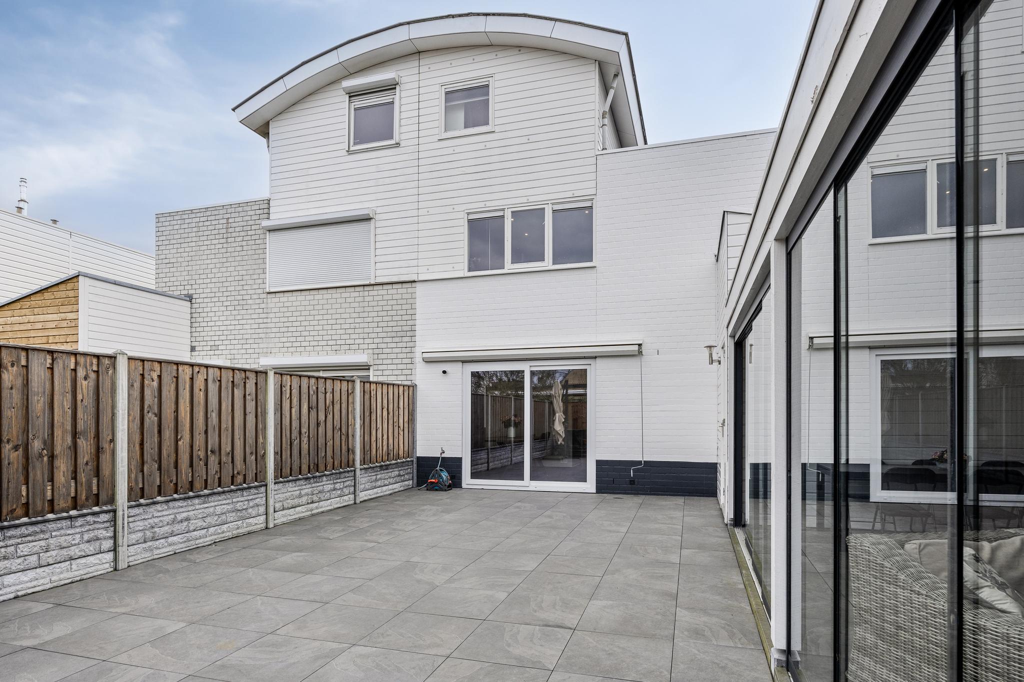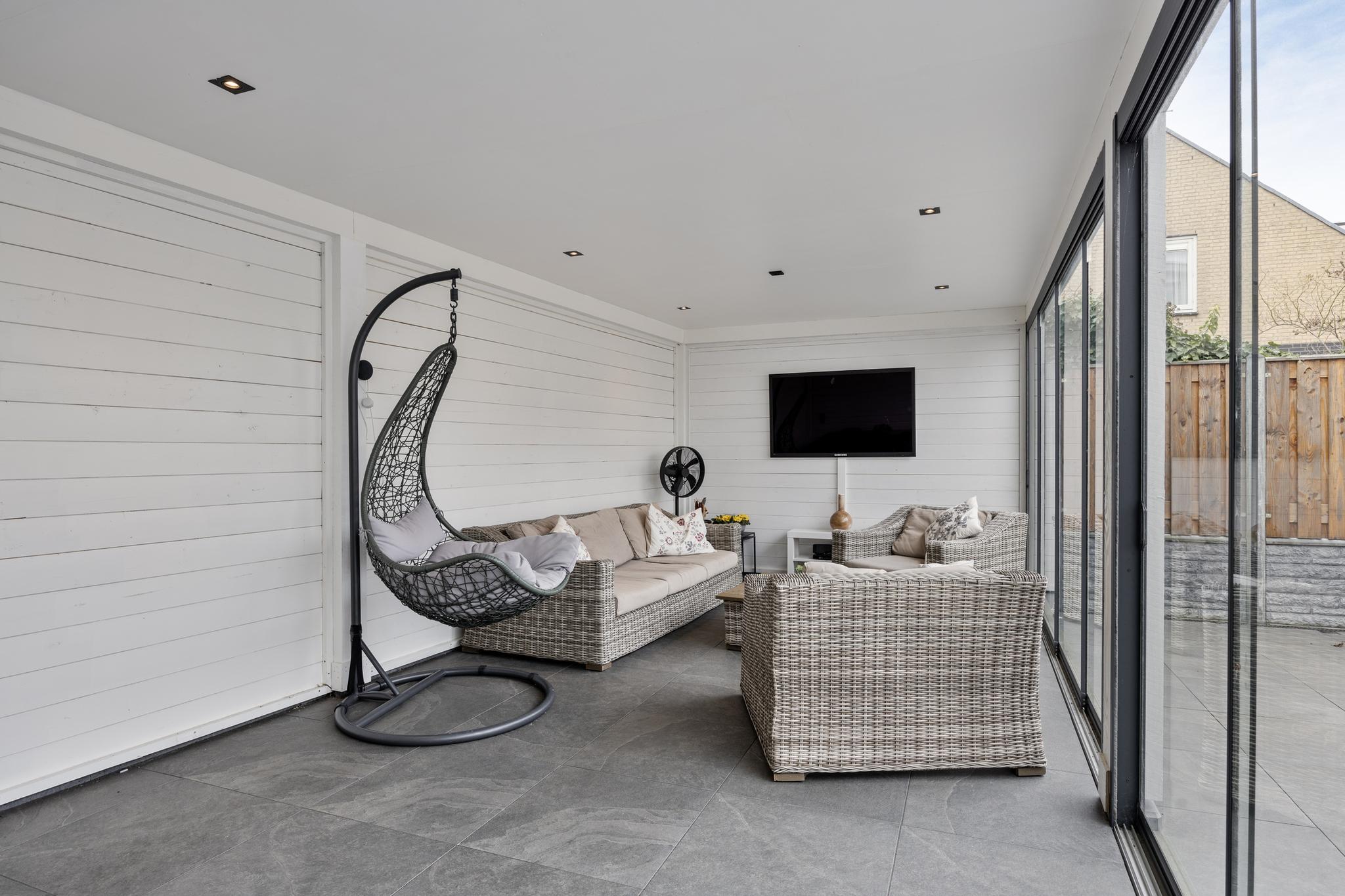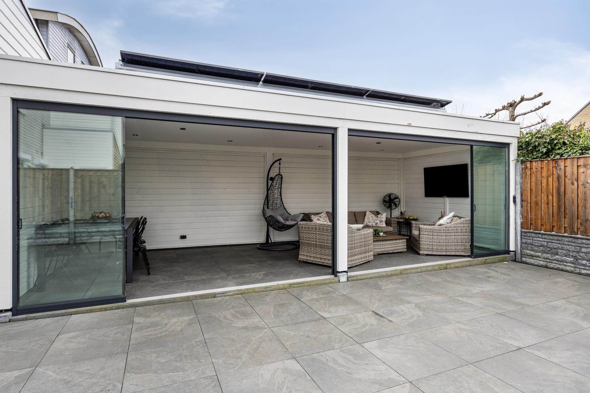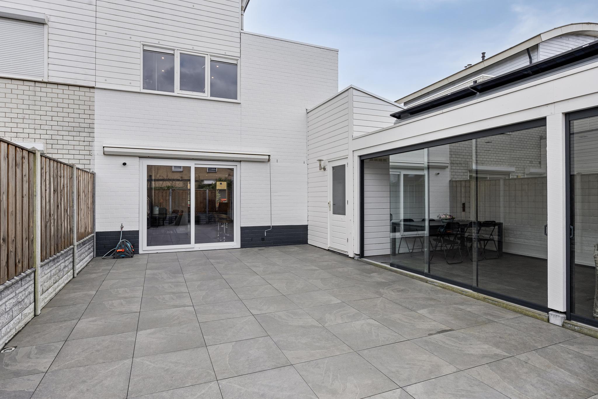 Entree, hal met meterkast en doorgang naar de garage. Vanuit de hal toegang tot de woonkamer en keuken. Deze royale woonkamer ligt aan de aan de voorzijde gesitueerd en de open keuken met eetkamer strekt zich uit over de volle breedte van het huis, waardoor er ruimte is gemaakt voor een heerlijk kookeiland. Vanuit deze moderne keuken is er toegang naar de achtertuin middels een schuifdeur. De achtertuin is deels voorzien van tegelwerk en stroken met beplanting. Achter in de tuin staat een overkapping met glazen schuiframen, welke ideaal is voor een loungeset of een gezellige eet plek.