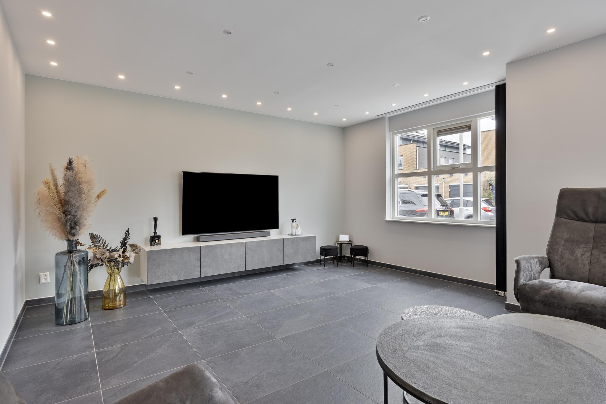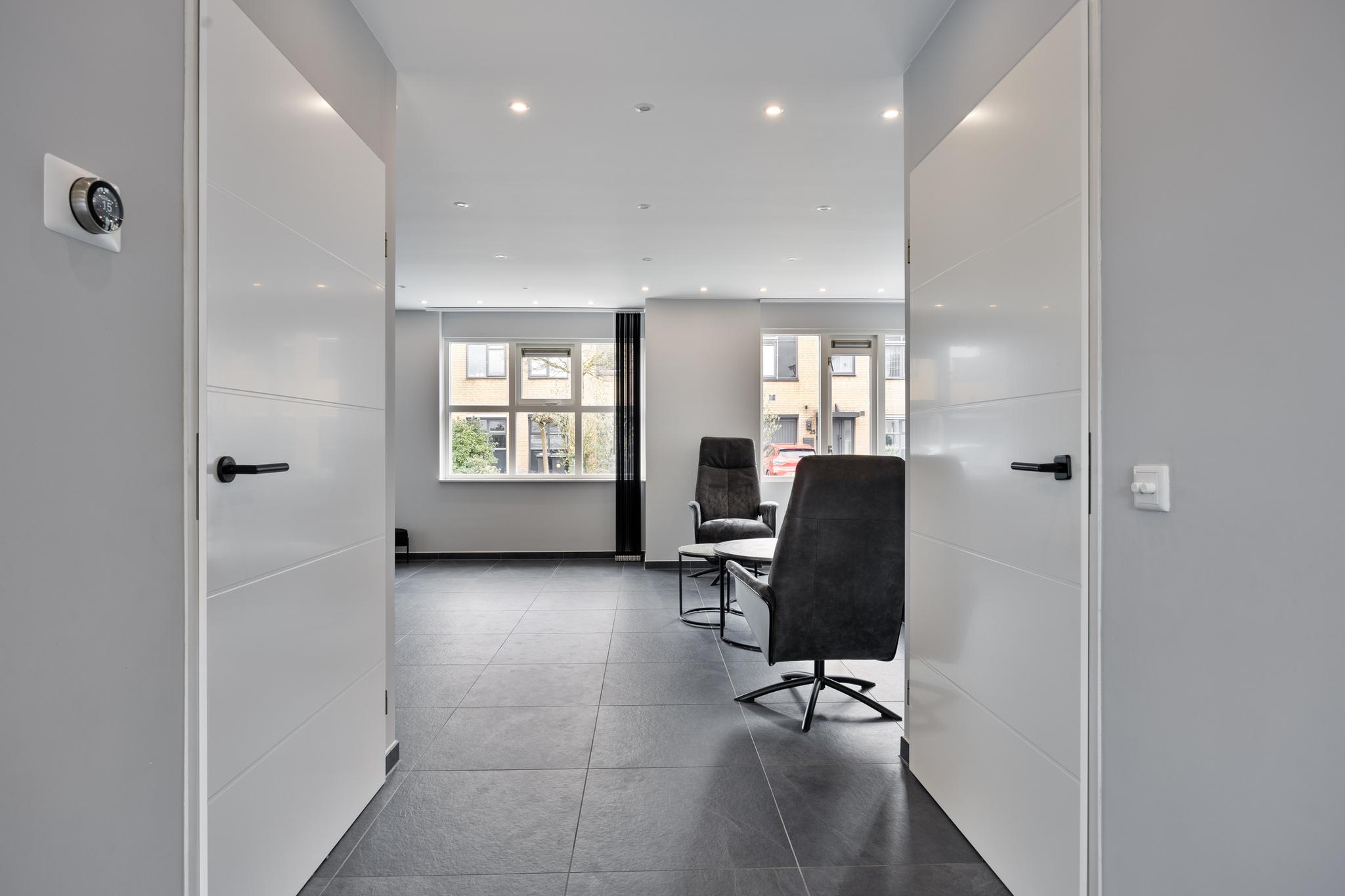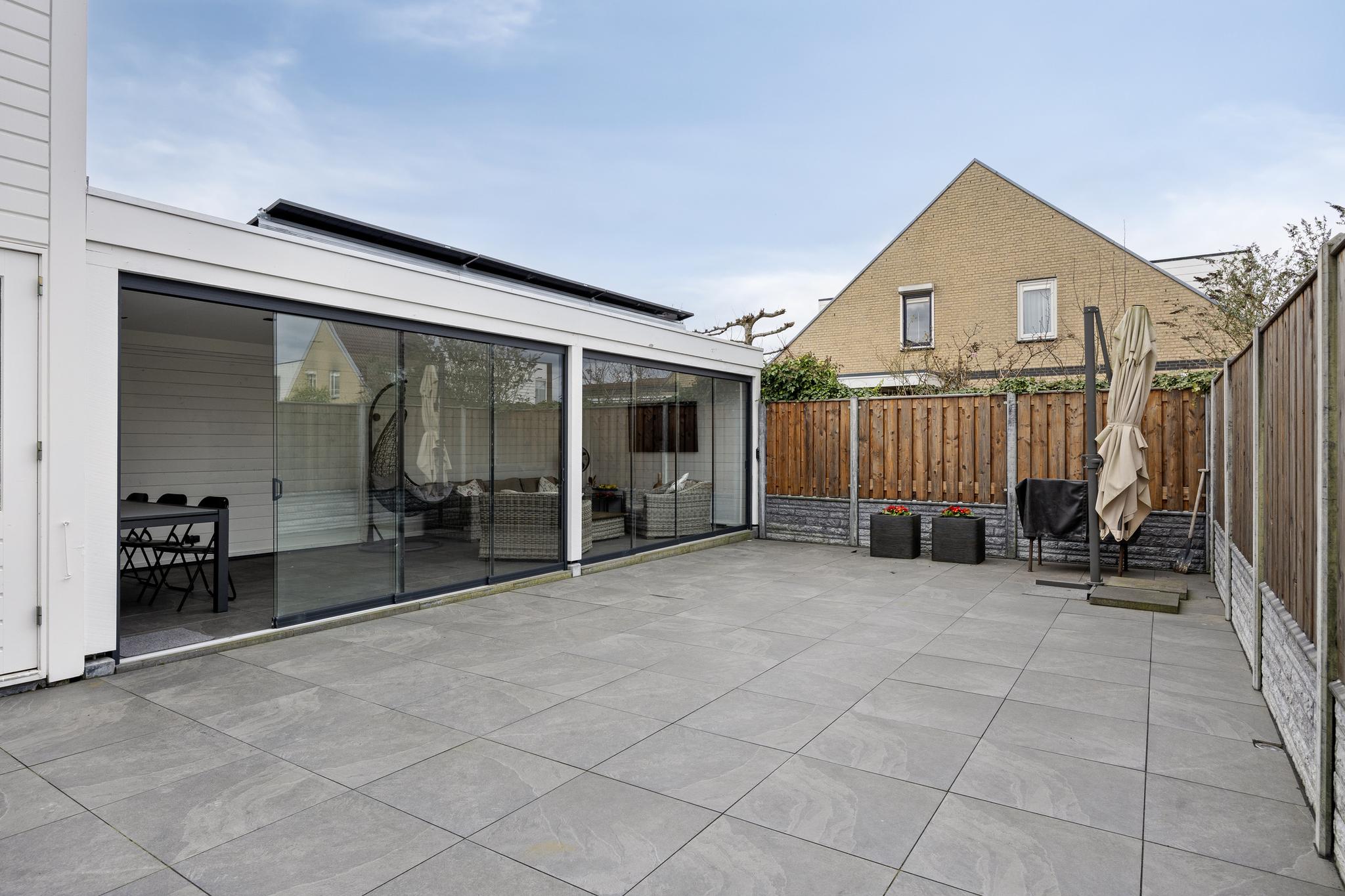 Entree, hal met meterkast en doorgang naar de garage. Vanuit de hal toegang tot de woonkamer en keuken. Deze royale woonkamer ligt aan de aan de voorzijde gesitueerd en de open keuken met eetkamer strekt zich uit over de volle breedte van het huis, waardoor er ruimte is gemaakt voor een heerlijk kookeiland. Vanuit deze moderne keuken is er toegang naar de achtertuin middels een schuifdeur. De achtertuin is deels voorzien van tegelwerk en stroken met beplanting. Achter in de tuin staat een overkapping met glazen schuiframen, welke ideaal is voor een loungeset of een gezellige eet plek.