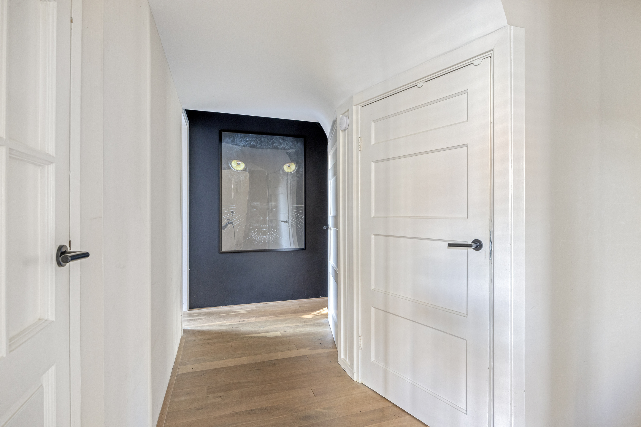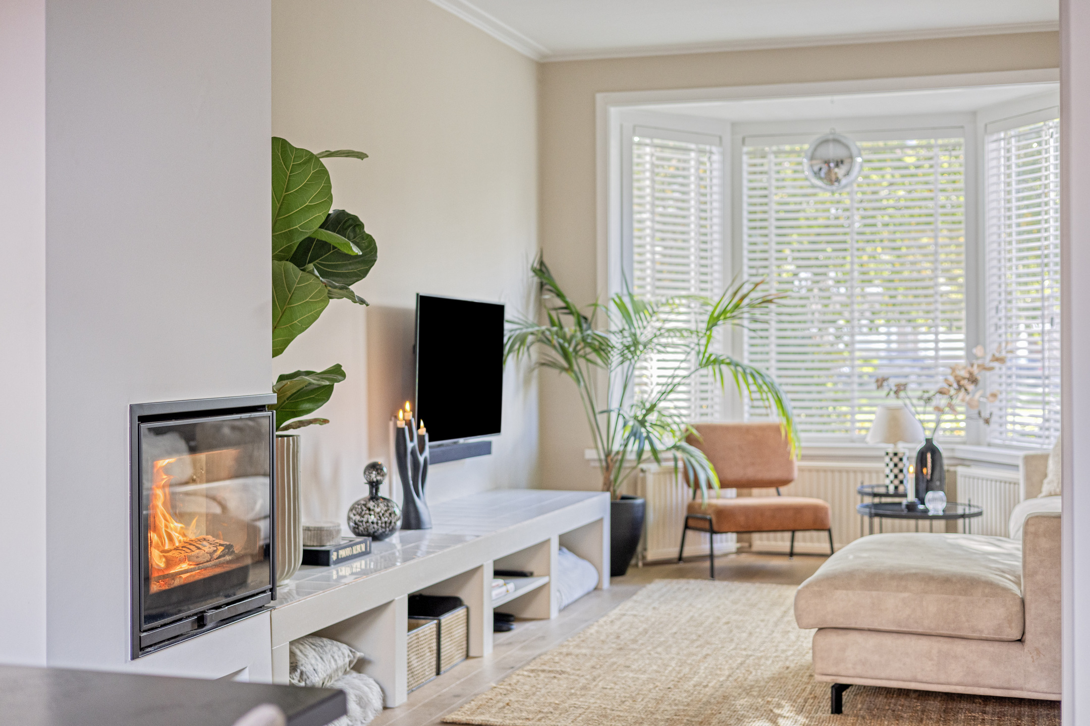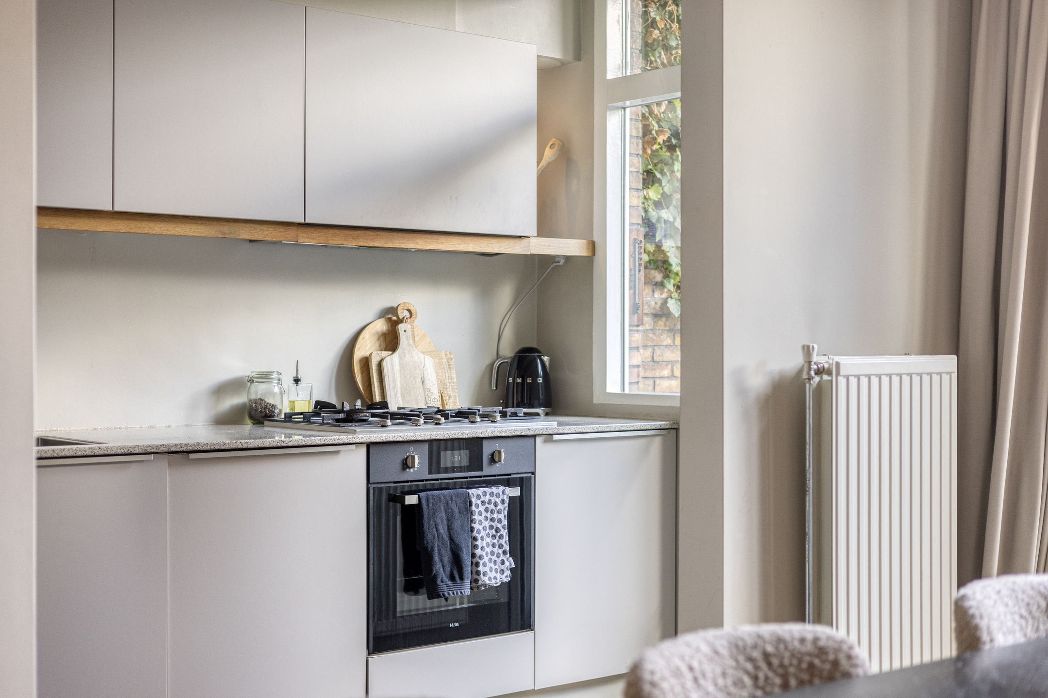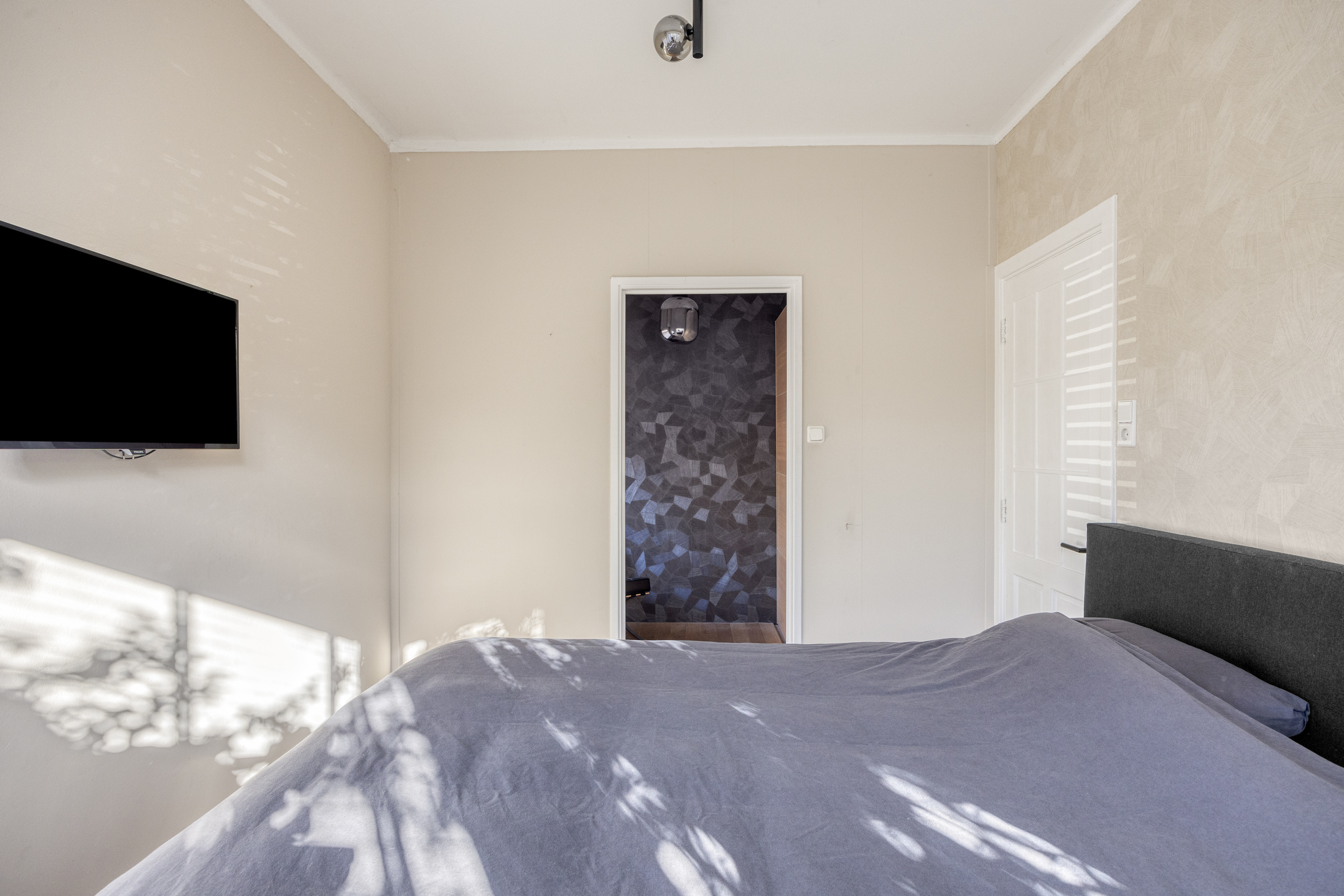 Bij binnenkomst treft u direct de eerste ruime slaapkamer met halfopen inloopkast. De tweede slaapkamer is door de hoekligging ook verrassend licht en beschikt over een badkamer ensuite, voorzien van lig(bubbel)bad inloopdouche en wastafel meubel. Doordat het separaat toilet in dezelfde stijl als de badkamer is samengesteld vormt het een fraai geheel. Voordat u de keuken bereikt passeert u eerst nog een diepe kelderkast én een trapkast. De halfopen keuken met inbouwapparatuur voelt modern en neutraal aan en staat in open verbinding met de eettafel. De eetkamer is ruim en licht. De baksteen-look achterwand geeft de ruimte veel warmte. De lichte zitkamer is voorzien sfeervolle open haard.