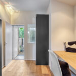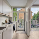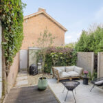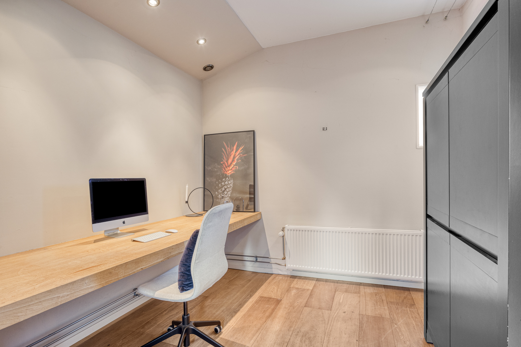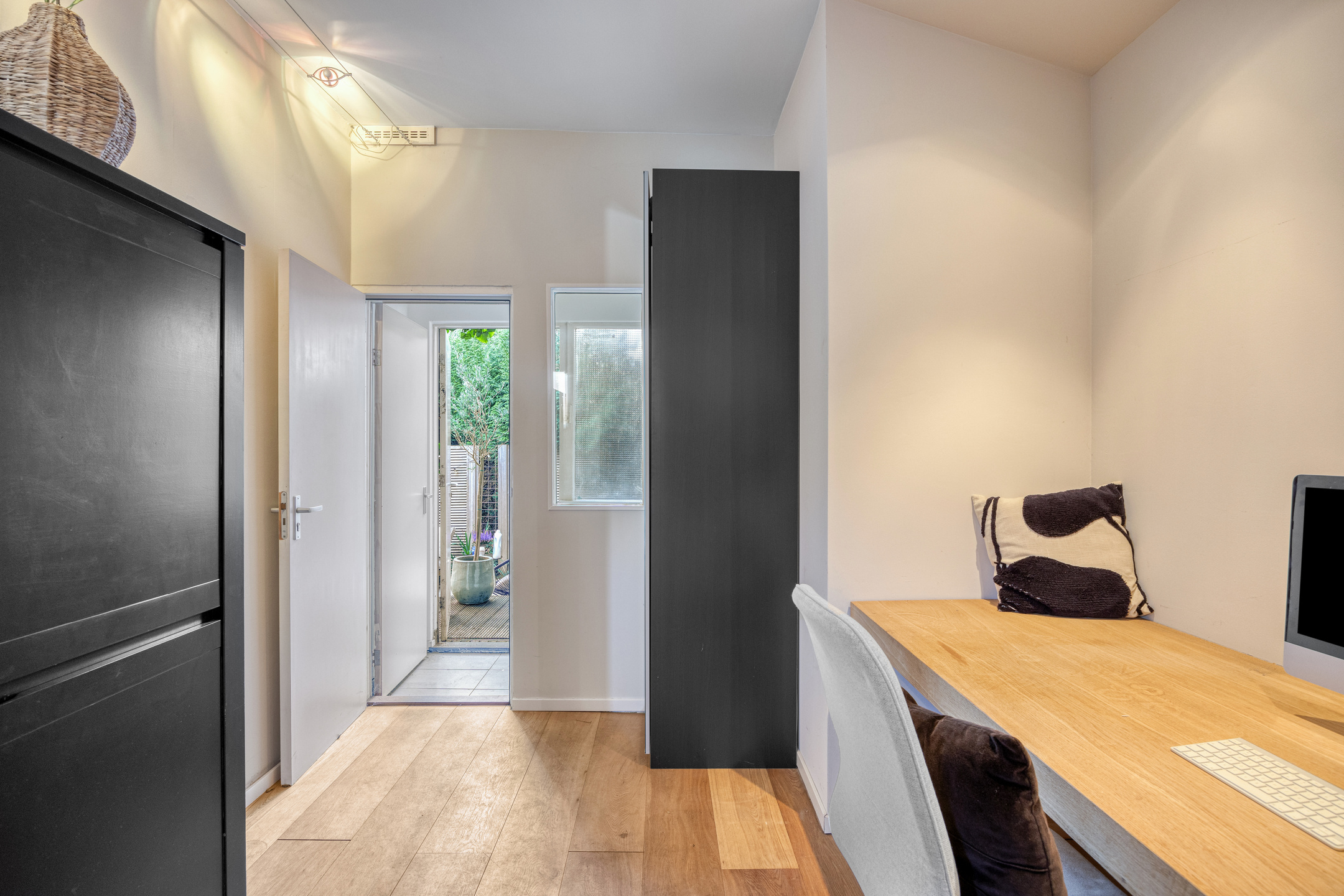 De tuin verleent toegang tot de omgebouwde garage. Deze doet nu dienst als thuiswerkplek en aparte wasruimte. De ruimte is volledig geïsoleerd en verwarmd, hierom is de ruimte multifunctioneel inzetbaar.