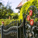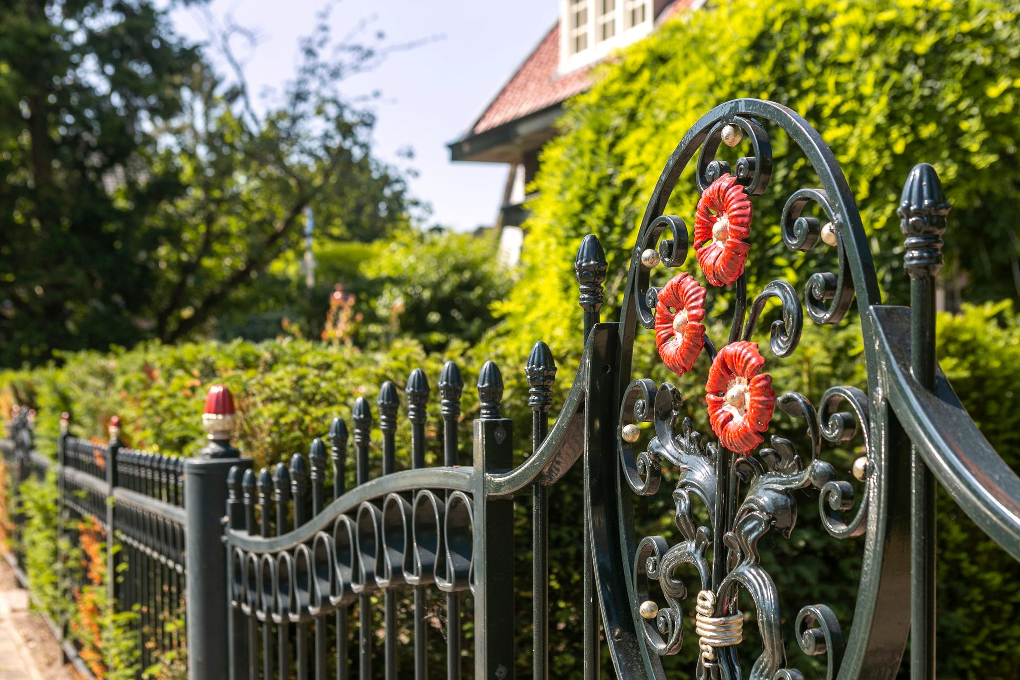 - Hand gesmede tuintoegangshekwerken (klaassen) met bloemdecoratie.
