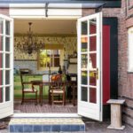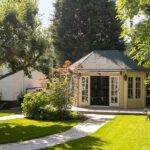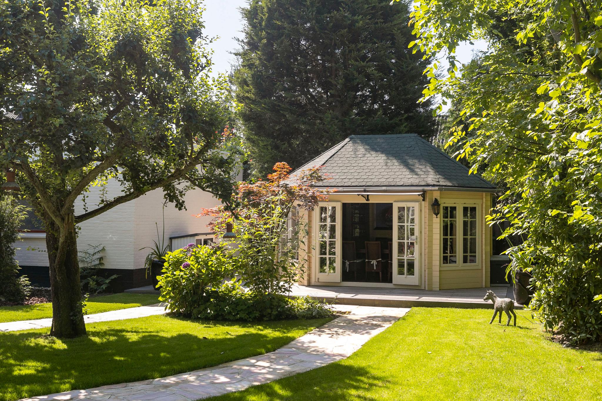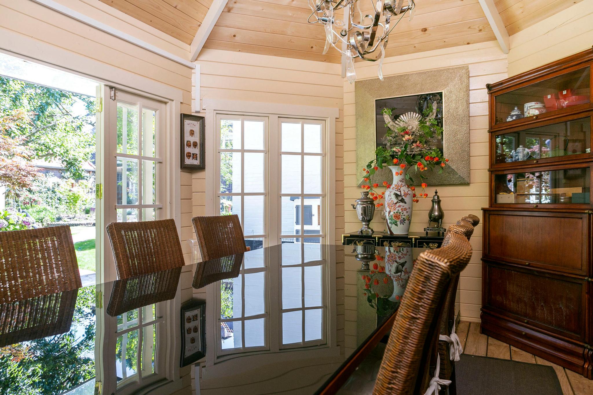 - Tuin paviljoen in Bentheimer stijl met harmonica deuren op hard houten plateau en betonnen fundering.