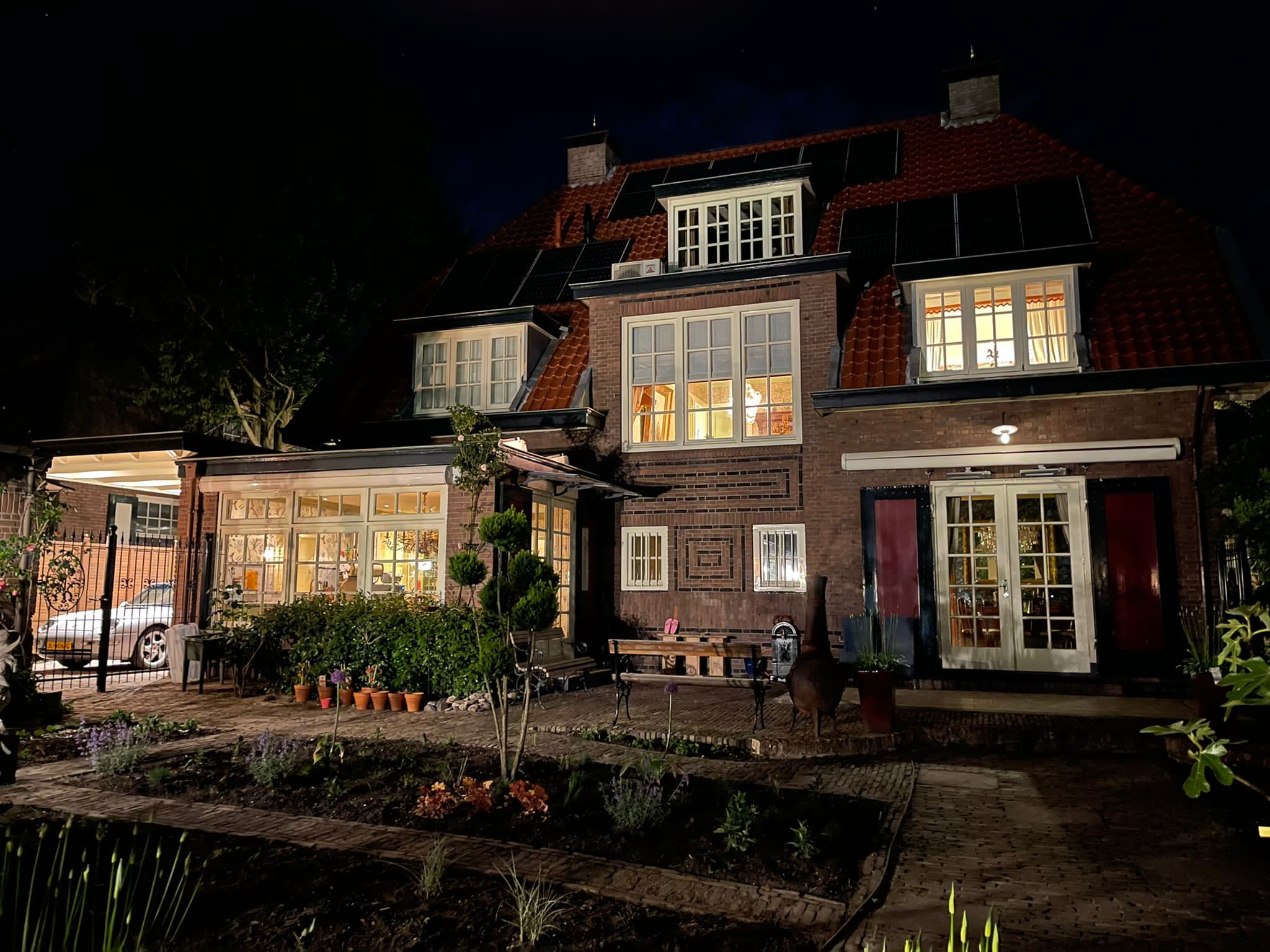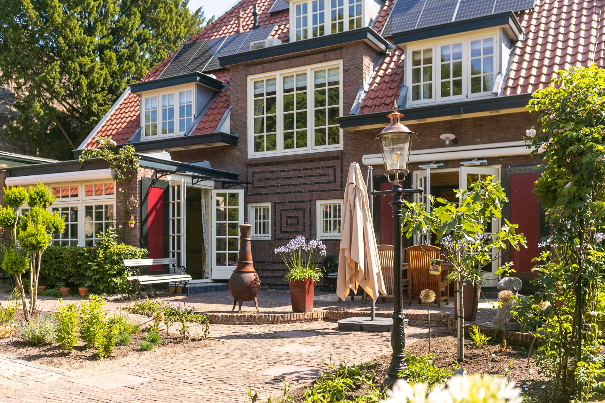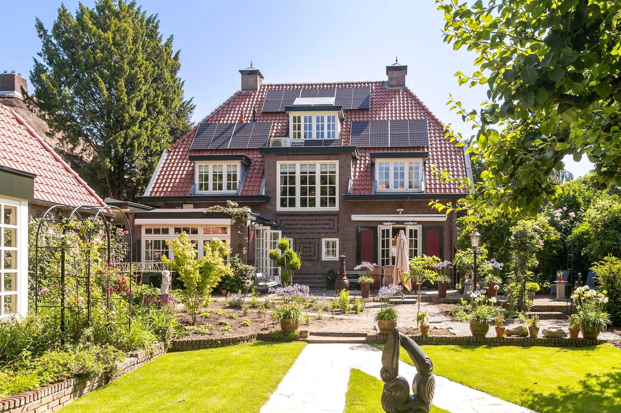 Onder architectuur gebouwd in romantische stijl gerenoveerd en uitstekend onderhouden royale vrijstaande villa uit 1926. Met in 2005 gebouwd vrijstaand fraai in dezelfde sfeer uitgevoerd bouwwerk waarvan in ondergebracht een verwarmd zwembad, toilet met fontein, sauna, openslaande deuren naar de schitterend aangelegde achtertuin op het zuidwesten met diverse terrassen, grenzend aan voormalige garage, waarin nu garderobe, elektrische zonneboiler, tuingereedschap, fietsenberging met zolder aanwezig zijn. Dit vrijstaand bouwwerk kan gemakkelijk omgevormd worden tot praktijk aan huis, kantoor, atelier of semi zelfstandige woon- slaapunit voor familielid van 75 m2 (binnenmaat) exclusief alle bergingsruimten van ongeveer 12,5m2 (binnenmaat) plus vliering van 18m2 (binnenmaat). Er zijn 2 buitenkranen, 2 buitenstopcontacten en een elektrische terrasverwarming aanwezig. Het platte dak deel is voorzien van zonnecollectoren. De twee zonneschermen zijn elektrisch bedienbaar.