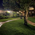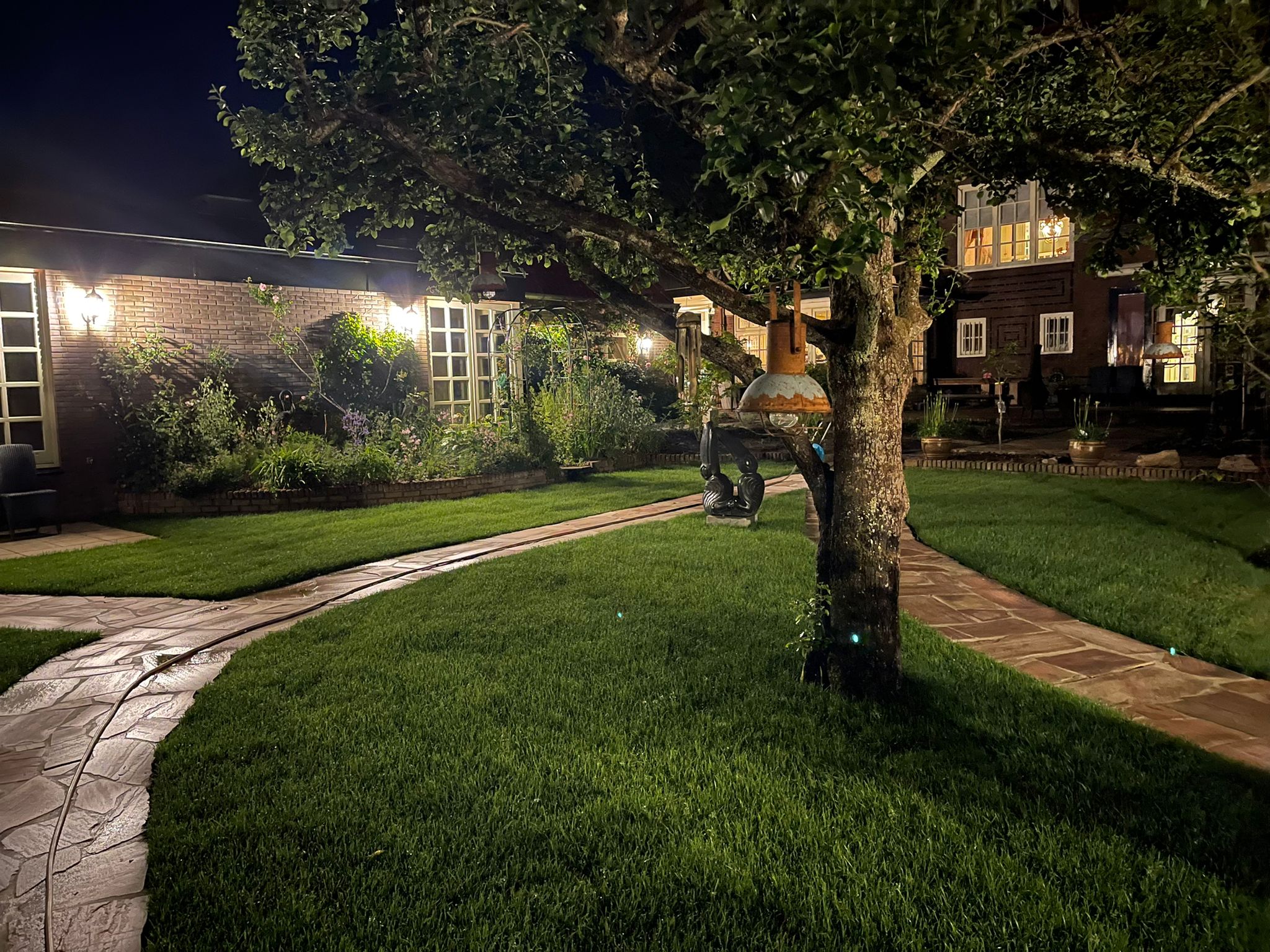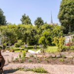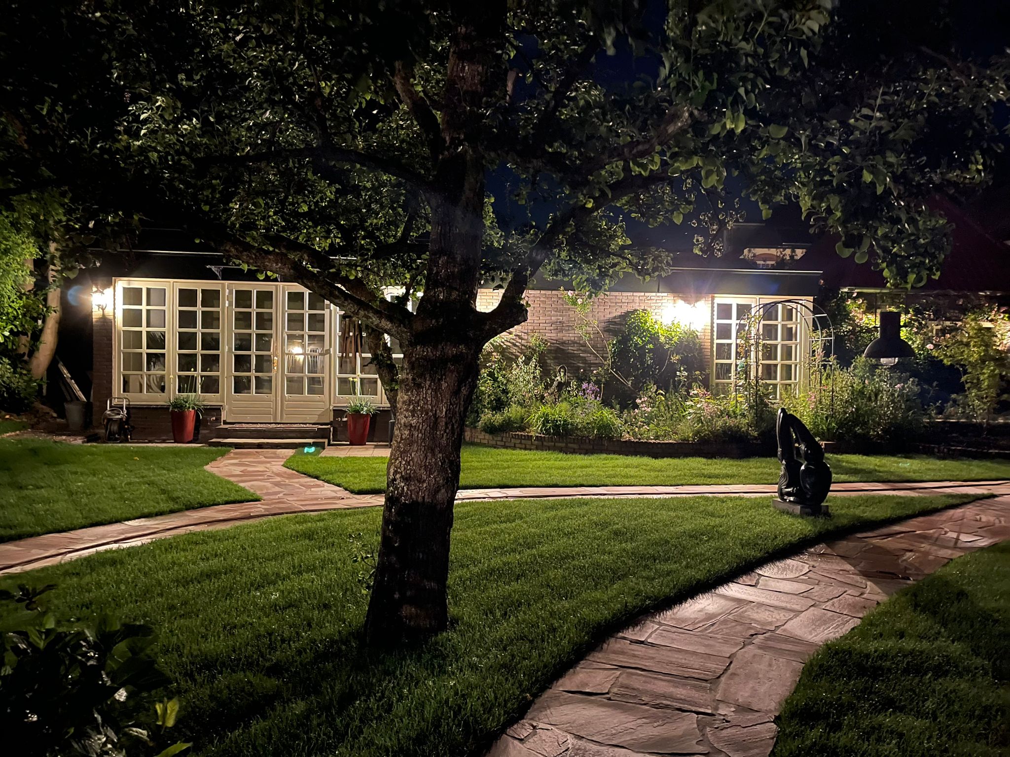 - Nieuwe tuininrichting en beplanting deels nieuwe bestrating met oude ijssel handvormklinkers, rode Weserbergrland schiefferplaten en lichtend pad in andes rose Braziliaanse kwartsiet.