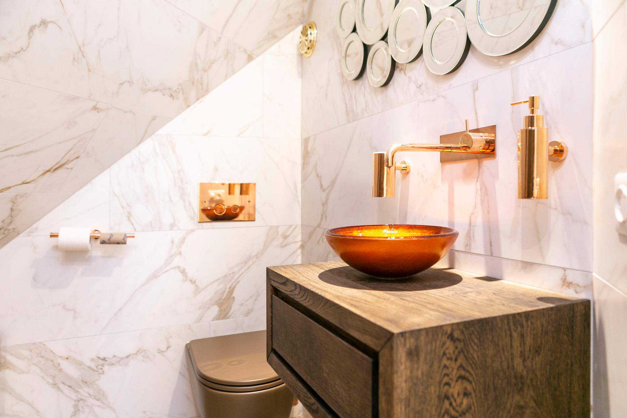 - 2 badkamers 1 in klassiek Engelse stijl in Antique gold en 1 badkamer in Italiaanse stijl rosé goud.