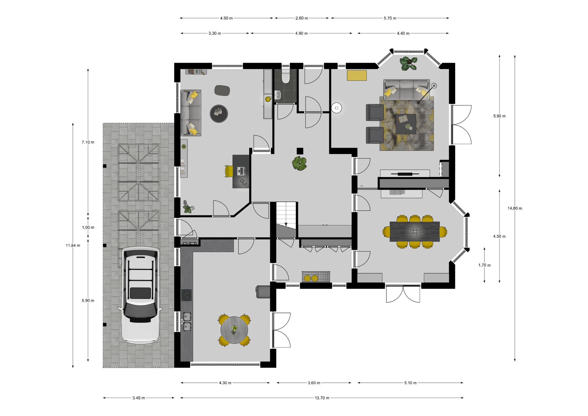 - 12 meter lange carport in hout met Belgisch hardstenen voeten, 2 daklichten en inbouwspots.