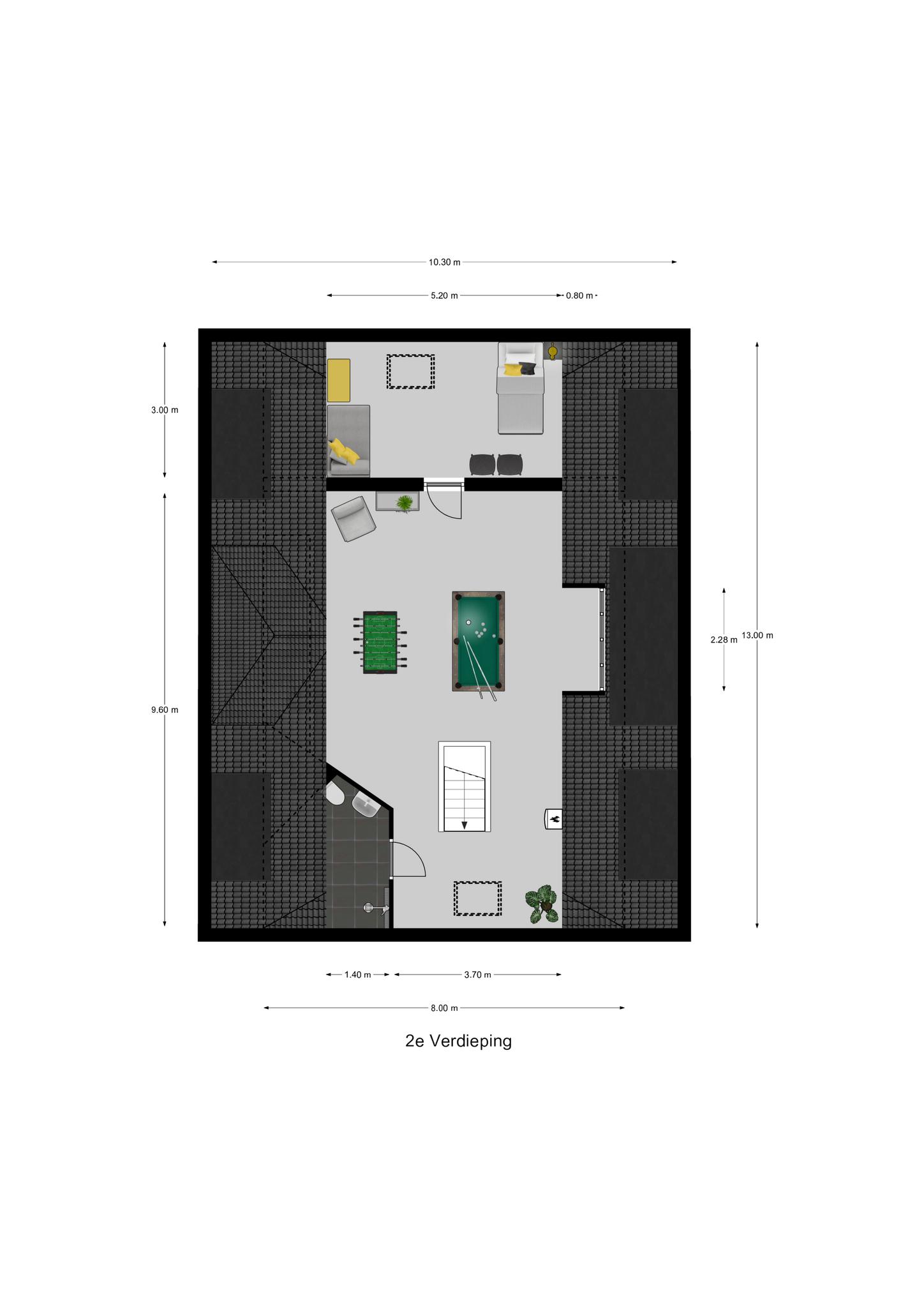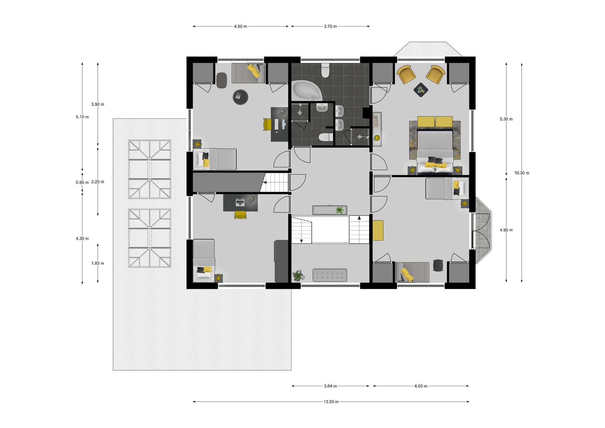 2e verdieping: royale leefruimte met veel bergruimte, aansluiting voor wasmachine en droger, logeerkamer, 3e badkamer met douche, toilet en wastafel.