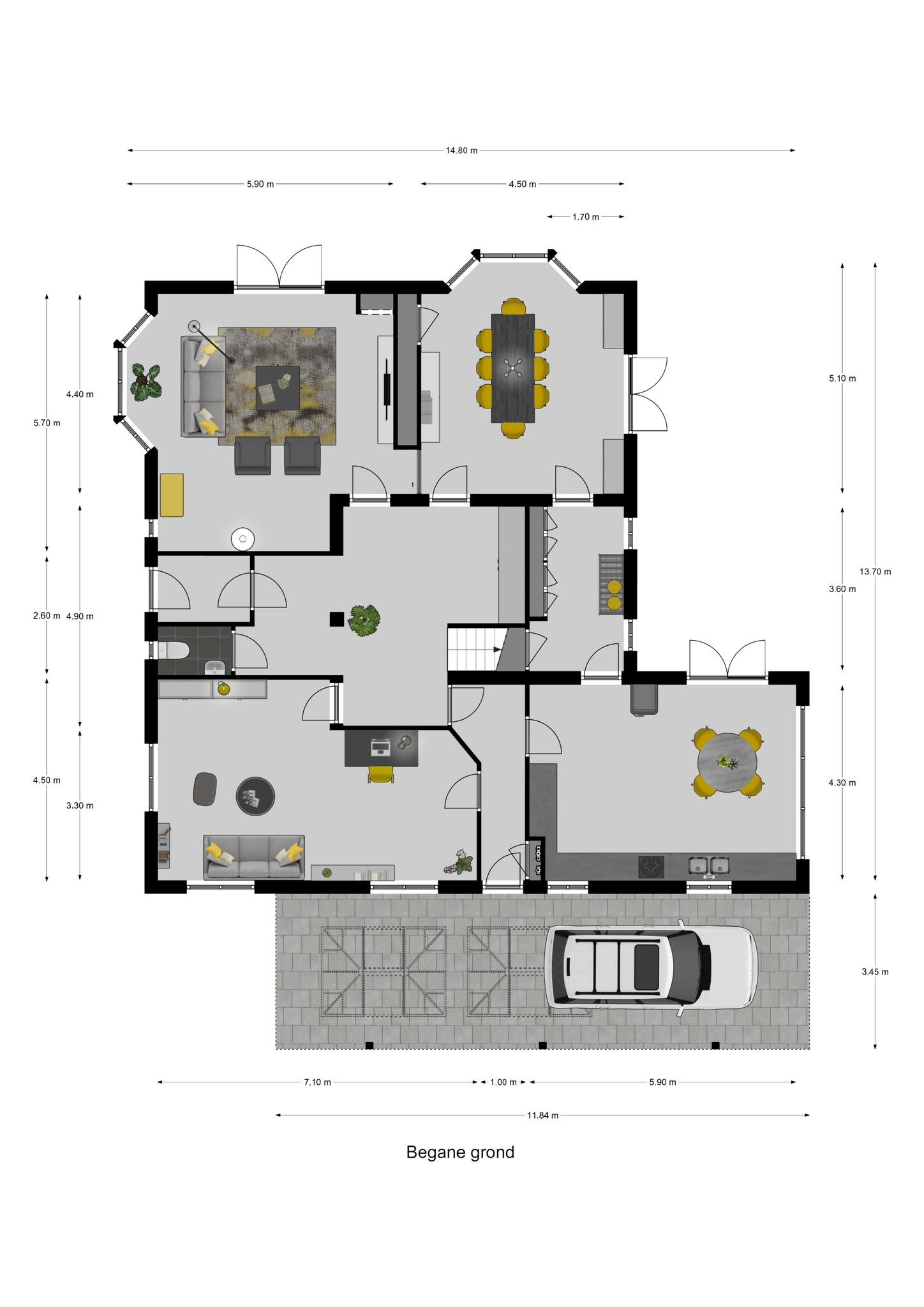 Begane grond: vestibule, royale hal, garderobe, toilet met fontein, voorkamer met erker en open haard en openslaande deuren naar de zij tuin, eetkamer met erker en openslaande deuren naar de tuin, zeer ruime studeerkamer/tvkamer, in 1996 uitgebouwde volledig ingerichte woonkeuken en bijkeuken. Zijuitgang naargarage / carport.