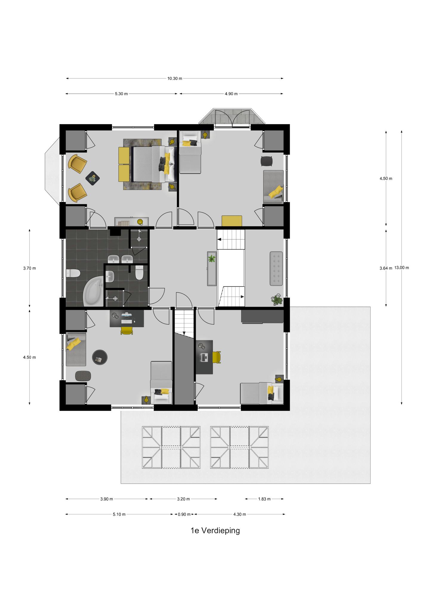 1e verdieping: overloop, 4 slaapkamers voorzien van airco en waarvan 1 met balkon, 1e badkamer met douche, toilet en wastafel, 2e badkamer aansluitend aan een slaapkamer met douche, ligbad, 2 wastafels, toilet en aansluiting voor wasmachine en droger.