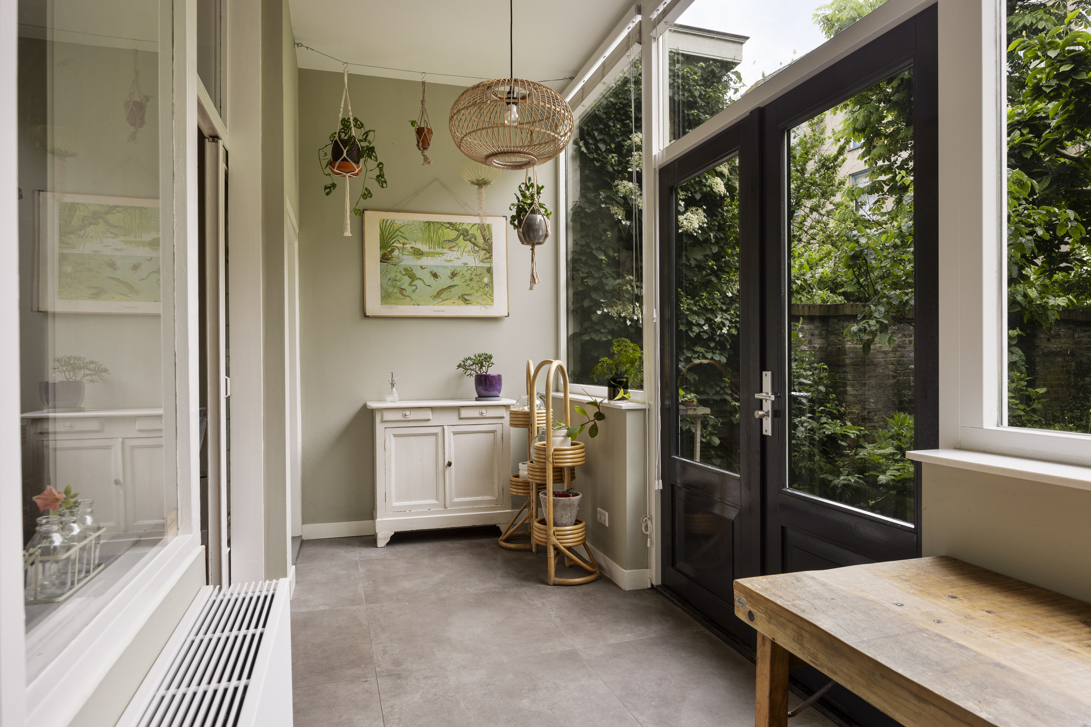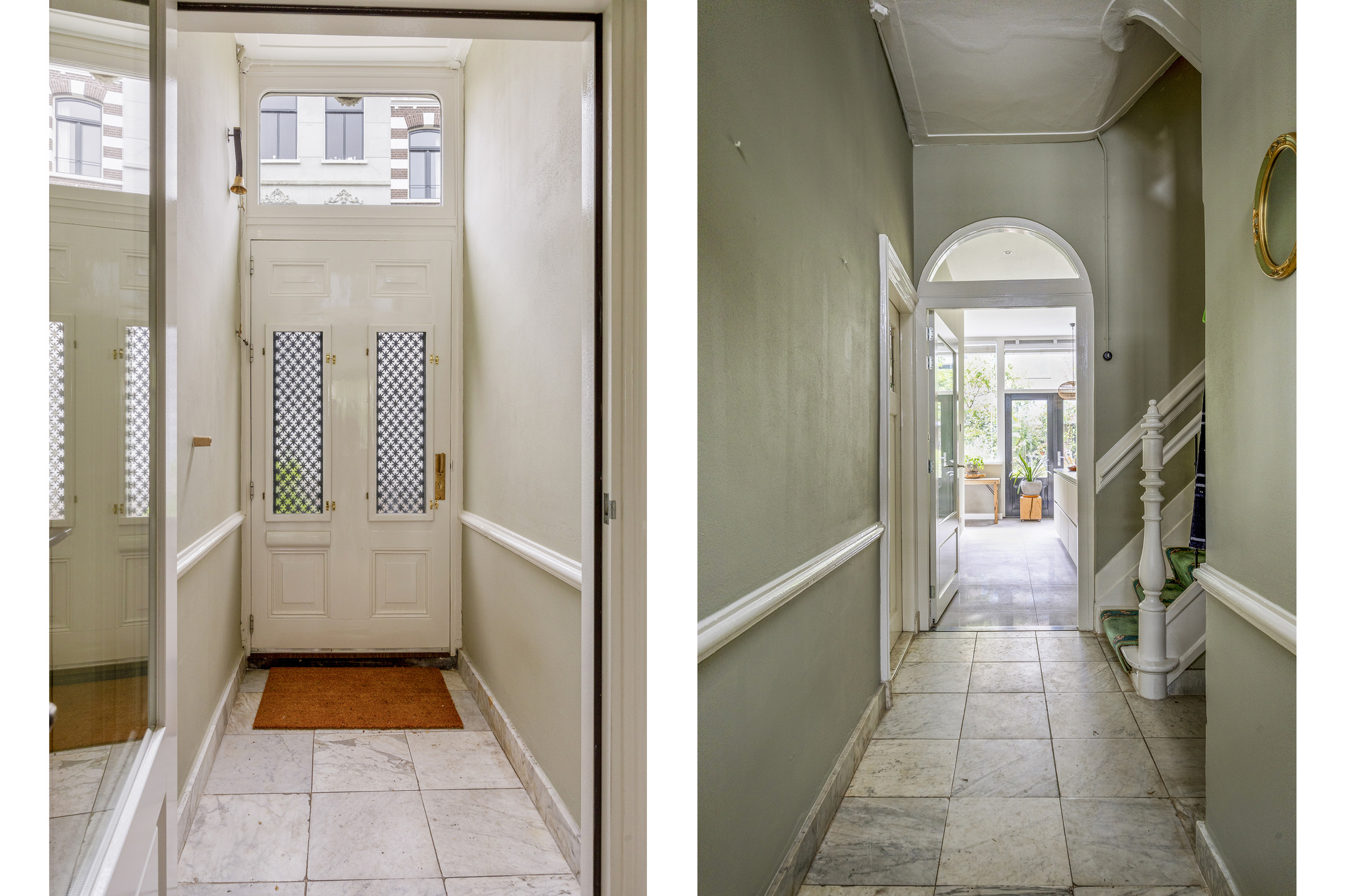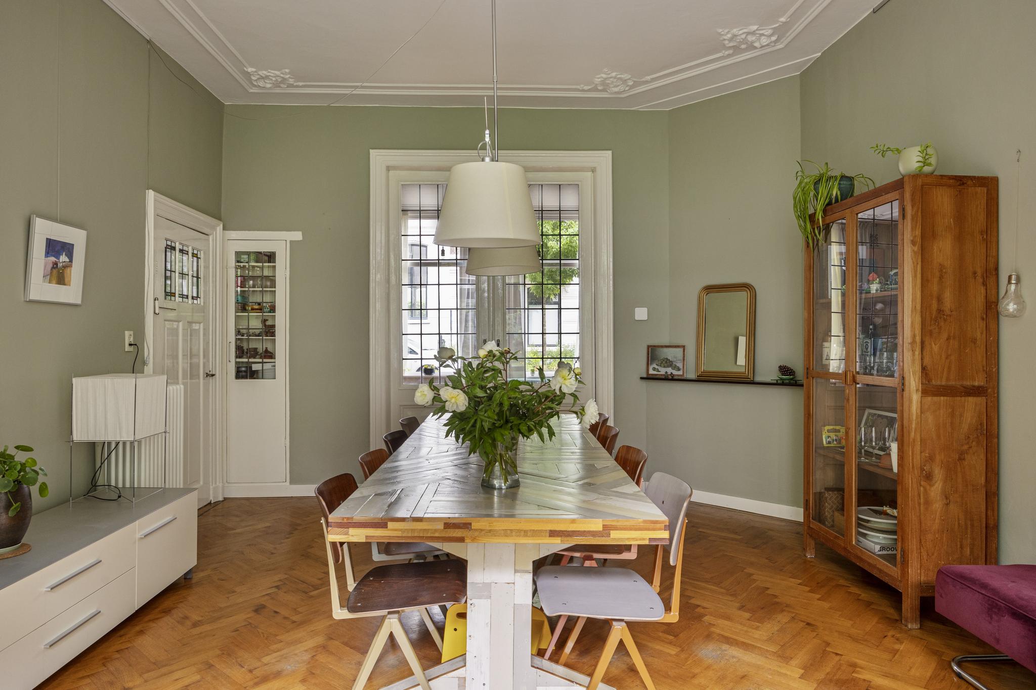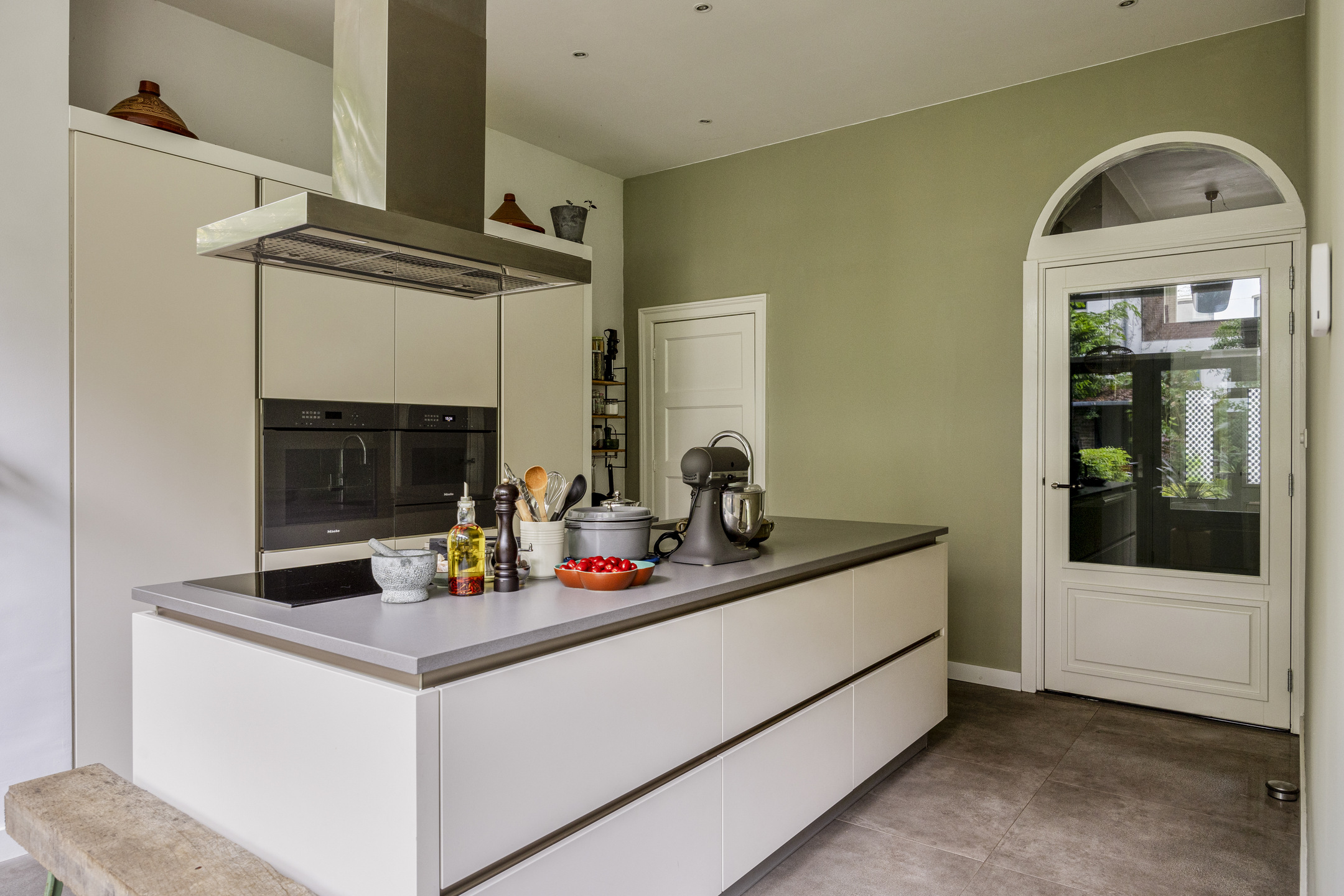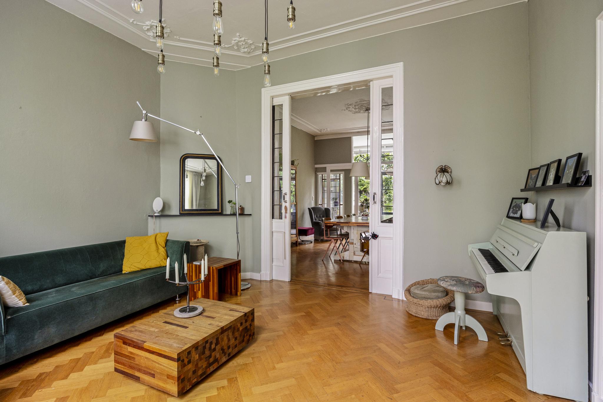 Beletage; Vestibule en gang met marmeren vloer afkomstig uit het Rijksmuseum, originele ornamenten stucplafond en een toilet met authentieke betegeling en fonteintje. Multifunctionele zijkamer (voormalig wachtkamer) is nu in gebruik als berging met wasmachine en droger. Riante kamer- en suite met hoge paneelschuifdeuren. Aangebouwde serrekamer (ruim 20 m2) met dubbele openslaande deuren naar de tuin. Moderne luxe woonkeuken met fraaie design keuken inrichting en een spoel/kookeiland met Quooker en ATAG inductiekookplaat/wokbrander. Fraaie kastenwand met uitgebreide inbouwapparatuur van Miele en Liebherr. Openslaande deuren naar de tuin.