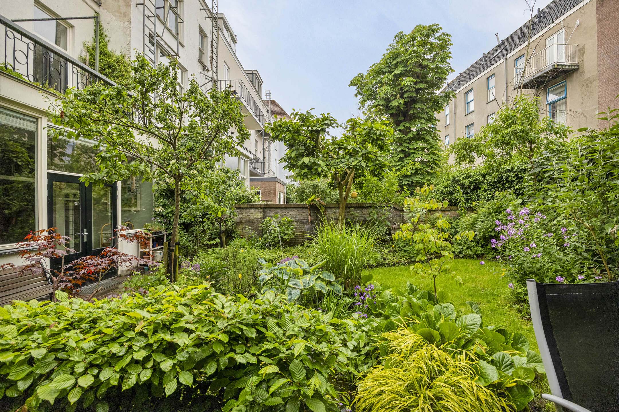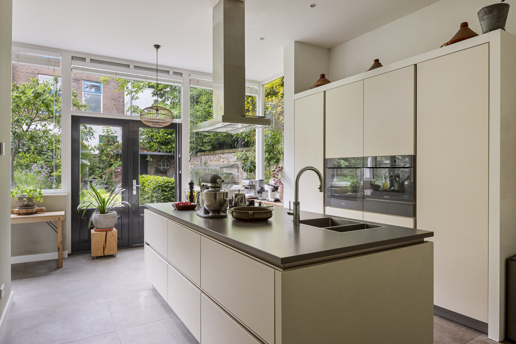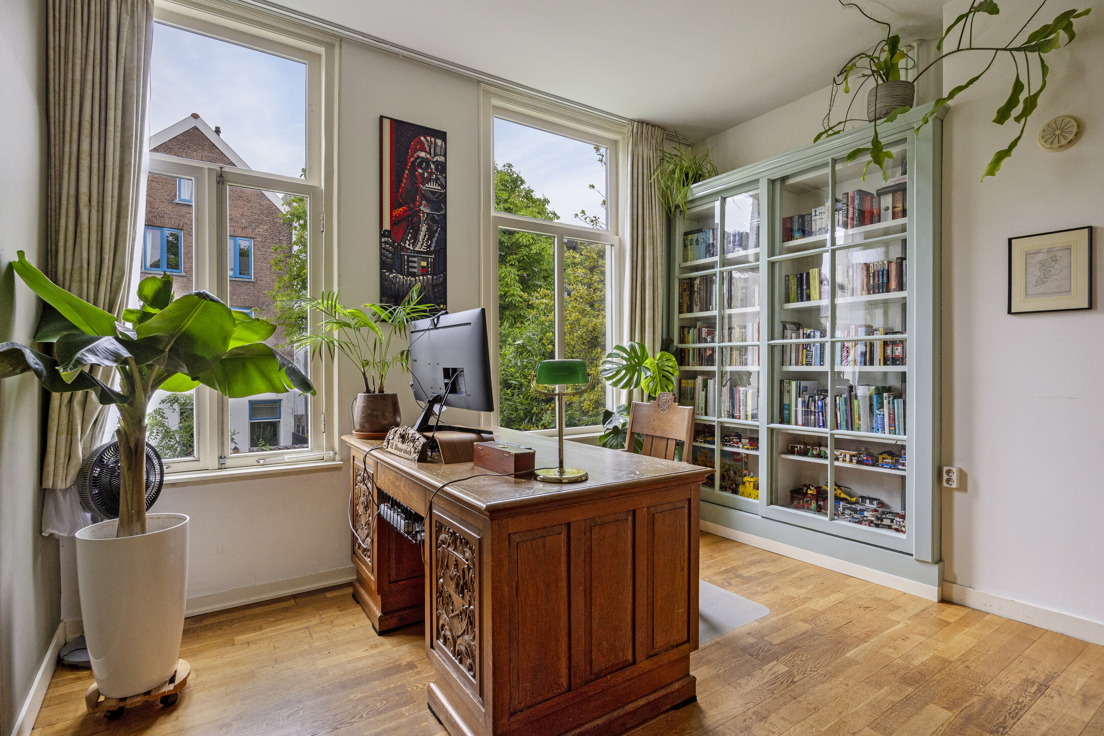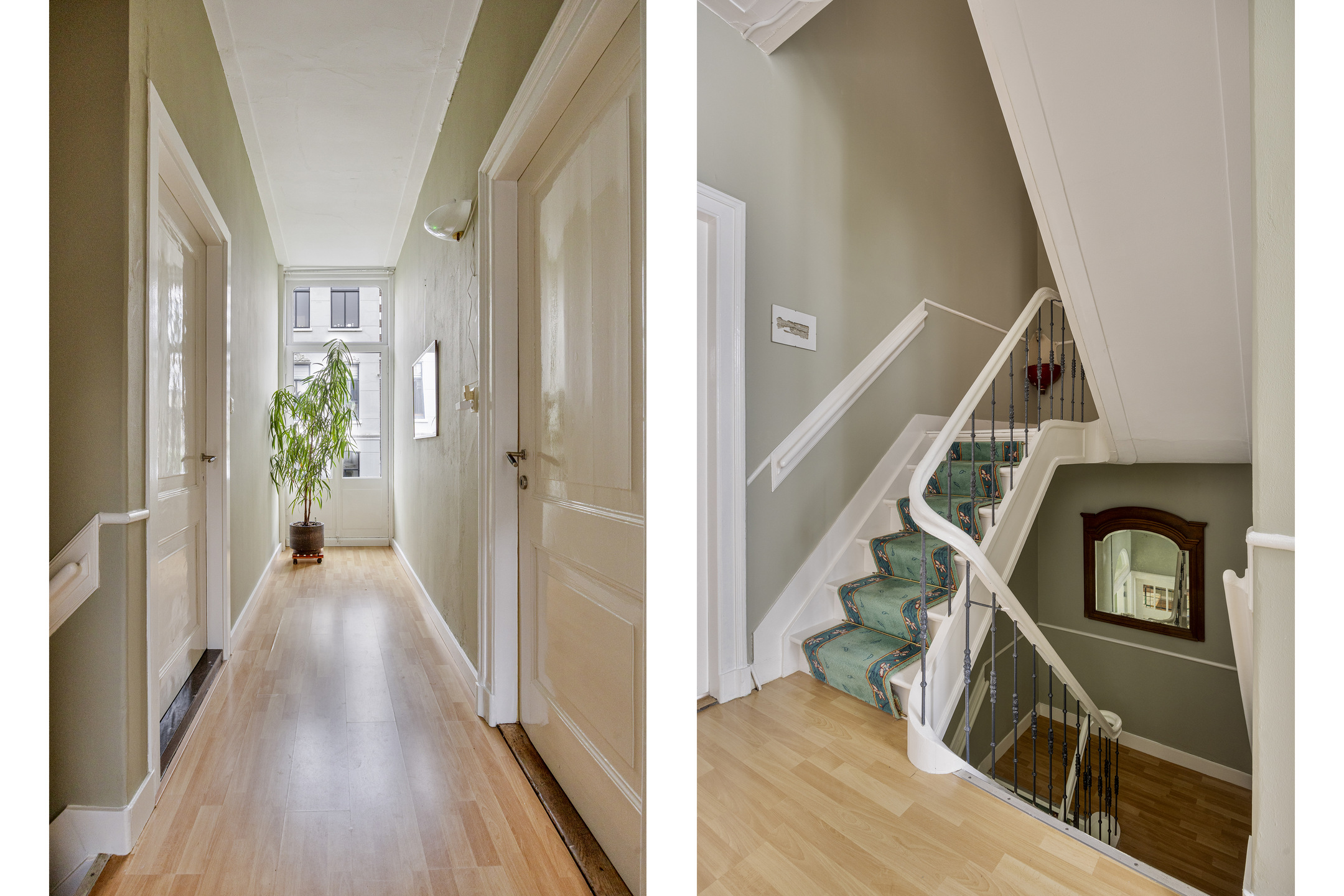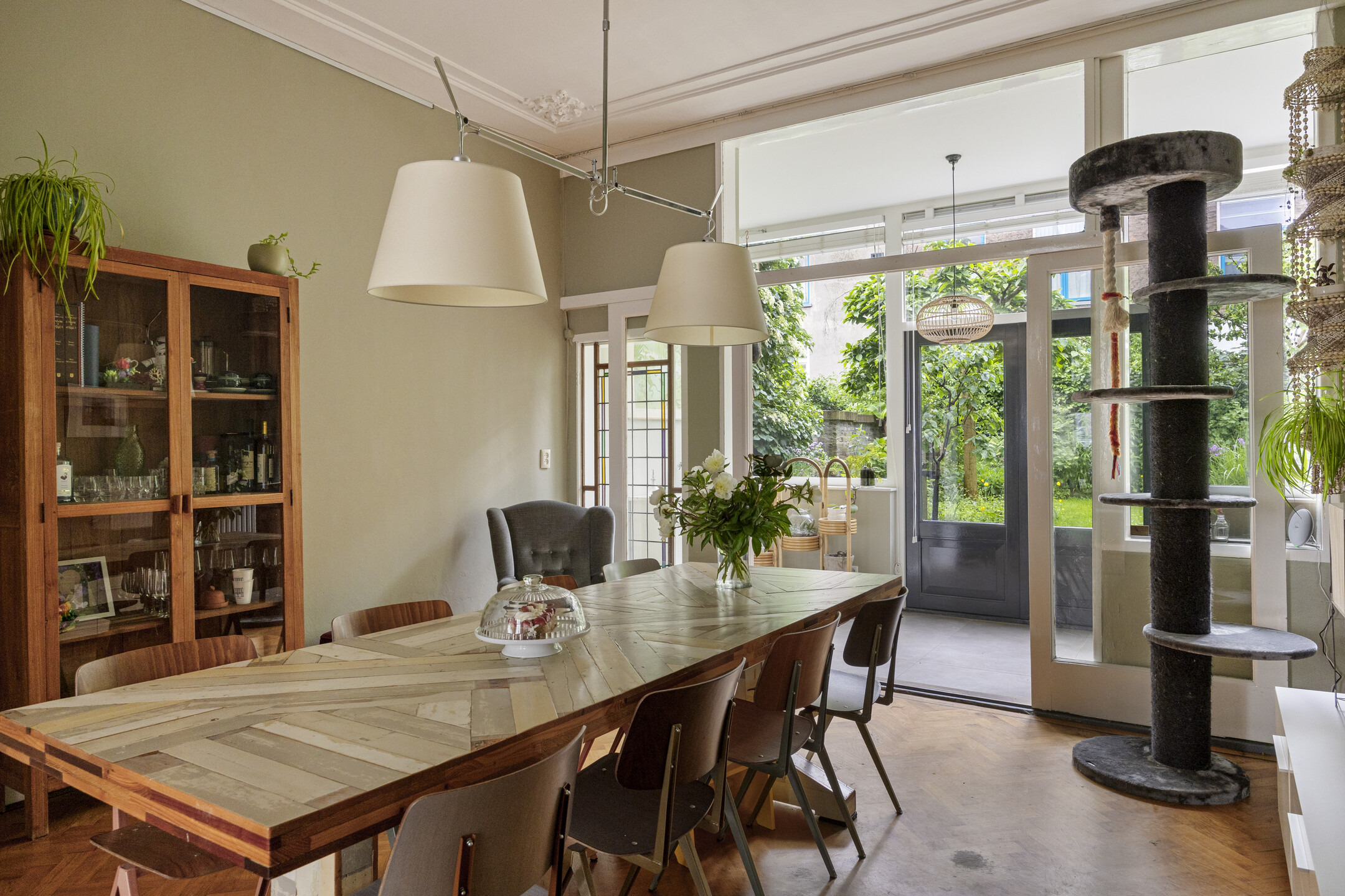 Beletage; Vestibule en gang met marmeren vloer afkomstig uit het Rijksmuseum, originele ornamenten stucplafond en een toilet met authentieke betegeling en fonteintje. Multifunctionele zijkamer (voormalig wachtkamer) is nu in gebruik als berging met wasmachine en droger. Riante kamer- en suite met hoge paneelschuifdeuren. Aangebouwde serrekamer (ruim 20 m2) met dubbele openslaande deuren naar de tuin. Moderne luxe woonkeuken met fraaie design keuken inrichting en een spoel/kookeiland met Quooker en ATAG inductiekookplaat/wokbrander. Fraaie kastenwand met uitgebreide inbouwapparatuur van Miele en Liebherr. Openslaande deuren naar de tuin.