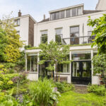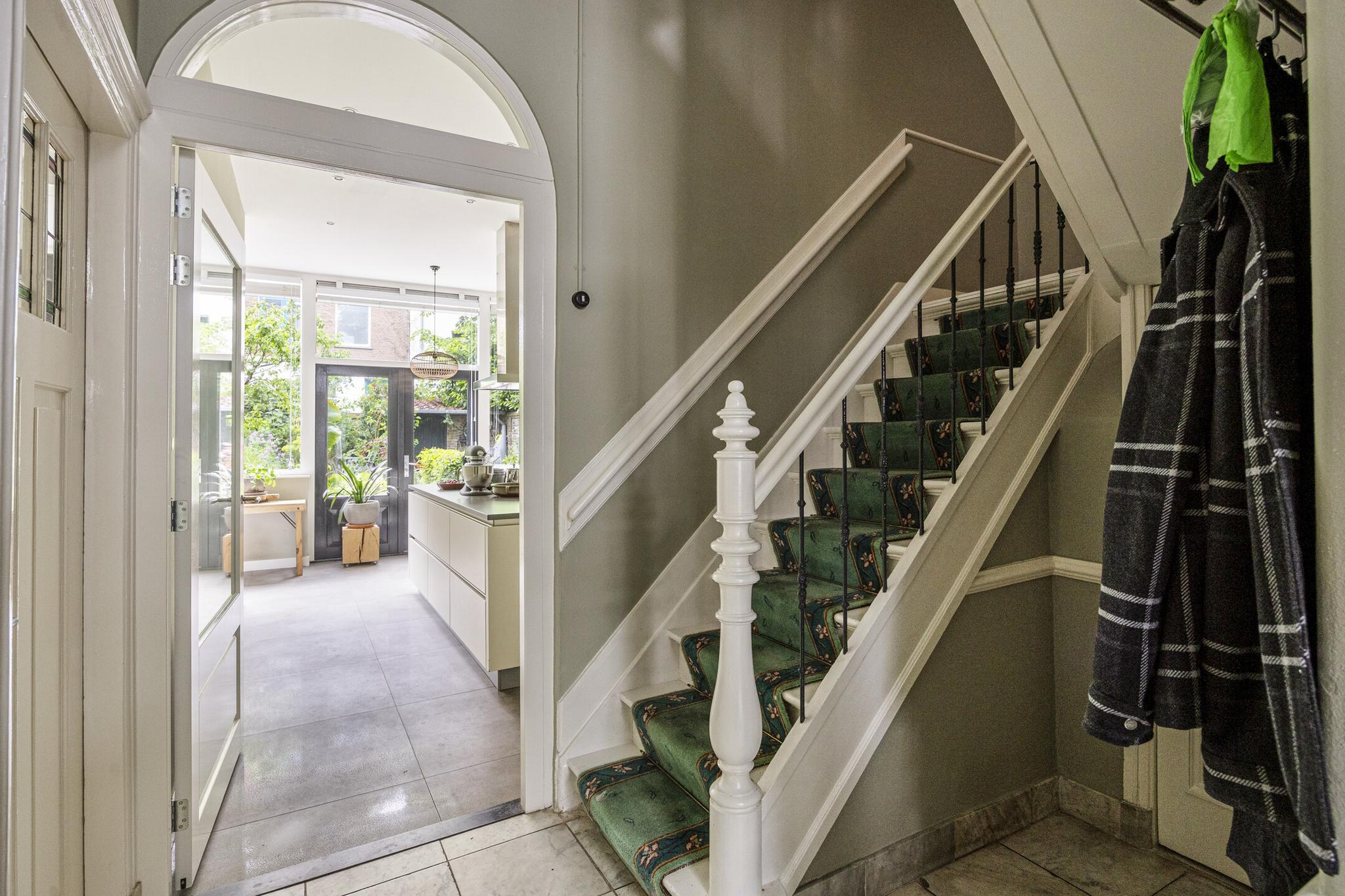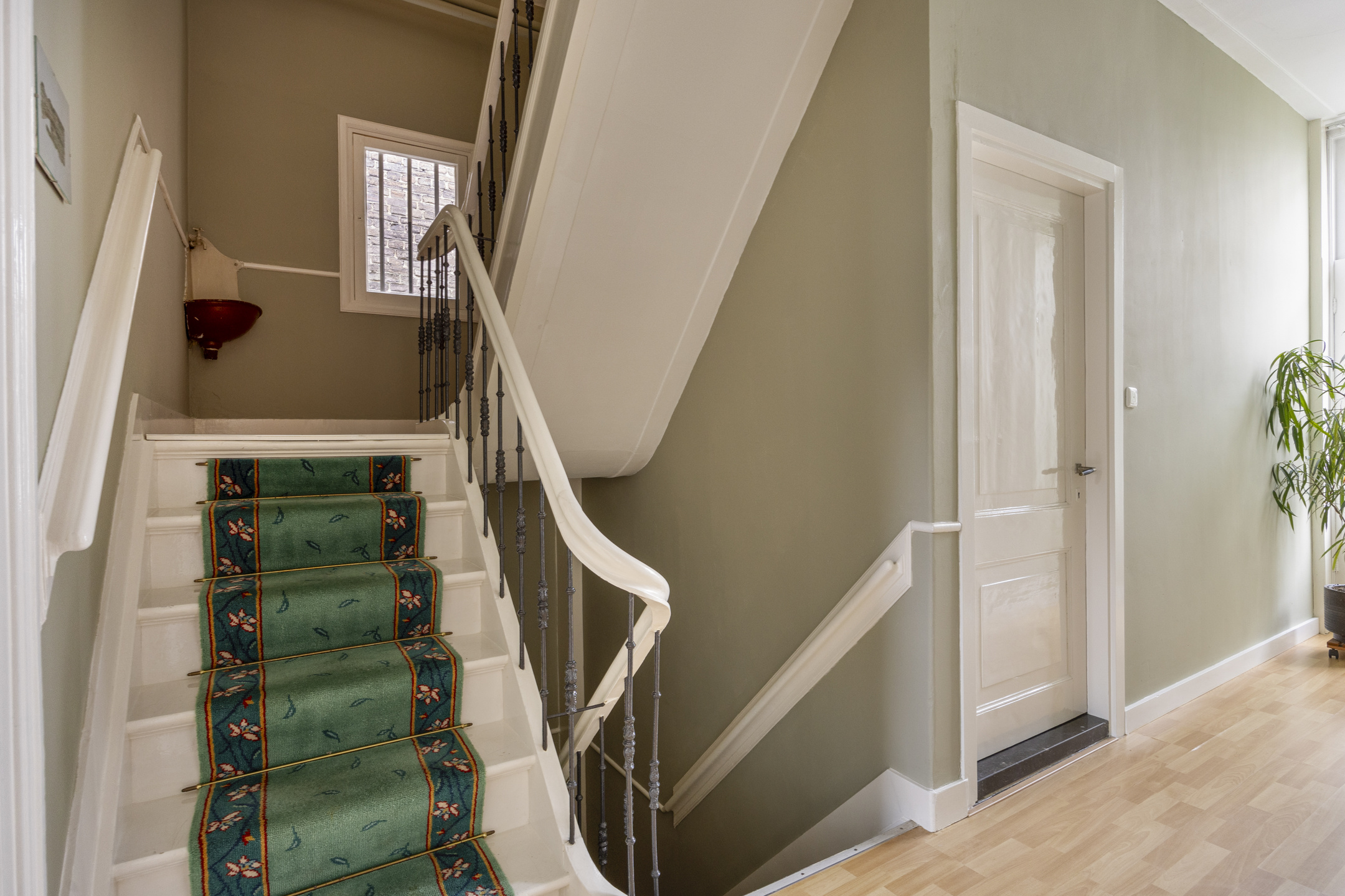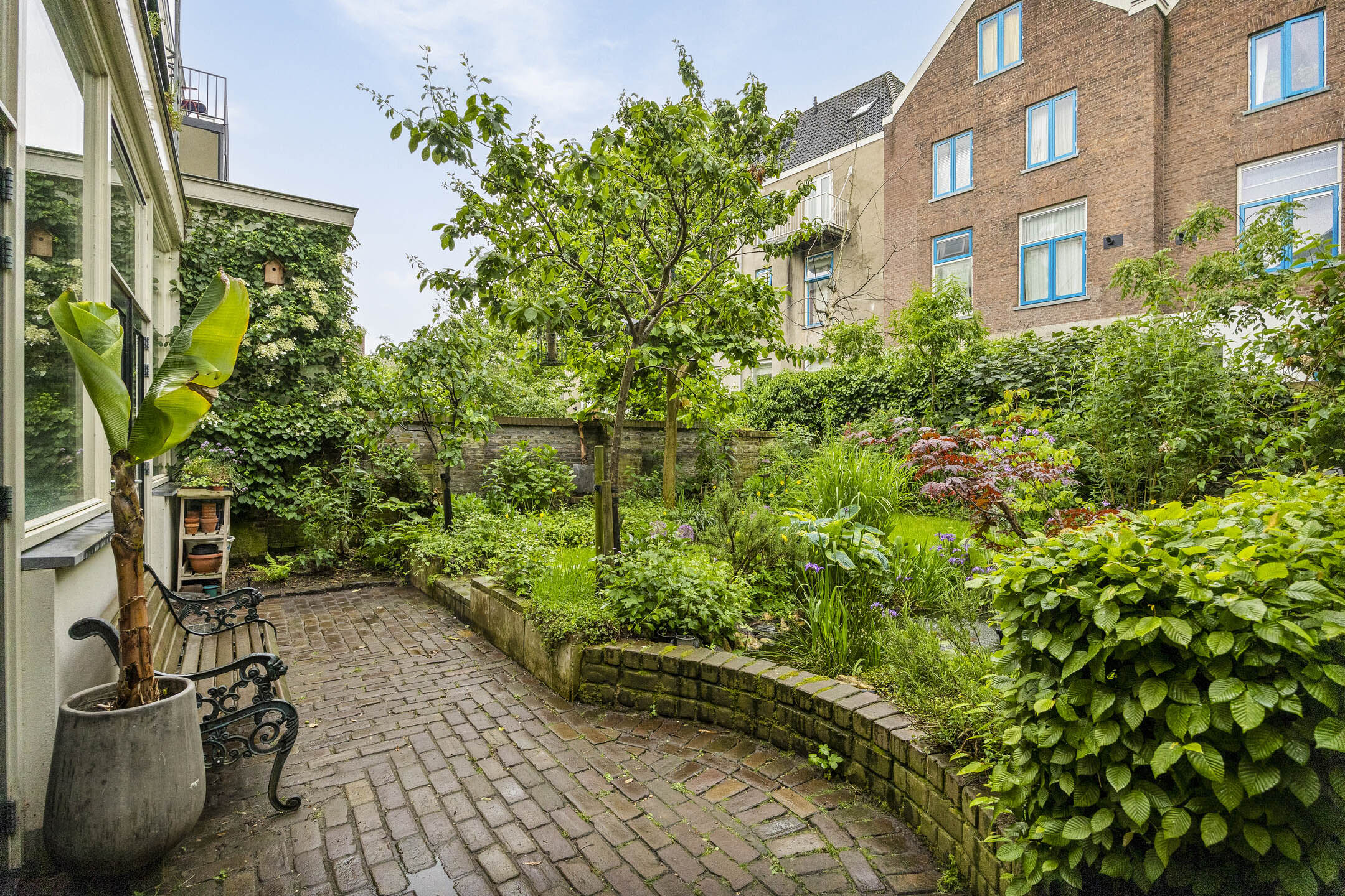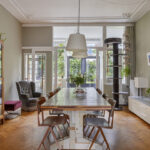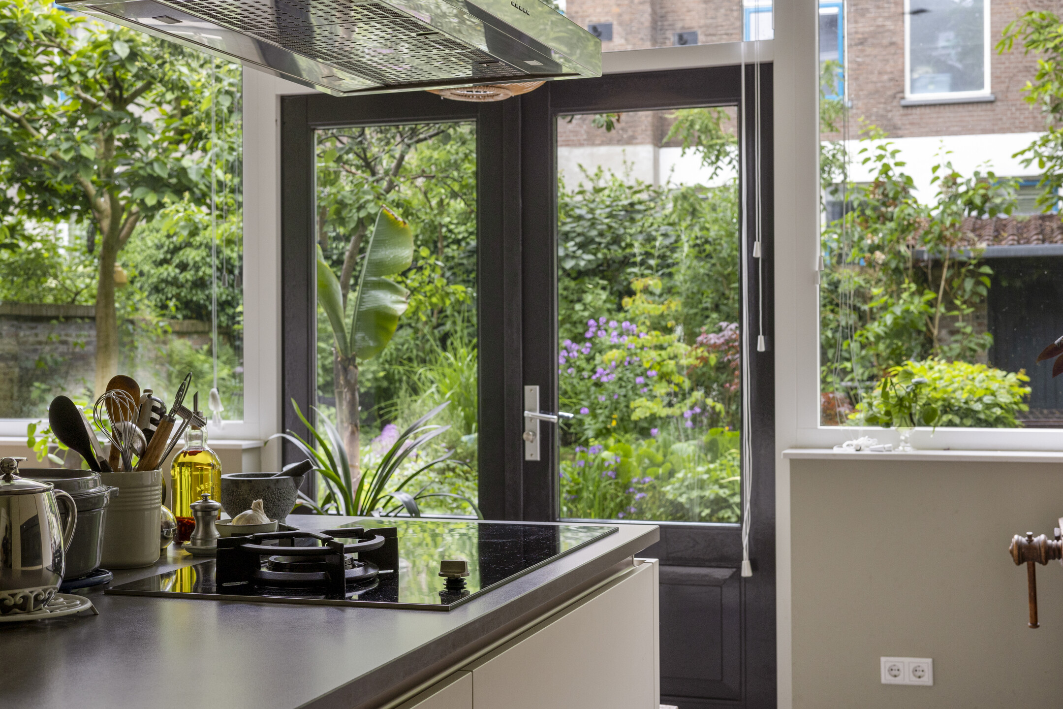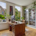 Beletage; Vestibule en gang met marmeren vloer afkomstig uit het Rijksmuseum, originele ornamenten stucplafond en een toilet met authentieke betegeling en fonteintje. Multifunctionele zijkamer (voormalig wachtkamer) is nu in gebruik als berging met wasmachine en droger. Riante kamer- en suite met hoge paneelschuifdeuren. Aangebouwde serrekamer (ruim 20 m2) met dubbele openslaande deuren naar de tuin. Moderne luxe woonkeuken met fraaie design keuken inrichting en een spoel/kookeiland met Quooker en ATAG inductiekookplaat/wokbrander. Fraaie kastenwand met uitgebreide inbouwapparatuur van Miele en Liebherr. Openslaande deuren naar de tuin.