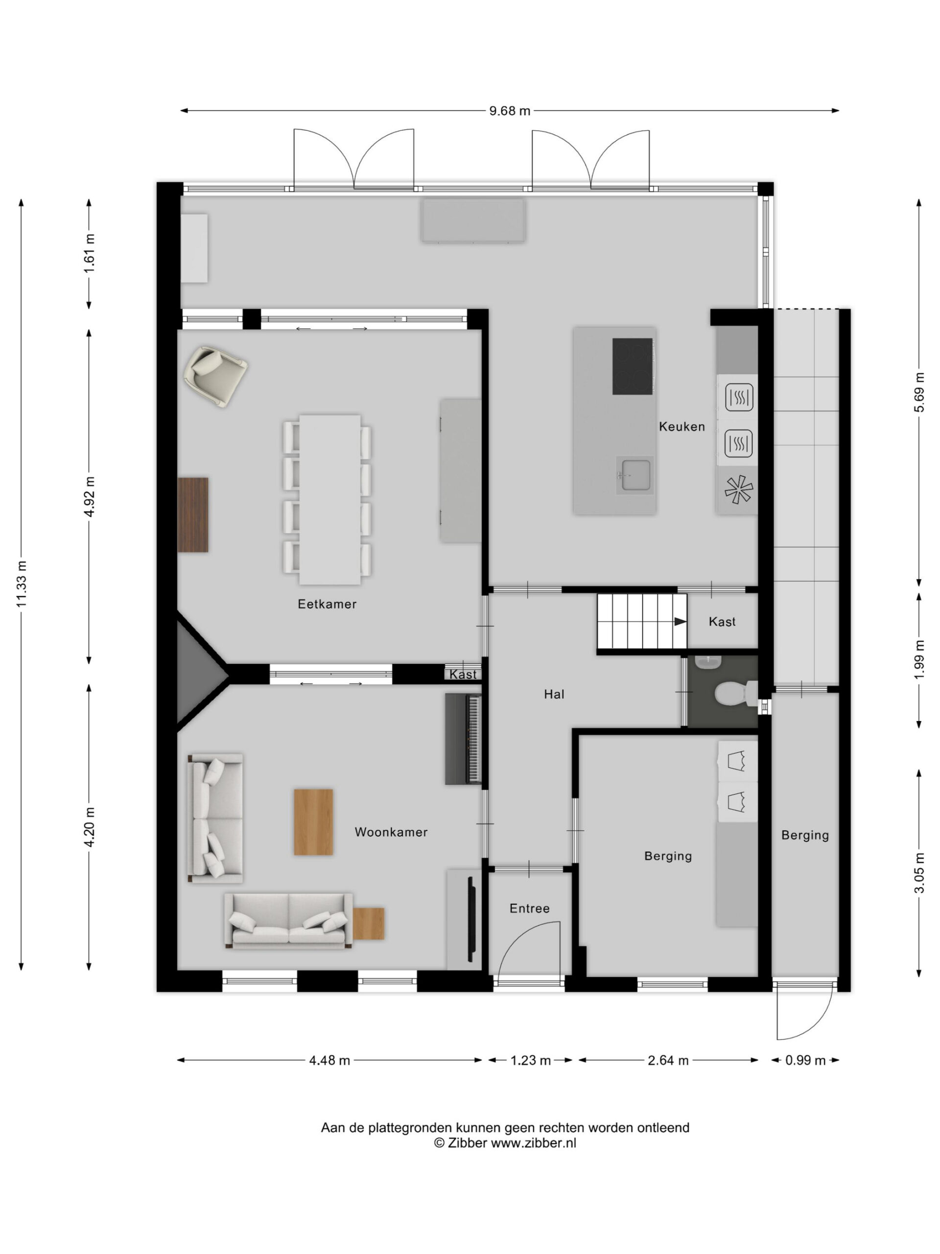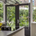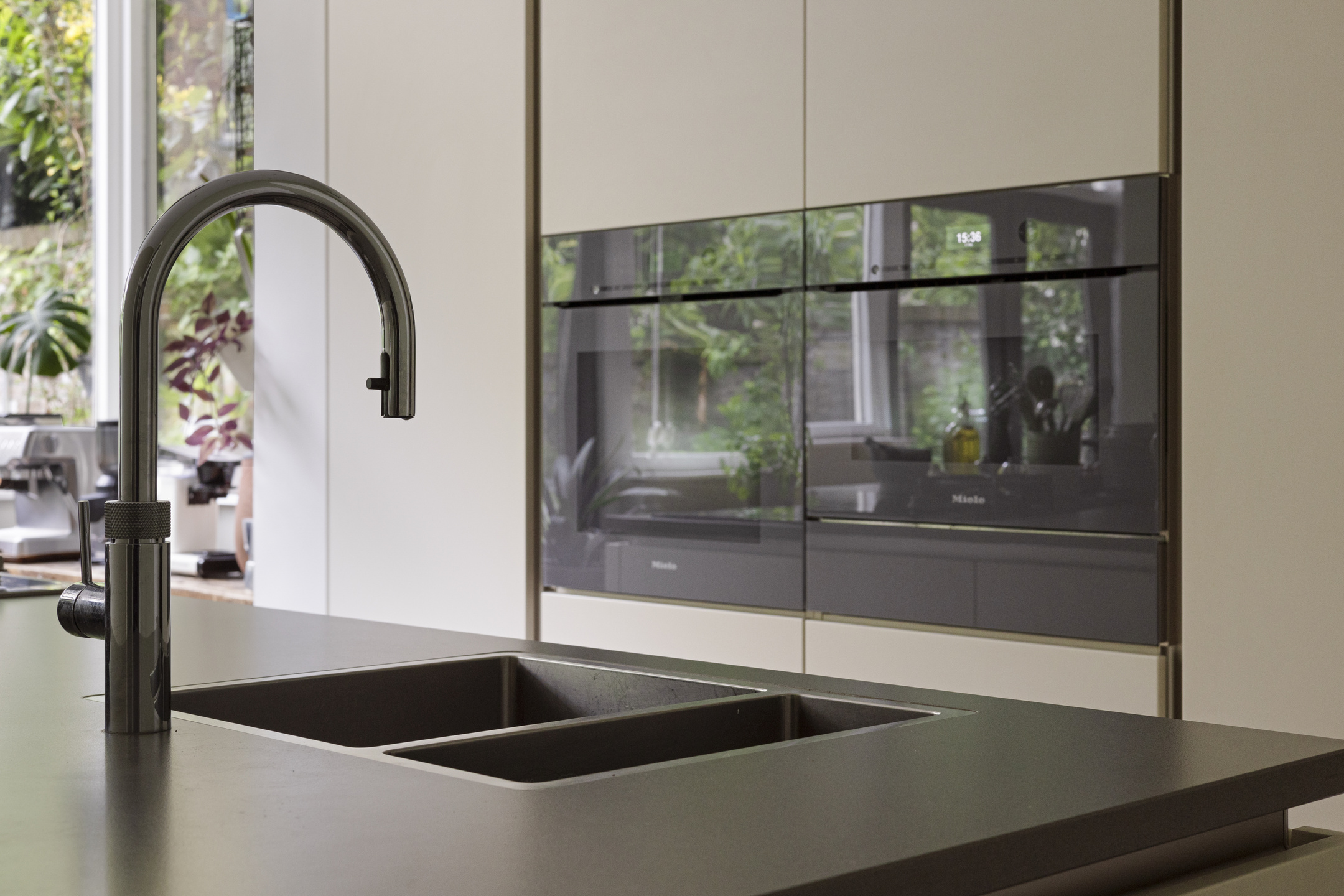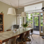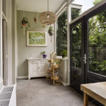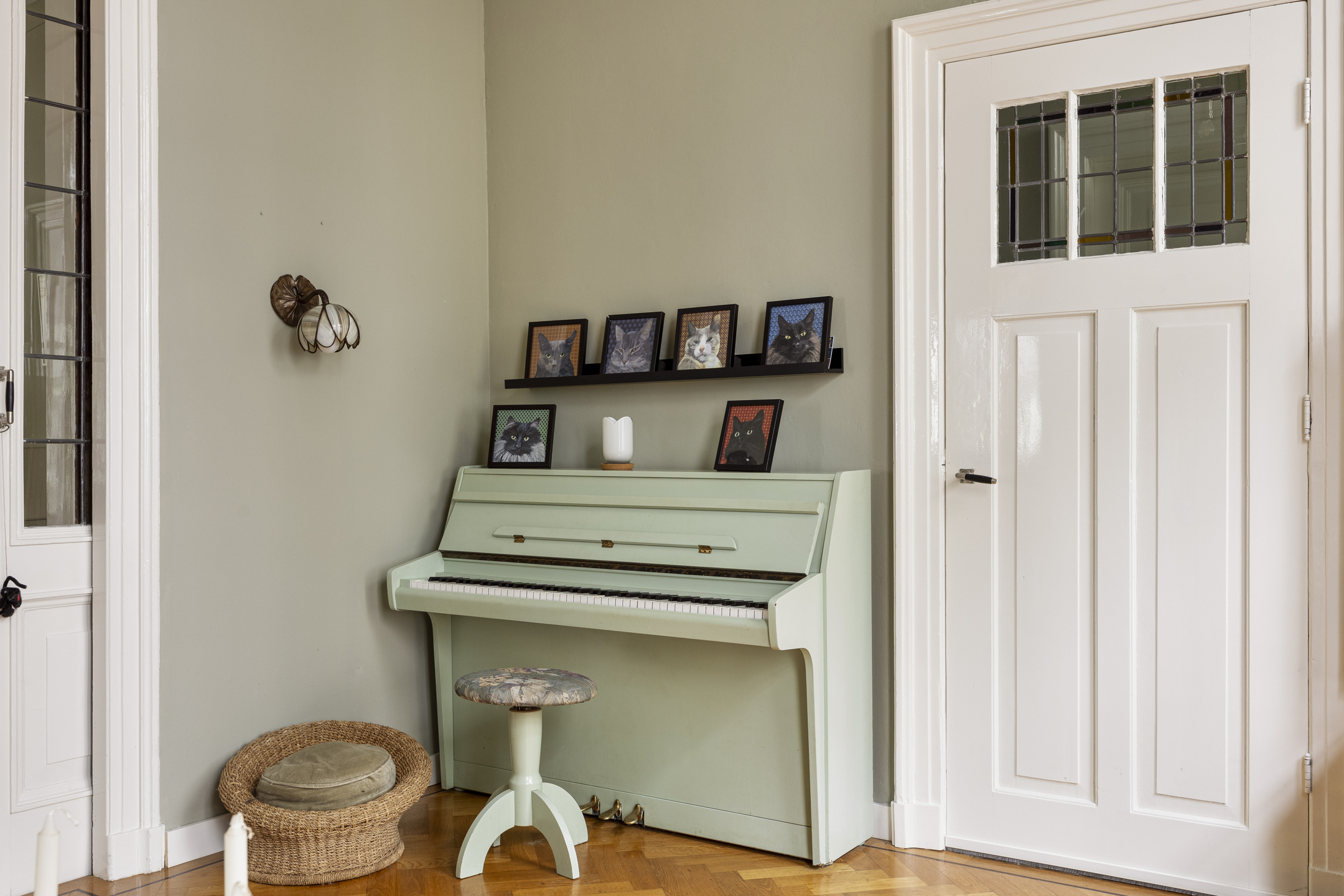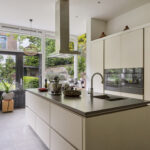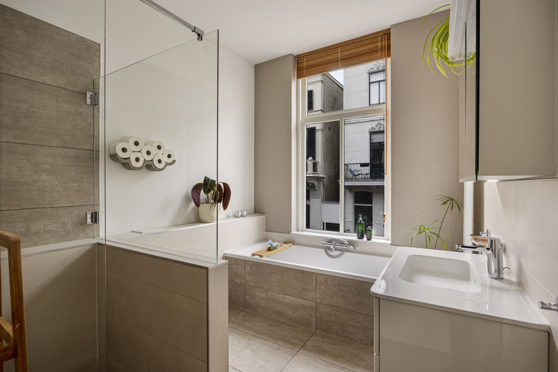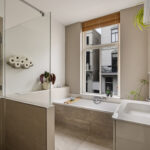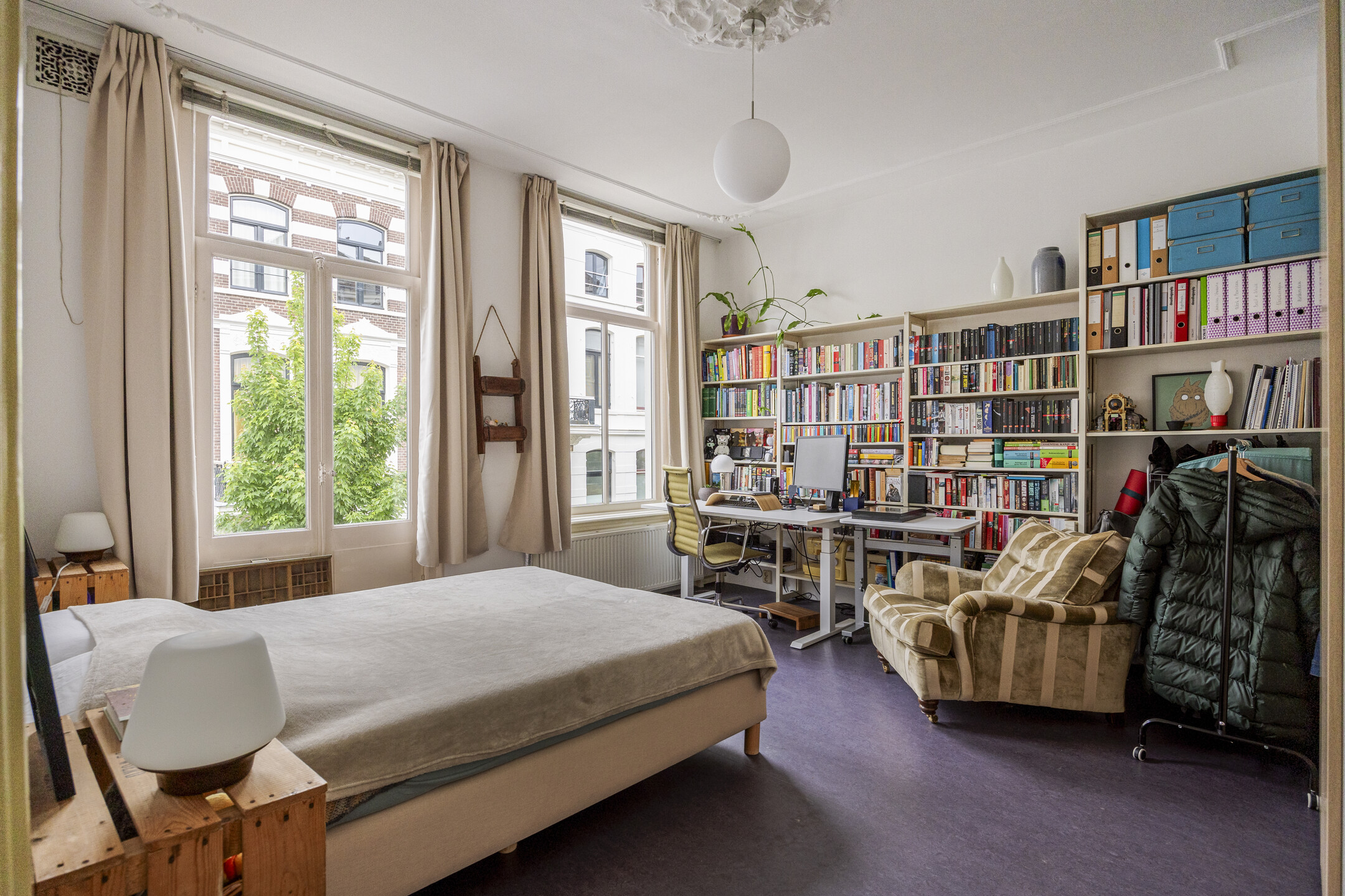 Beletage; Vestibule en gang met marmeren vloer afkomstig uit het Rijksmuseum, originele ornamenten stucplafond en een toilet met authentieke betegeling en fonteintje. Multifunctionele zijkamer (voormalig wachtkamer) is nu in gebruik als berging met wasmachine en droger. Riante kamer- en suite met hoge paneelschuifdeuren. Aangebouwde serrekamer (ruim 20 m2) met dubbele openslaande deuren naar de tuin. Moderne luxe woonkeuken met fraaie design keuken inrichting en een spoel/kookeiland met Quooker en ATAG inductiekookplaat/wokbrander. Fraaie kastenwand met uitgebreide inbouwapparatuur van Miele en Liebherr. Openslaande deuren naar de tuin.